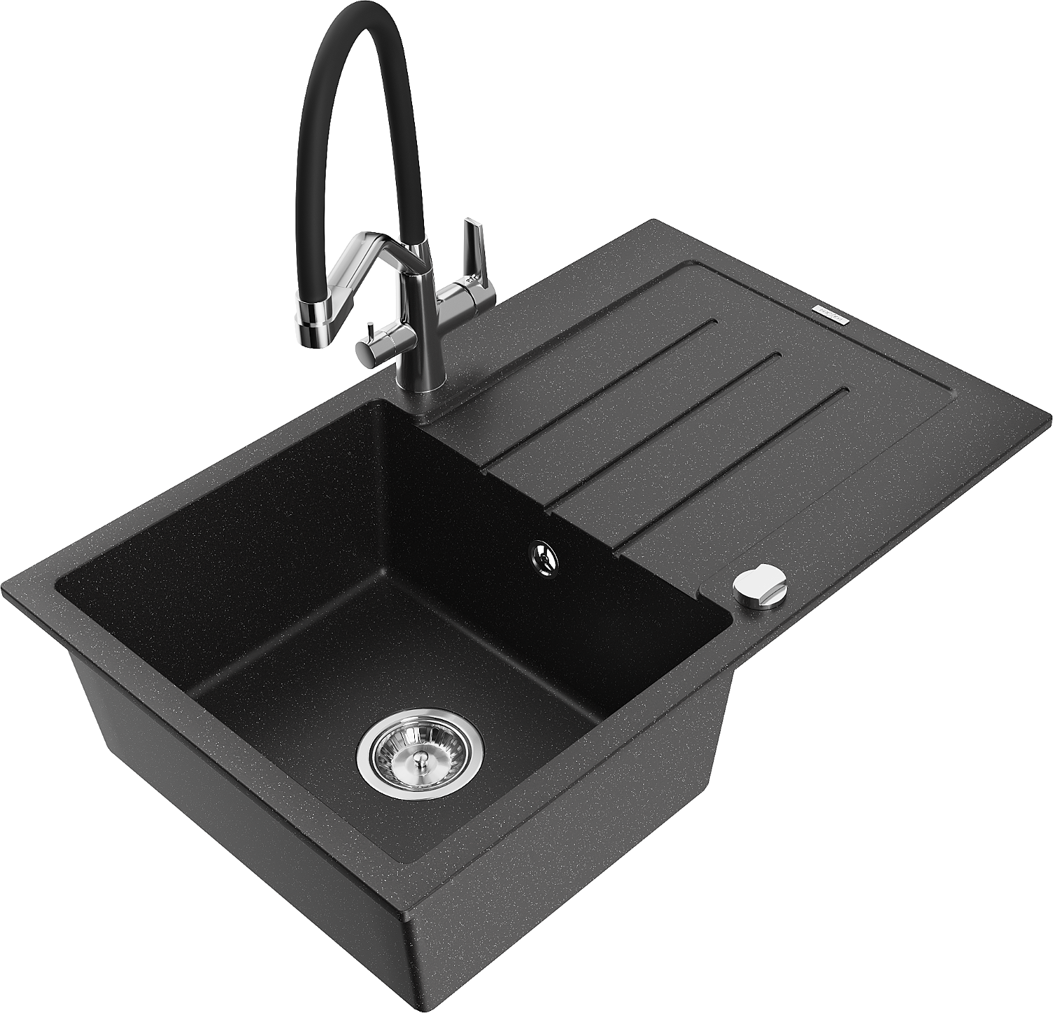 Mexen Bruno granitový kuchynský drez 1-komorový s odkvapkávačom a kuchynskou batériou Duo, čierny/strieborný metalický - 6513-7?