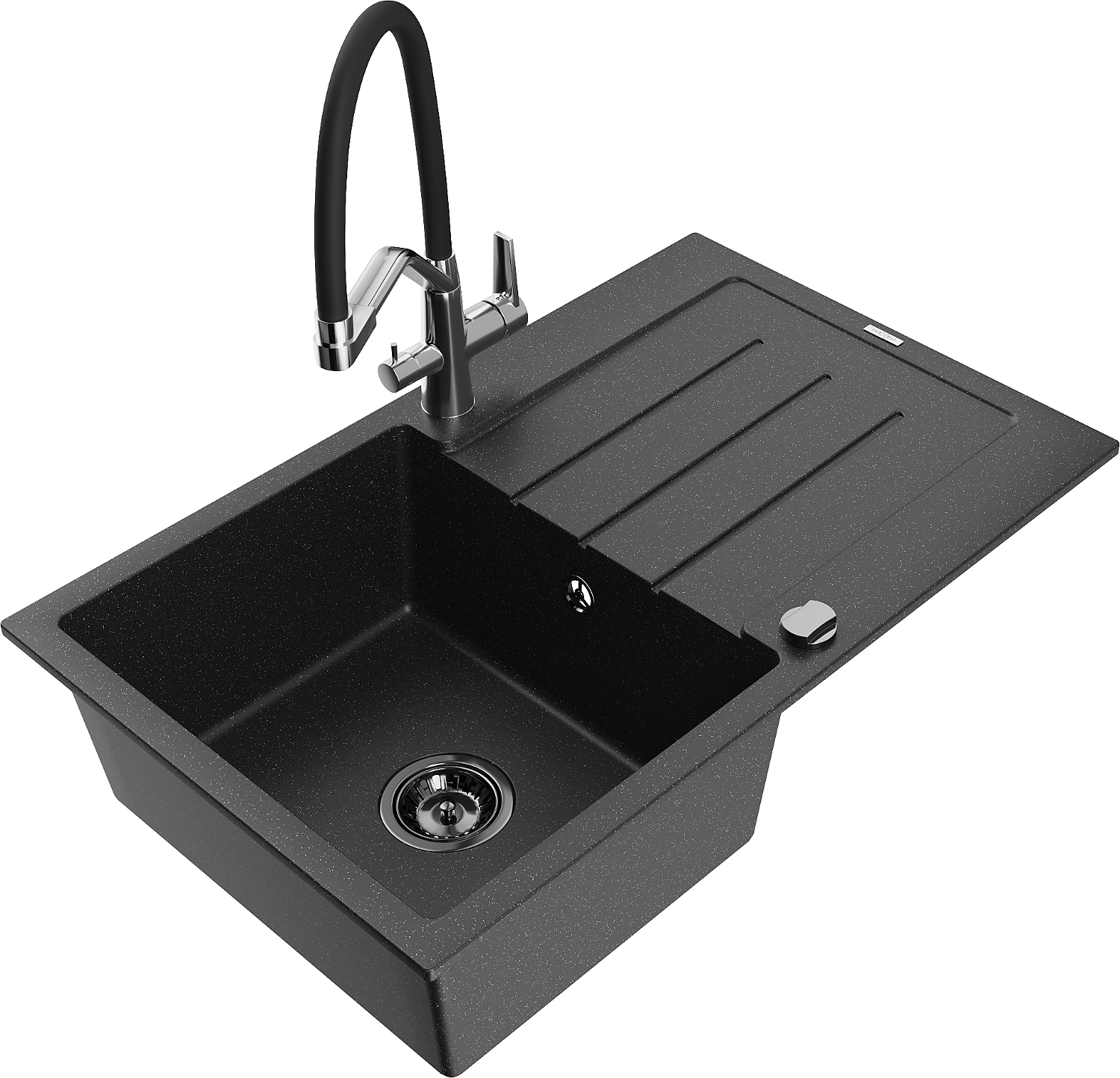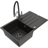 Mexen Bruno granitový drez s 1 komorou so stiekacou plochou a kuchynskou batériou Duo, čierny/strieborný metalický
