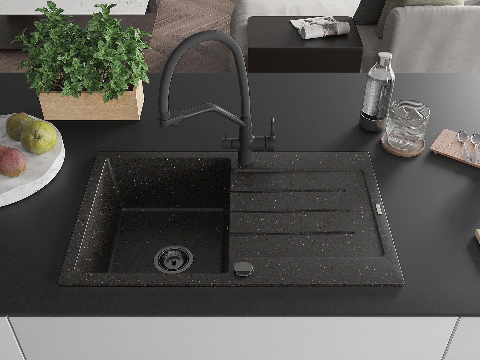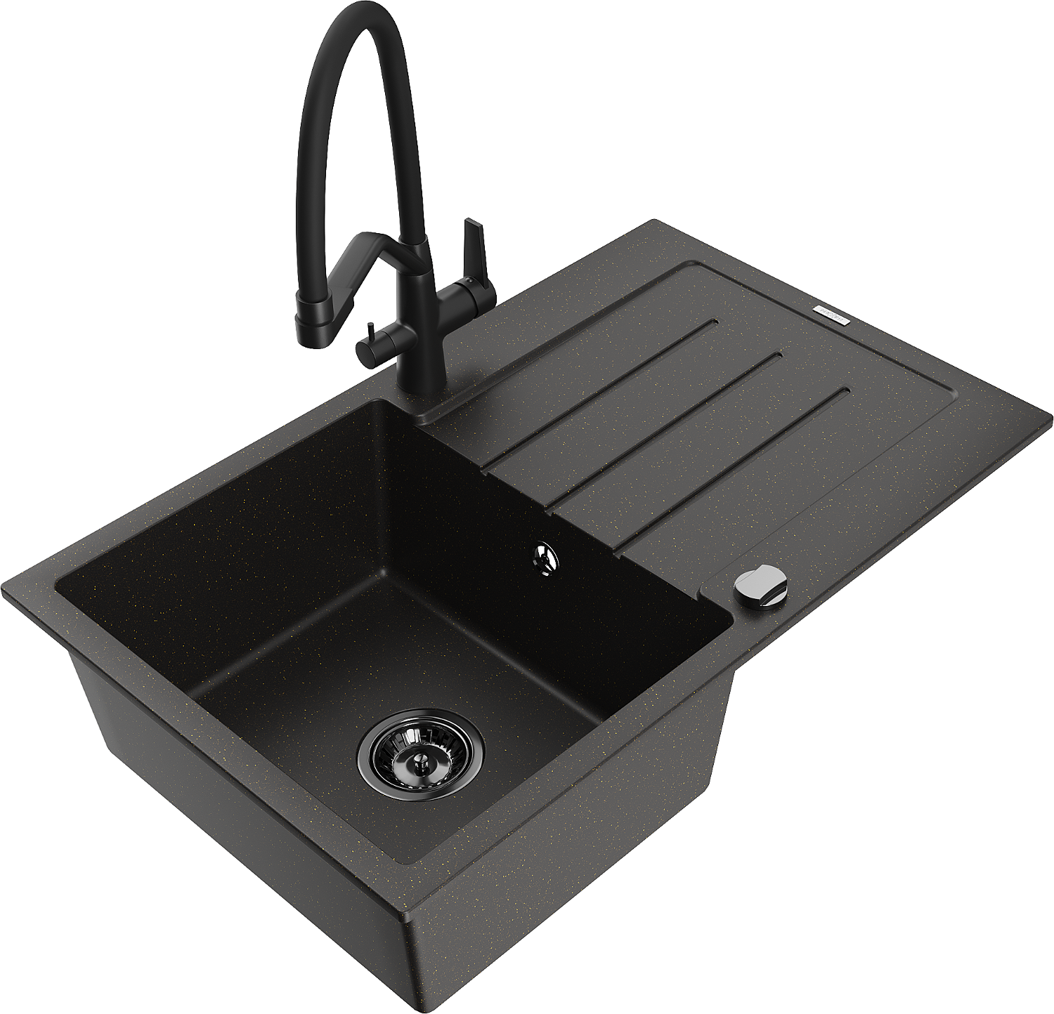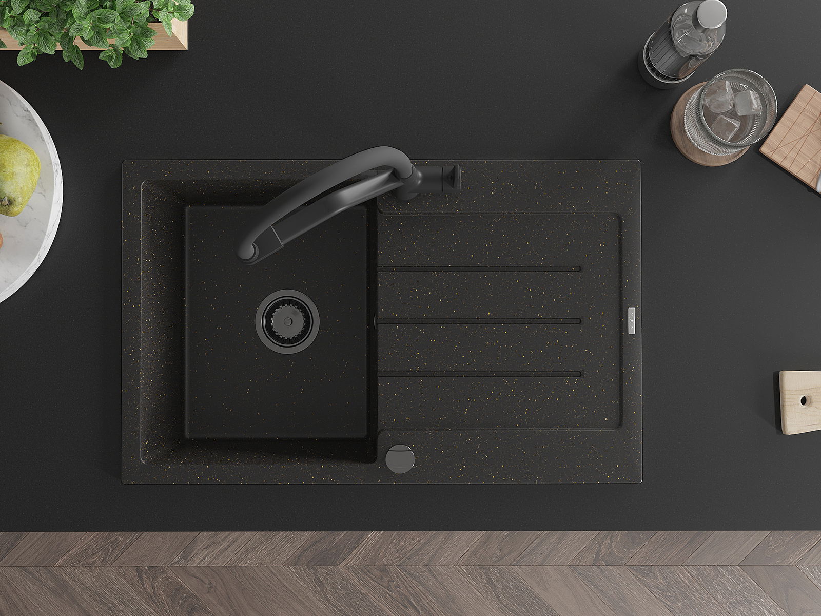 Mexen Bruno žulový drez s jednou komorou s odkvapkávačom a kuchynskou batériou Duo, čierny/zlatý metalický