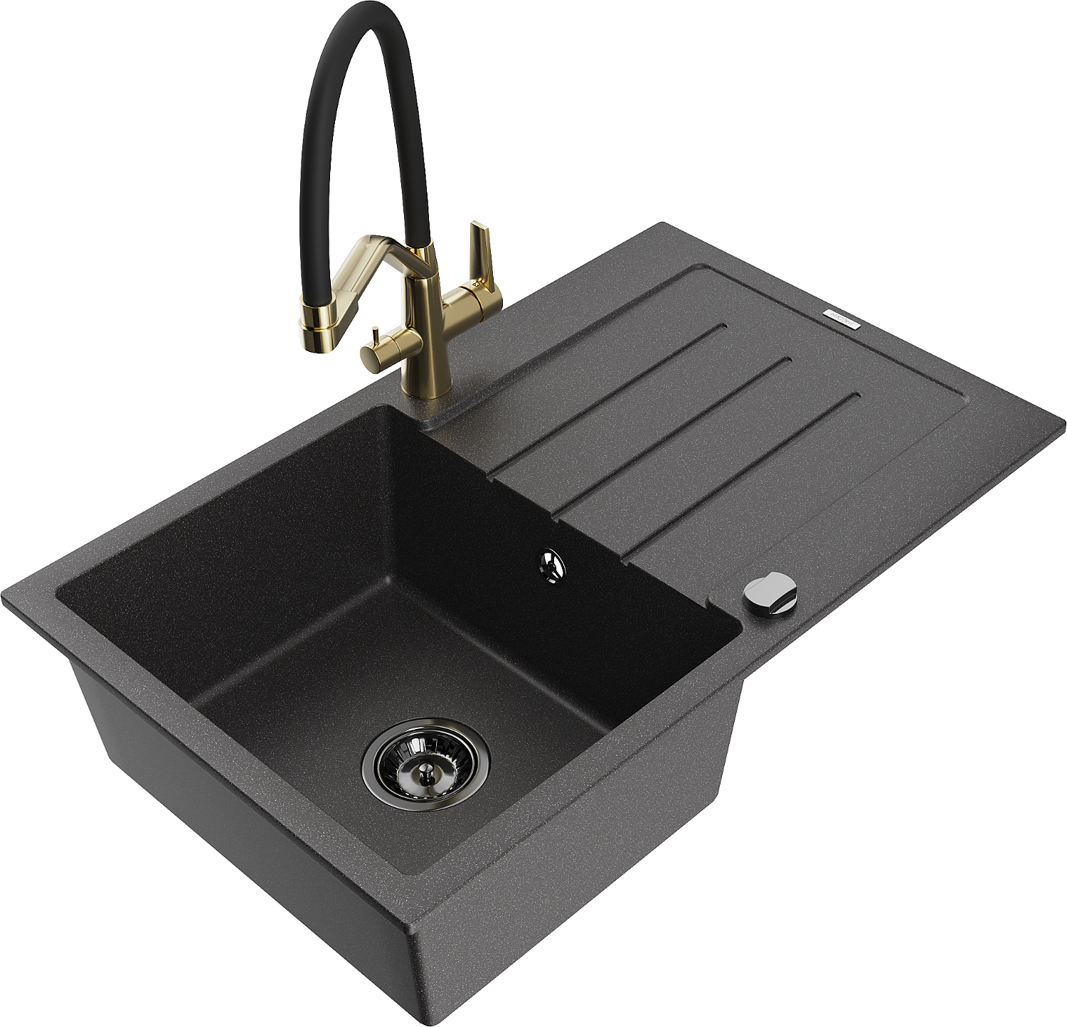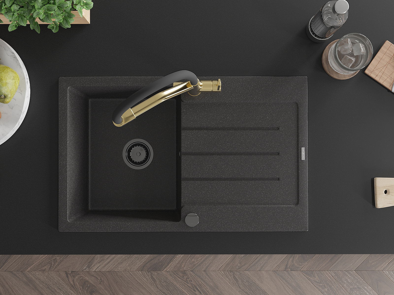 Mexen Bruno jednokomorový žulový drez s odkvapkávačom a kuchynskou batériou Duo, čierny škvrnitý - 6513-76-671701-57-B
