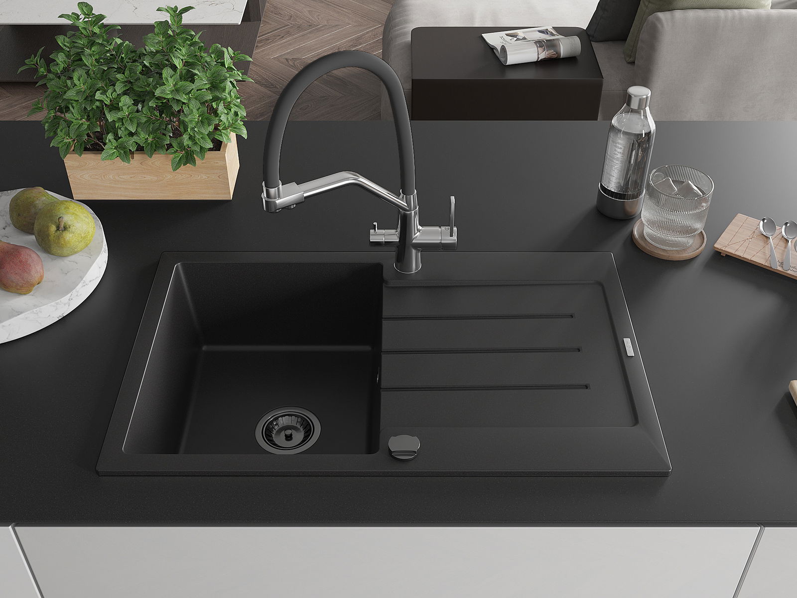 Mexen Bruno jednokomorový granitový drez s odkvapkávačom a kuchynskou batériou Duo, čierny - 6513-77-671701-07-B