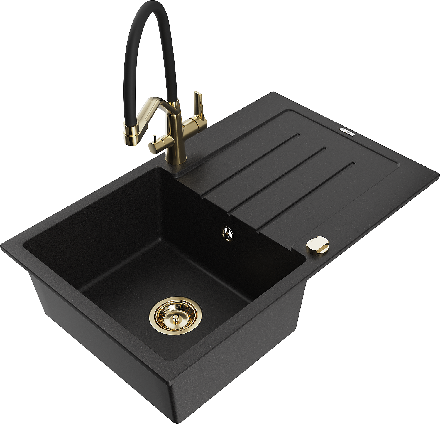 Mexen Bruno granitový drez 1-komorový s odkvapkávačom a kuchynskou batériou Duo, čierny - 6513-77-671701-57-G