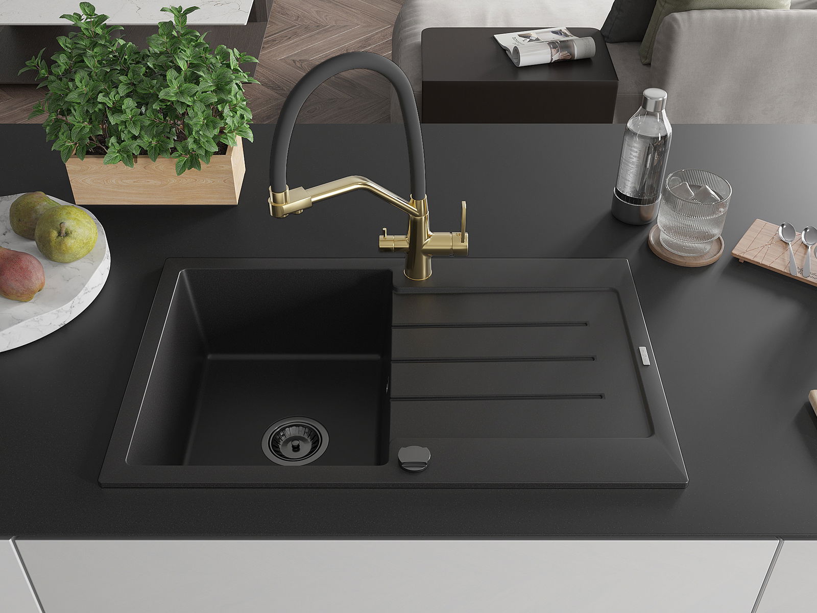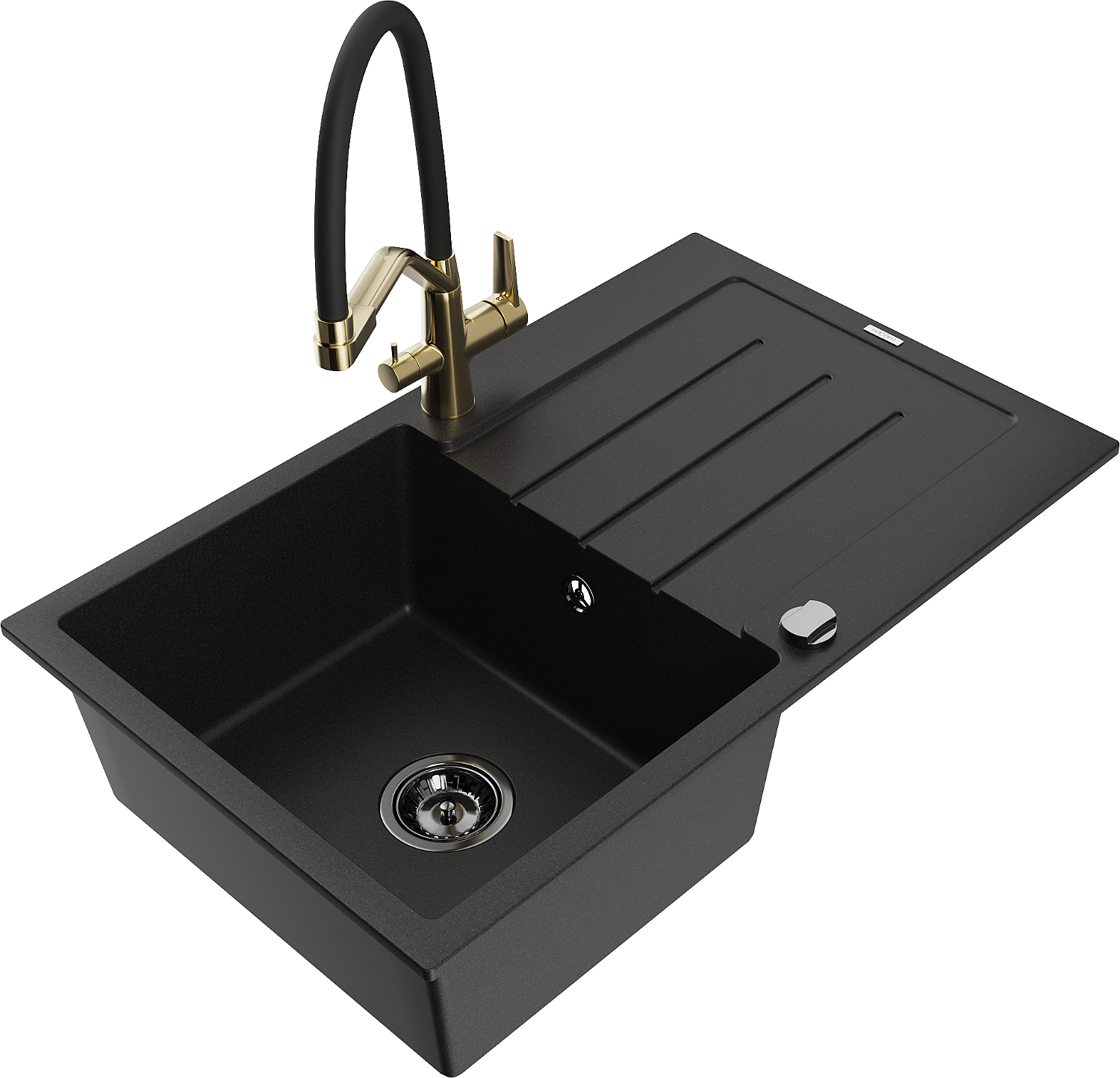 Mexen Bruno granitový kuchynský drez 1-miskový s odkvapkávačom a kuchynskou batériou Duo, čierna - 6513-77-671701-57-B