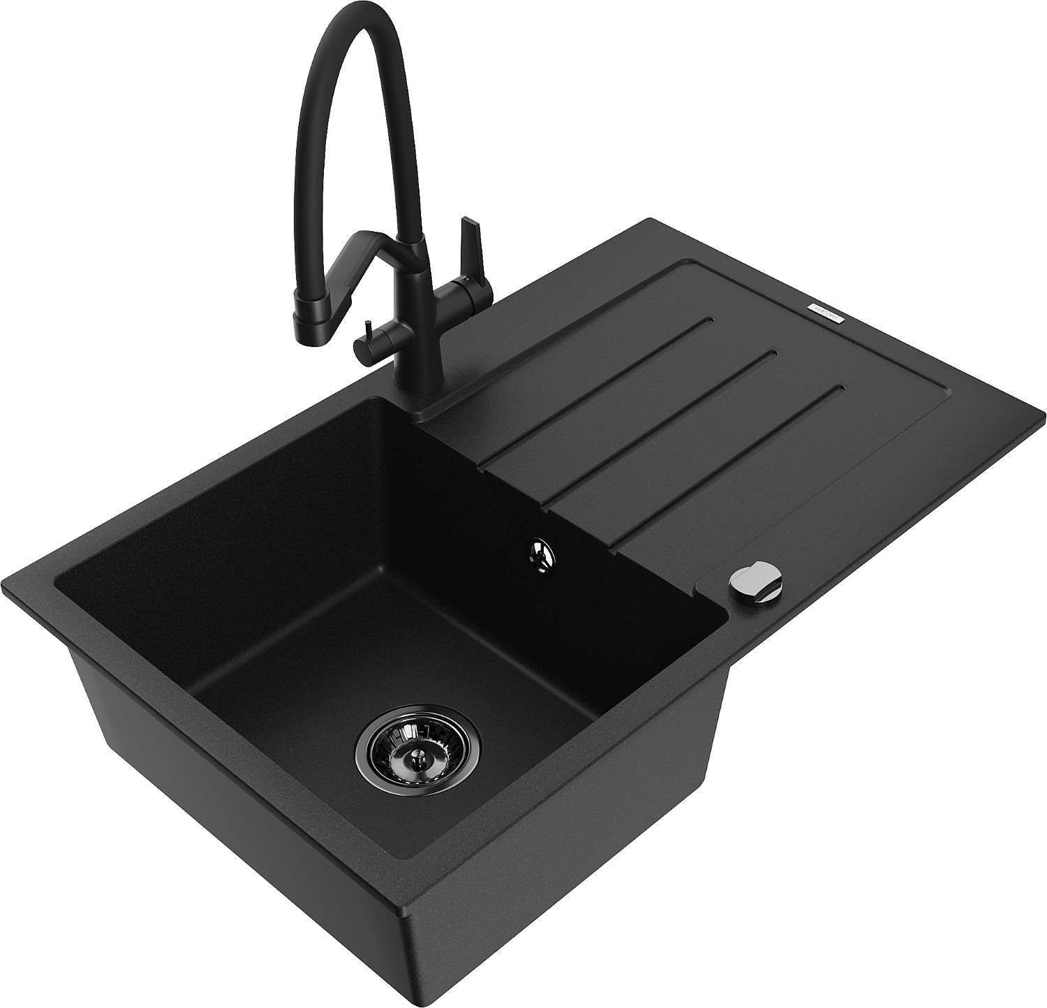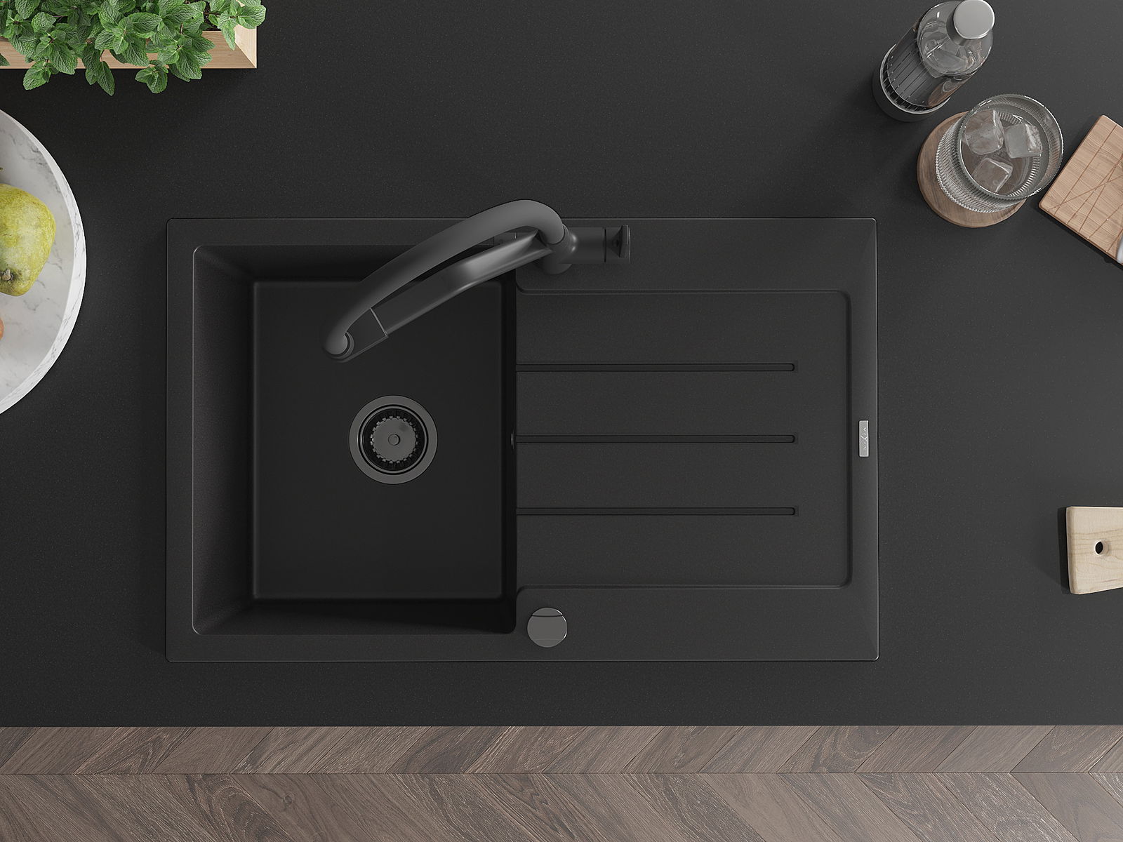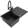 Mexen Bruno granitový kuchynský drez 1-komorový s odkvapkávačom a kuchynskou batériou Duo, čierny - 6513-77-671701-70-B