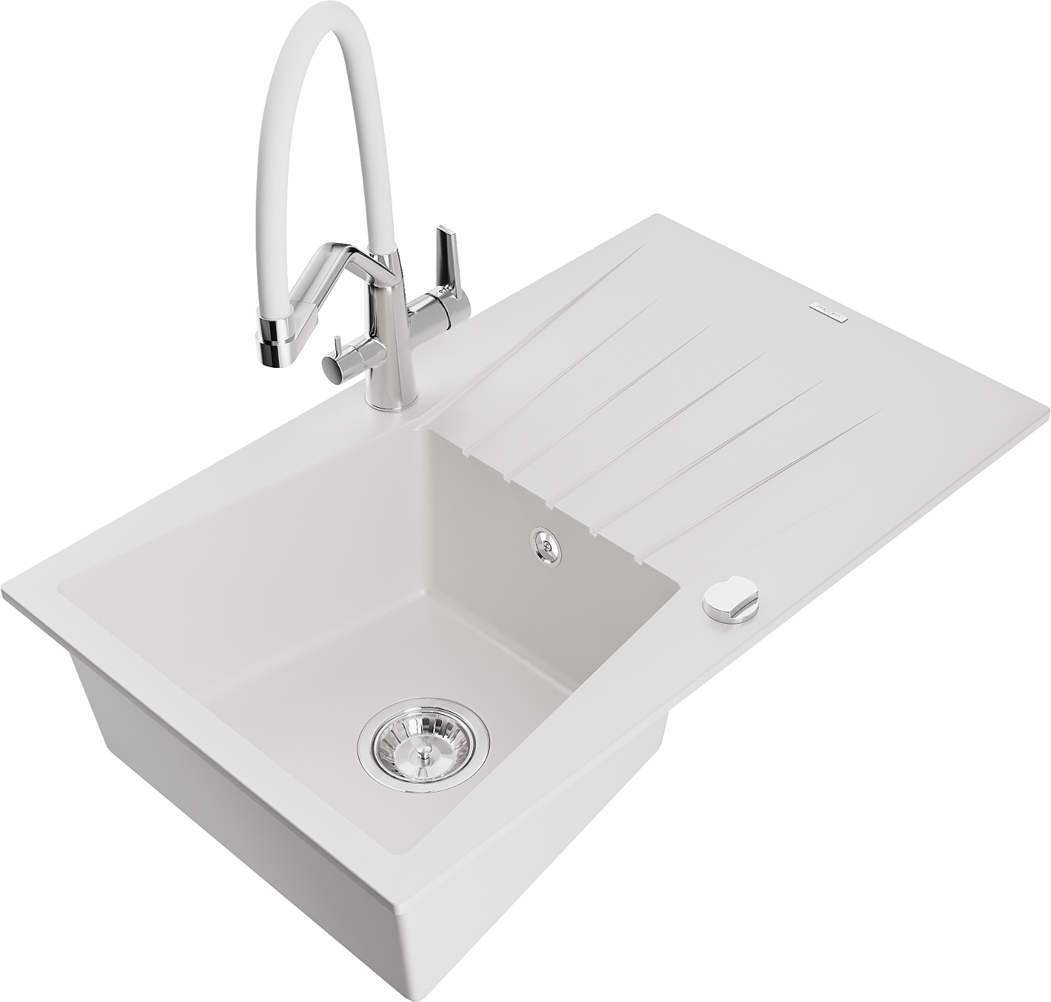 Mexen Cesar žulový drez 1-komorový s odkvapkávacou plochou a kuchynskou batériou Duo, biely - 6514-20-671701-02
