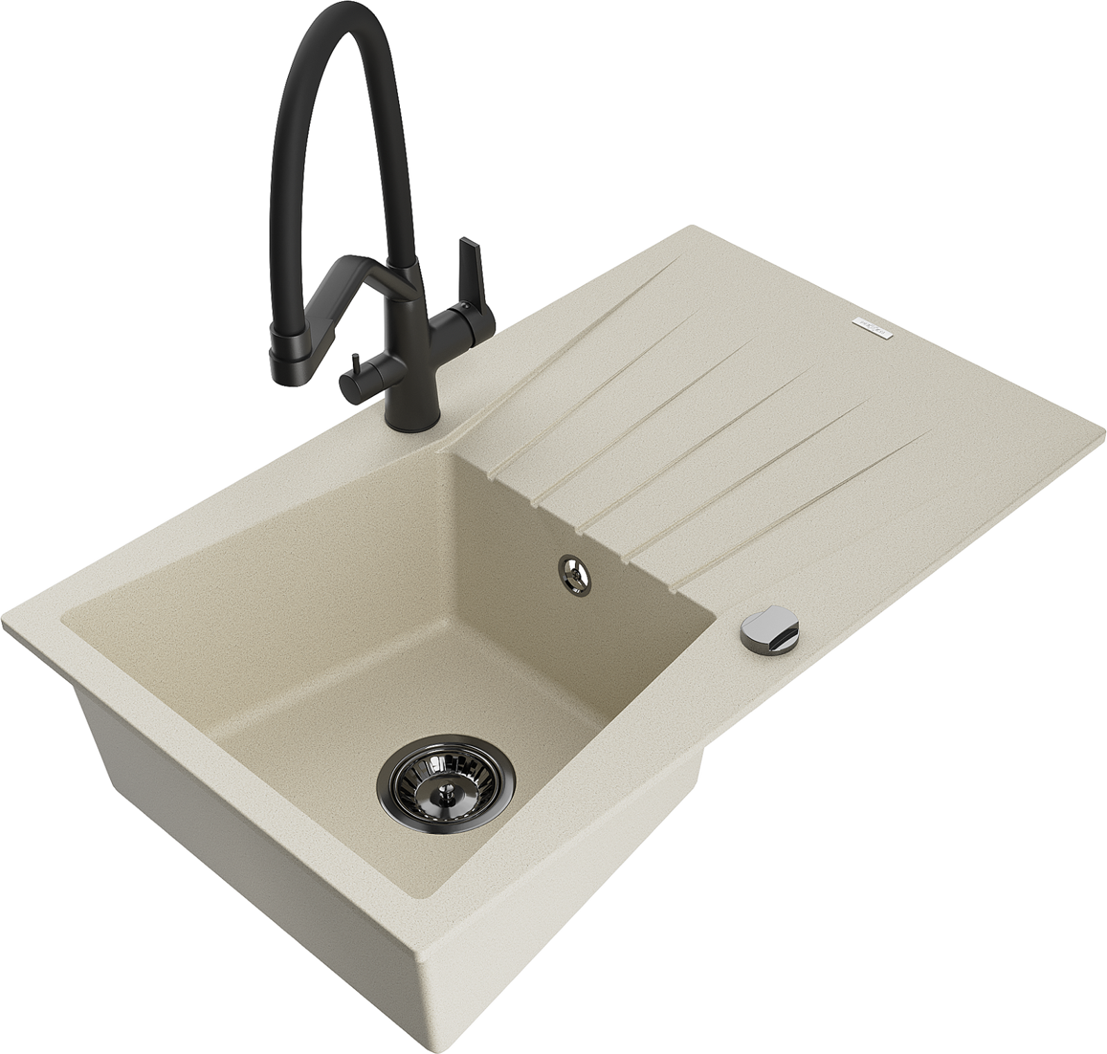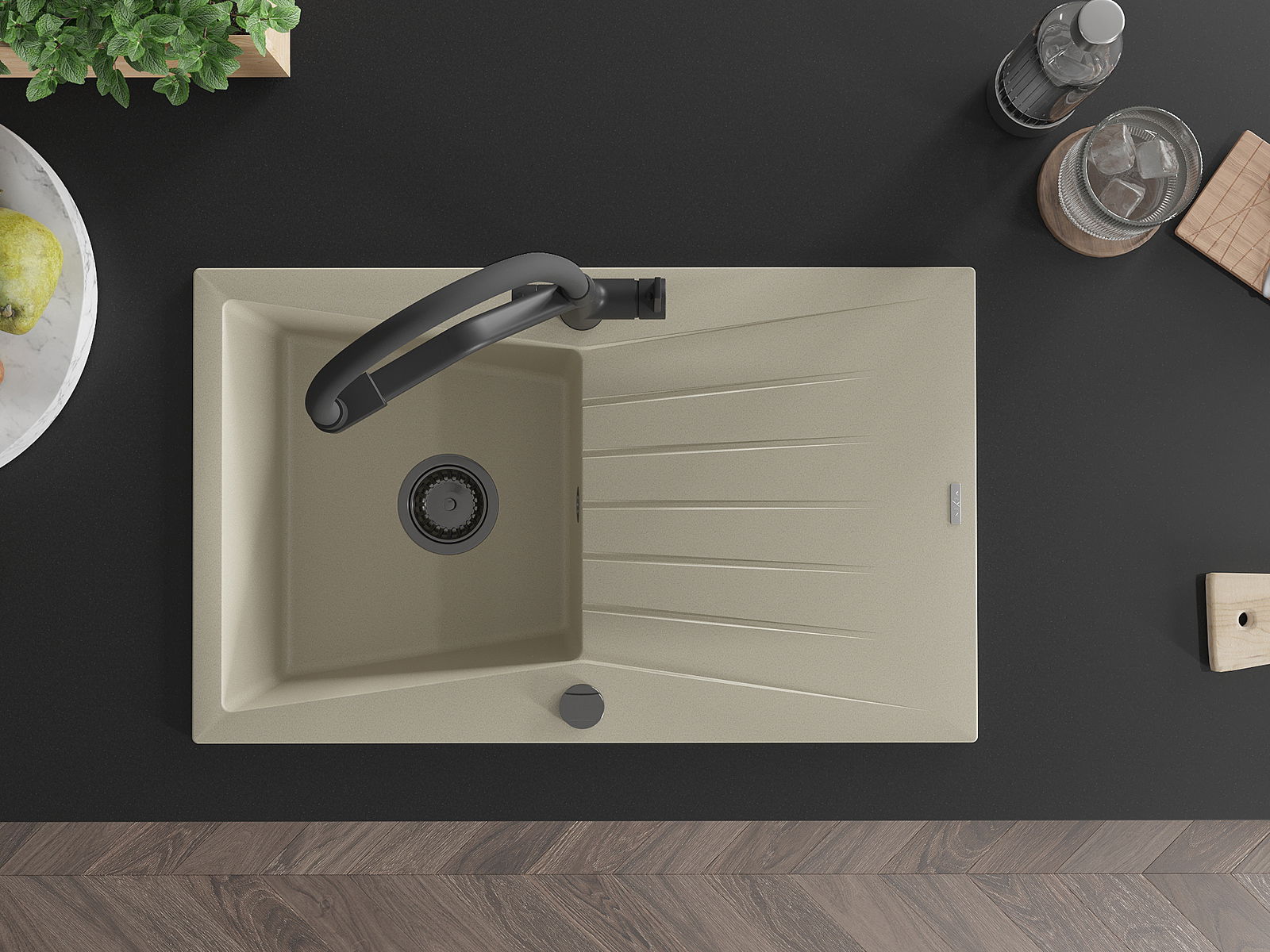 Mexen Cesar žulový drez 1-komorový s odkvapkávačom a kuchynskou batériou Duo, béžový - 6514-69-671701-70-B