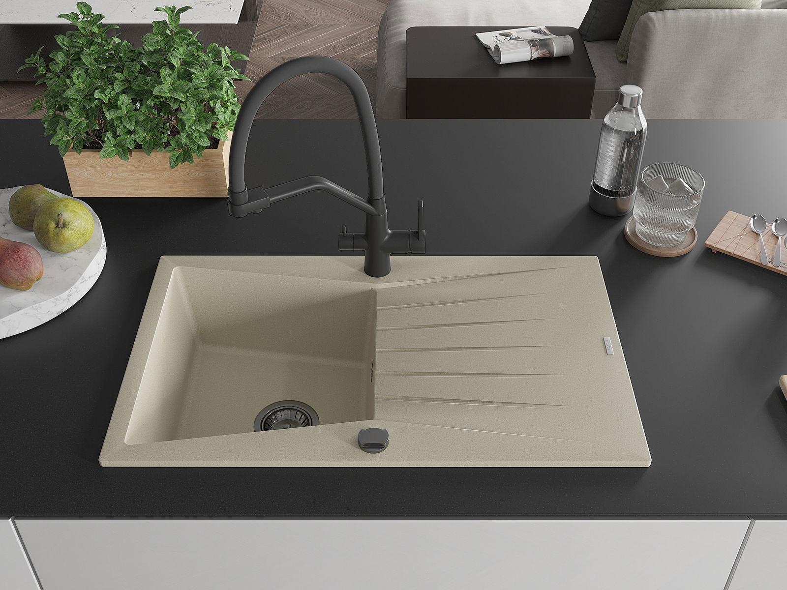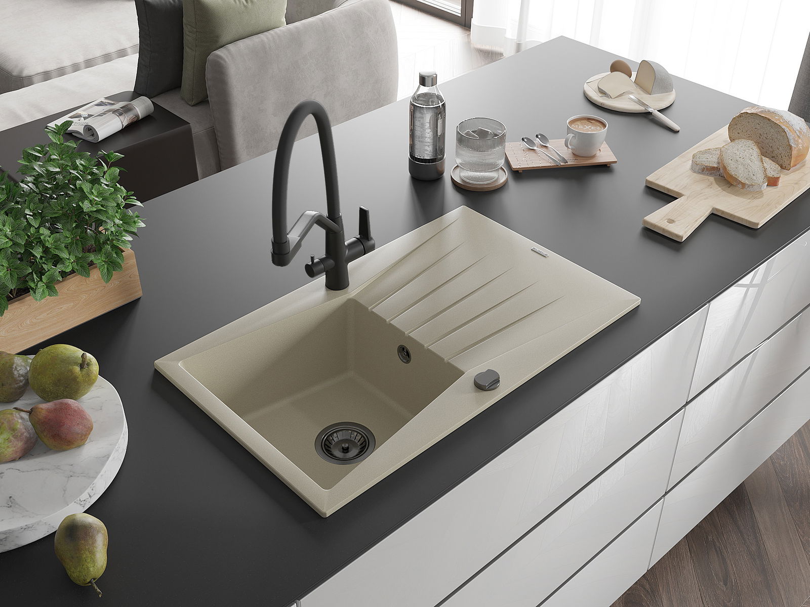 Povrch kuchynského drezu je odolný voči škvrnám a zafarbeniu, vďaka čomu sa ľahko udržiava a zachováva svoju farbu počas dlhého obdobia používania. Estetický a praktický doplnok pre každú kuchyňu.