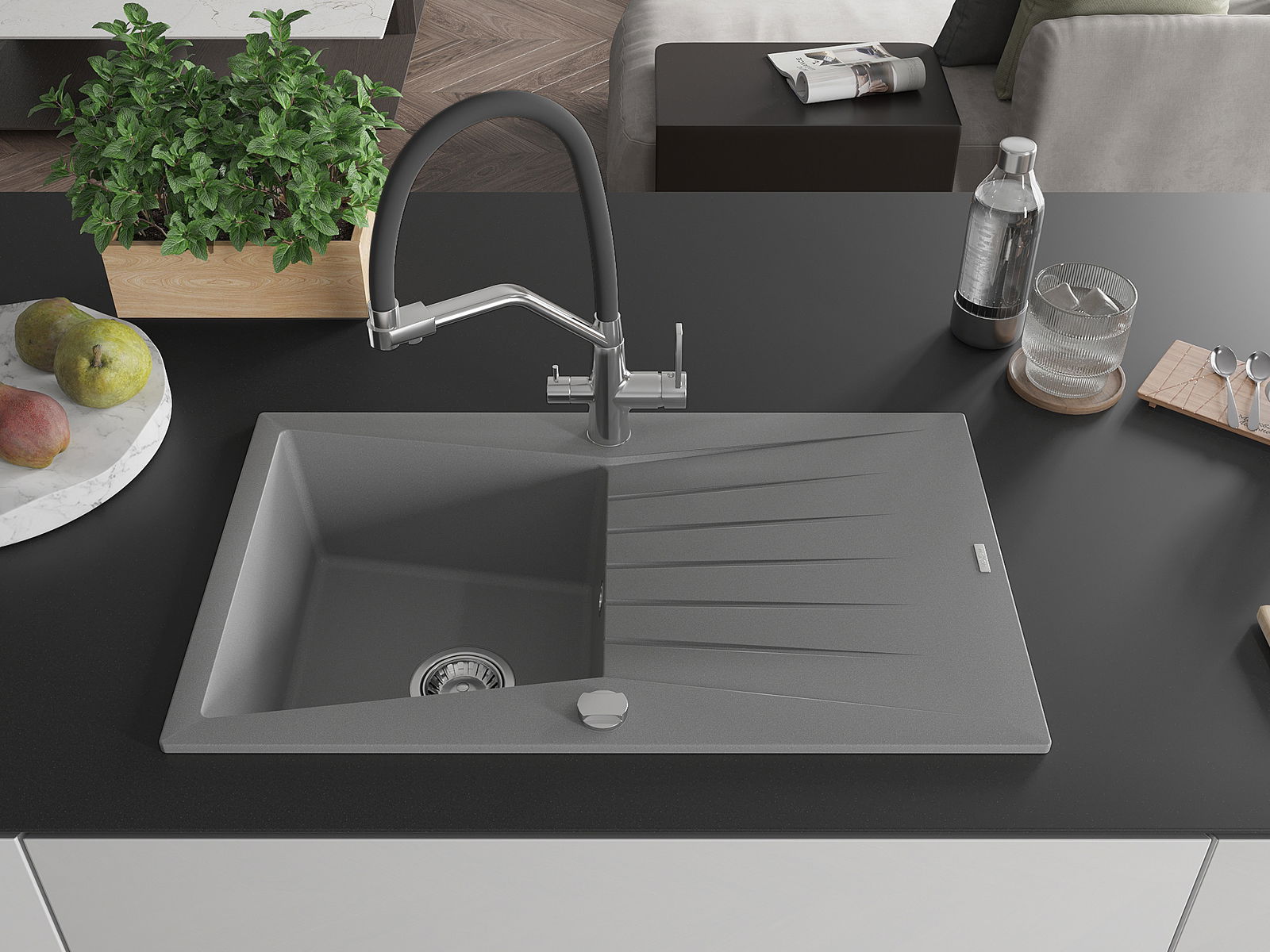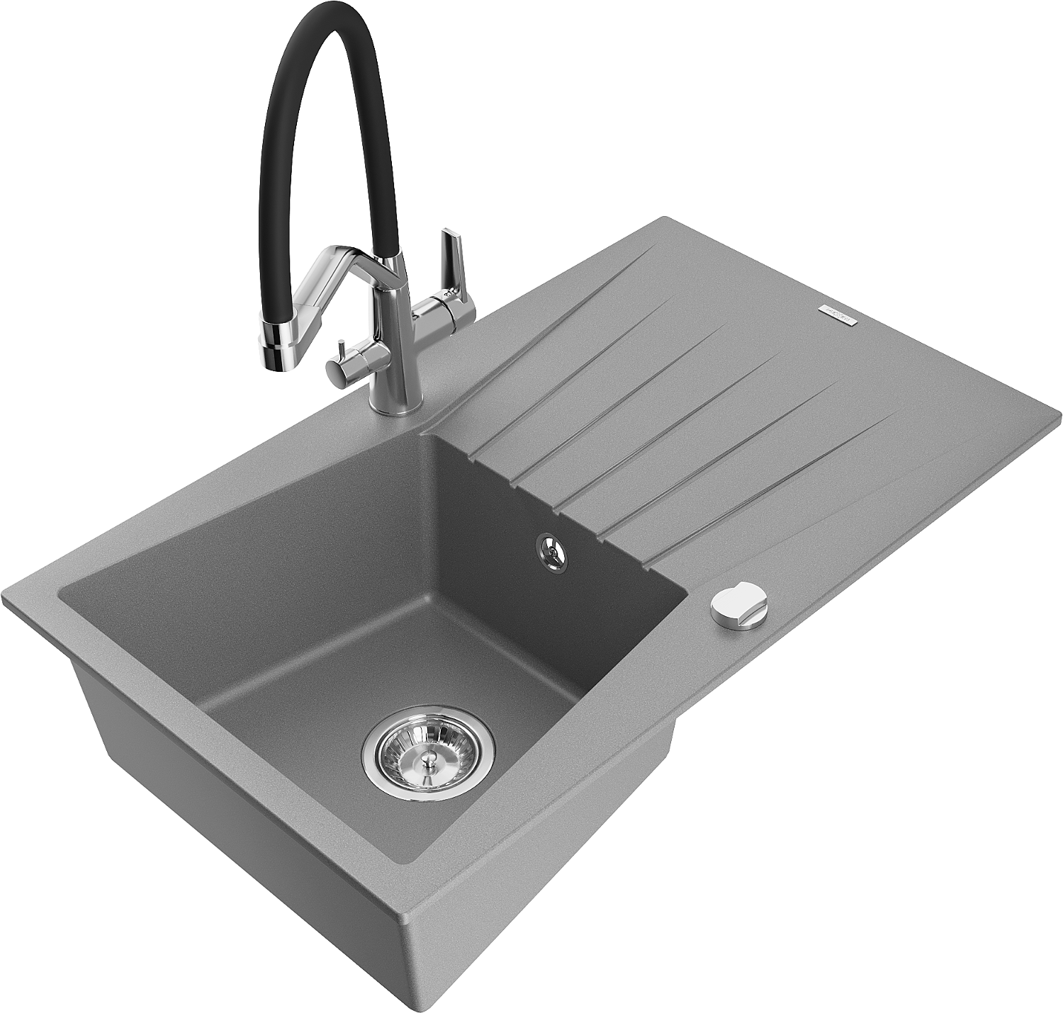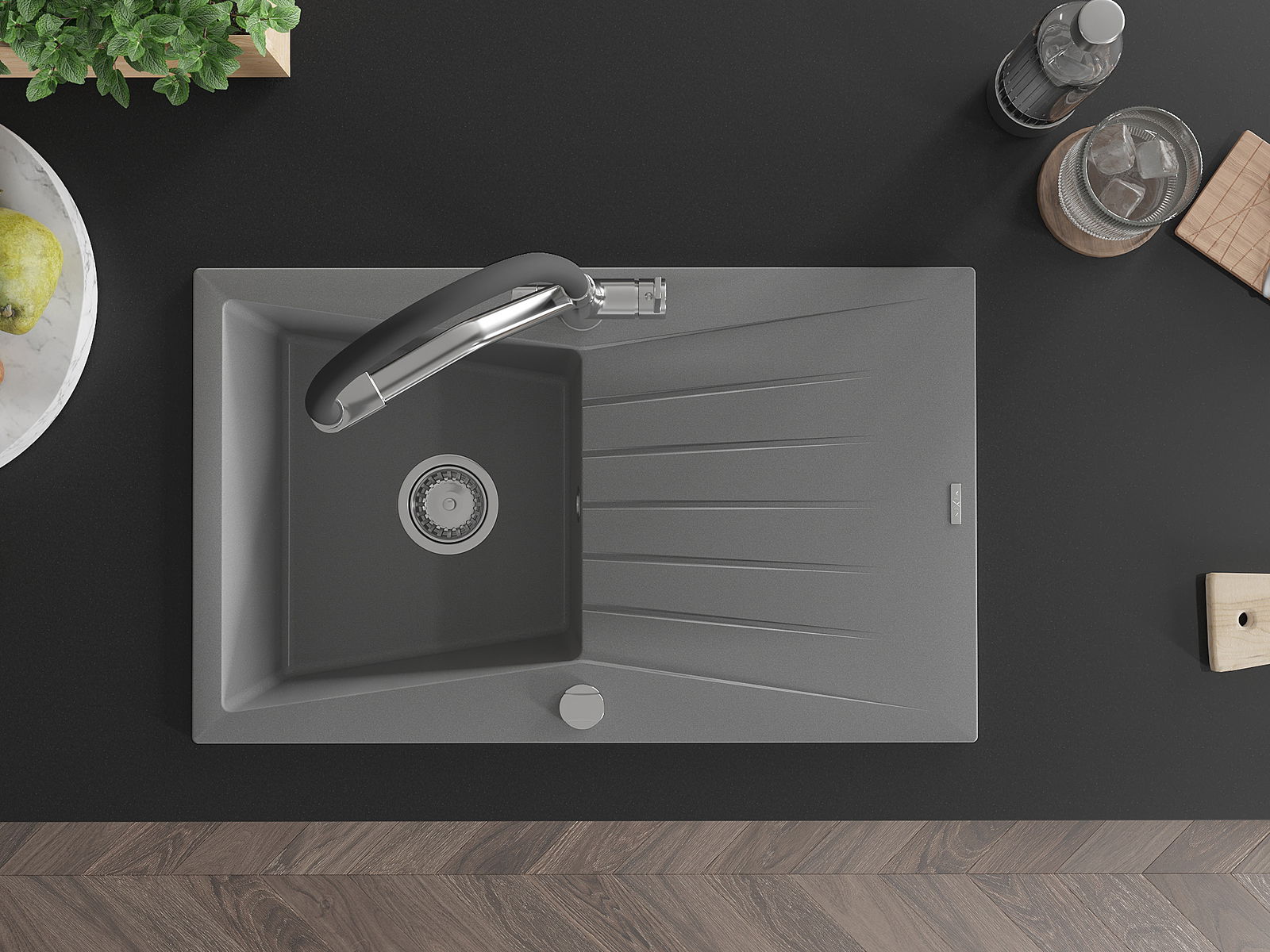Mexen Cesar jednodrezový žulový drez s odkvapkávacou plochou a kuchynskou batériou Duo, sivý - 6514-71-671701-07