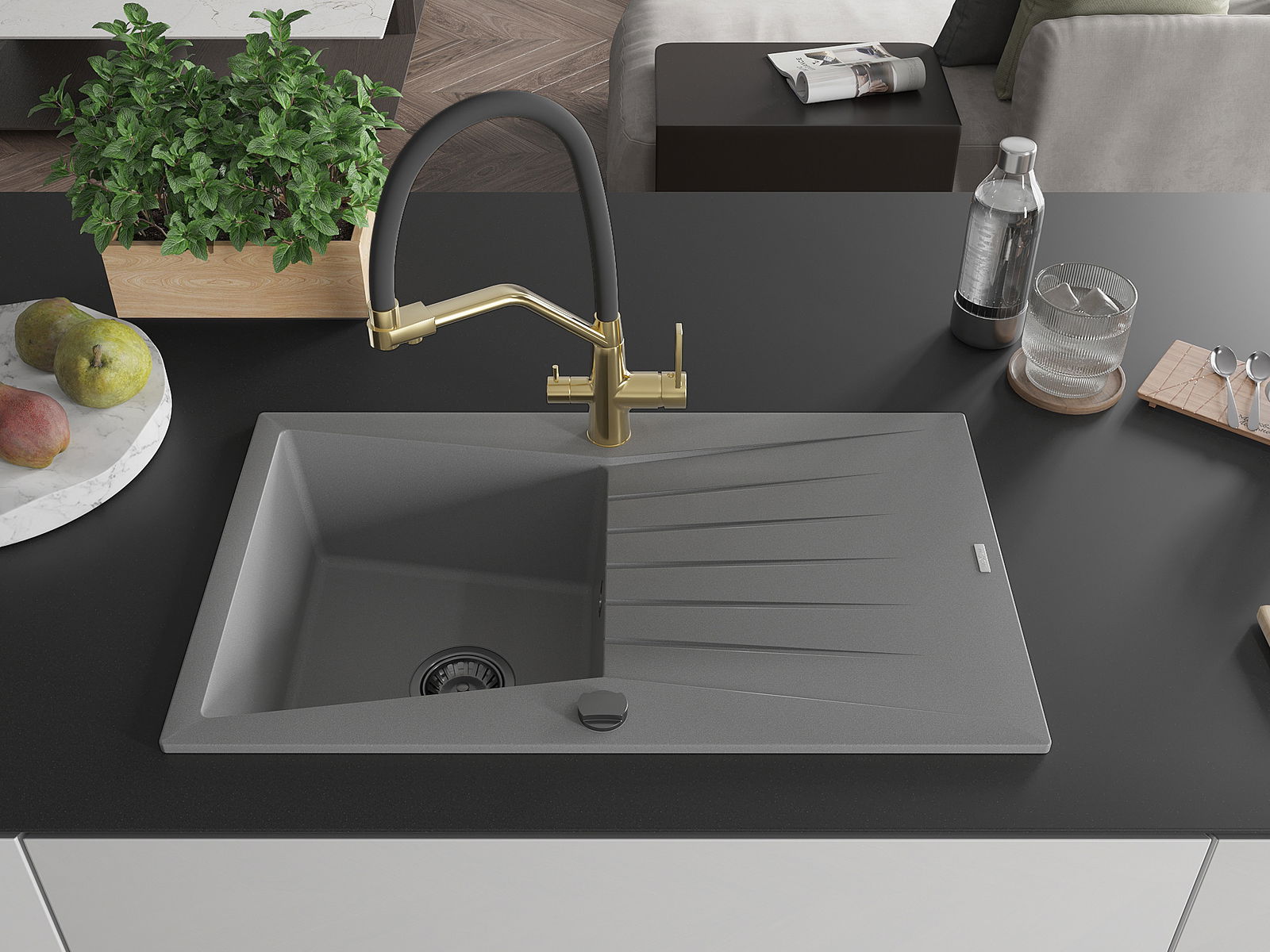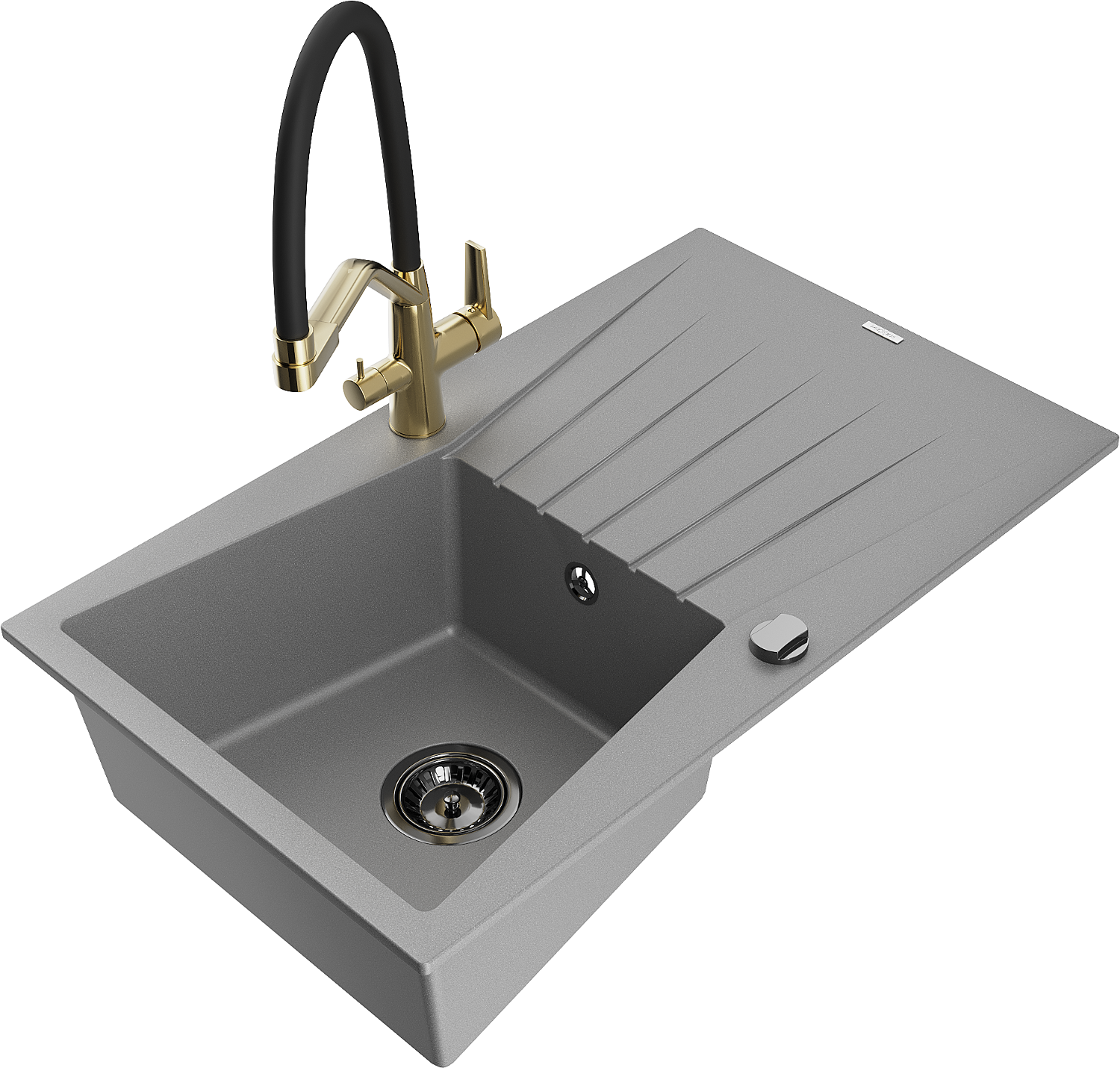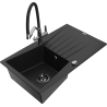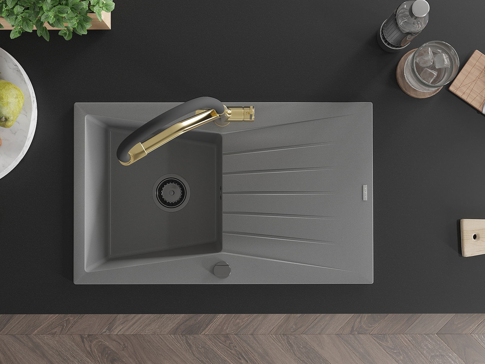 Mexen Cesar žulový kuchynský drez s jednou komorou a odkvapkávačom a kuchynskou batériou Duo, sivý - 6514-71-671701-57-B