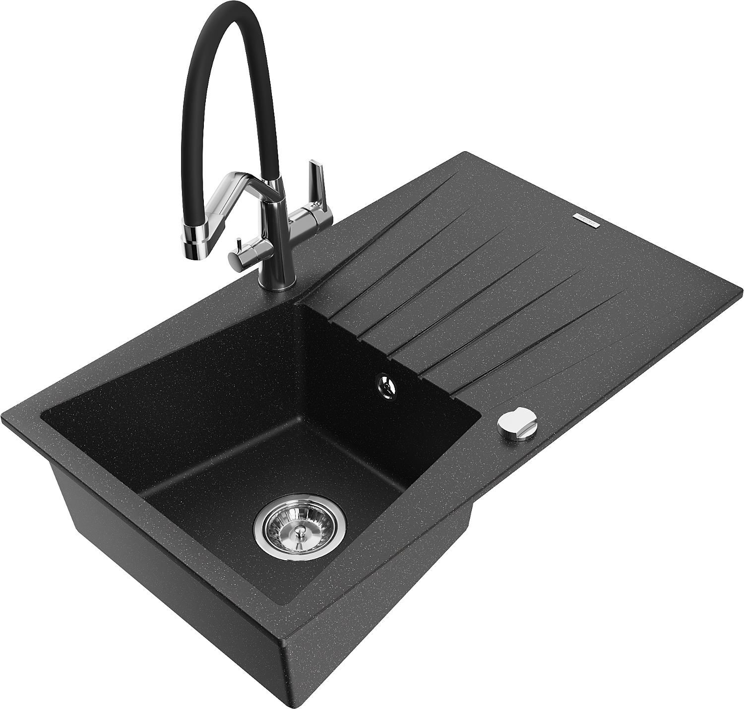 Mexen Cesar granitový drez 1-komorový s odkvapkávačom a kuchynskou batériou Duo, čierny/strieborný metalik - 6514-73-671701-07