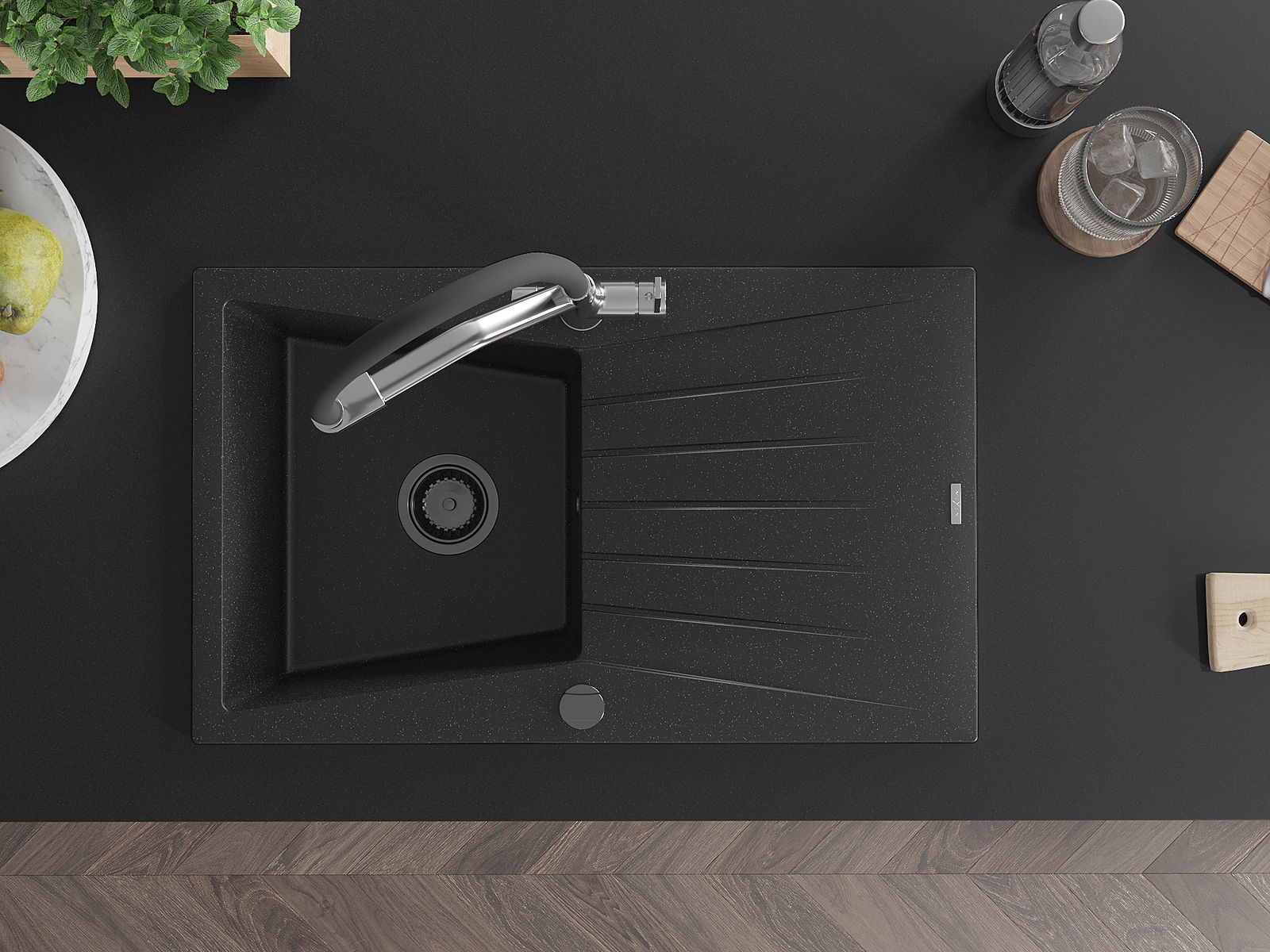 Mexen Cesar jednokomorový žulový drez s odkvapkávačom a kuchynskou batériou Duo, čierno/strieborný metalický