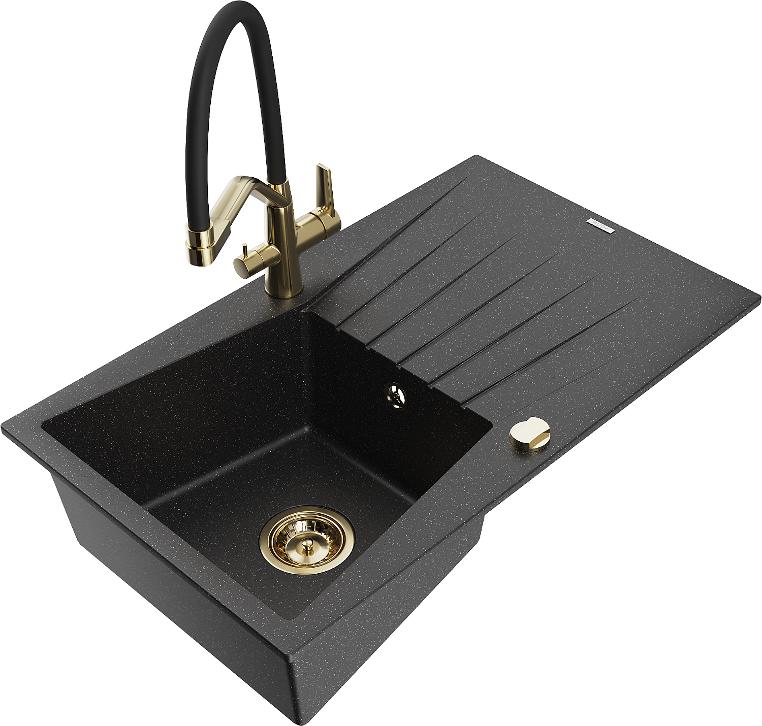 Mexen Cesar jednokomorový granitový drez s odkvapkávačom a kuchynská batéria Duo, čierny/strieborný metalik