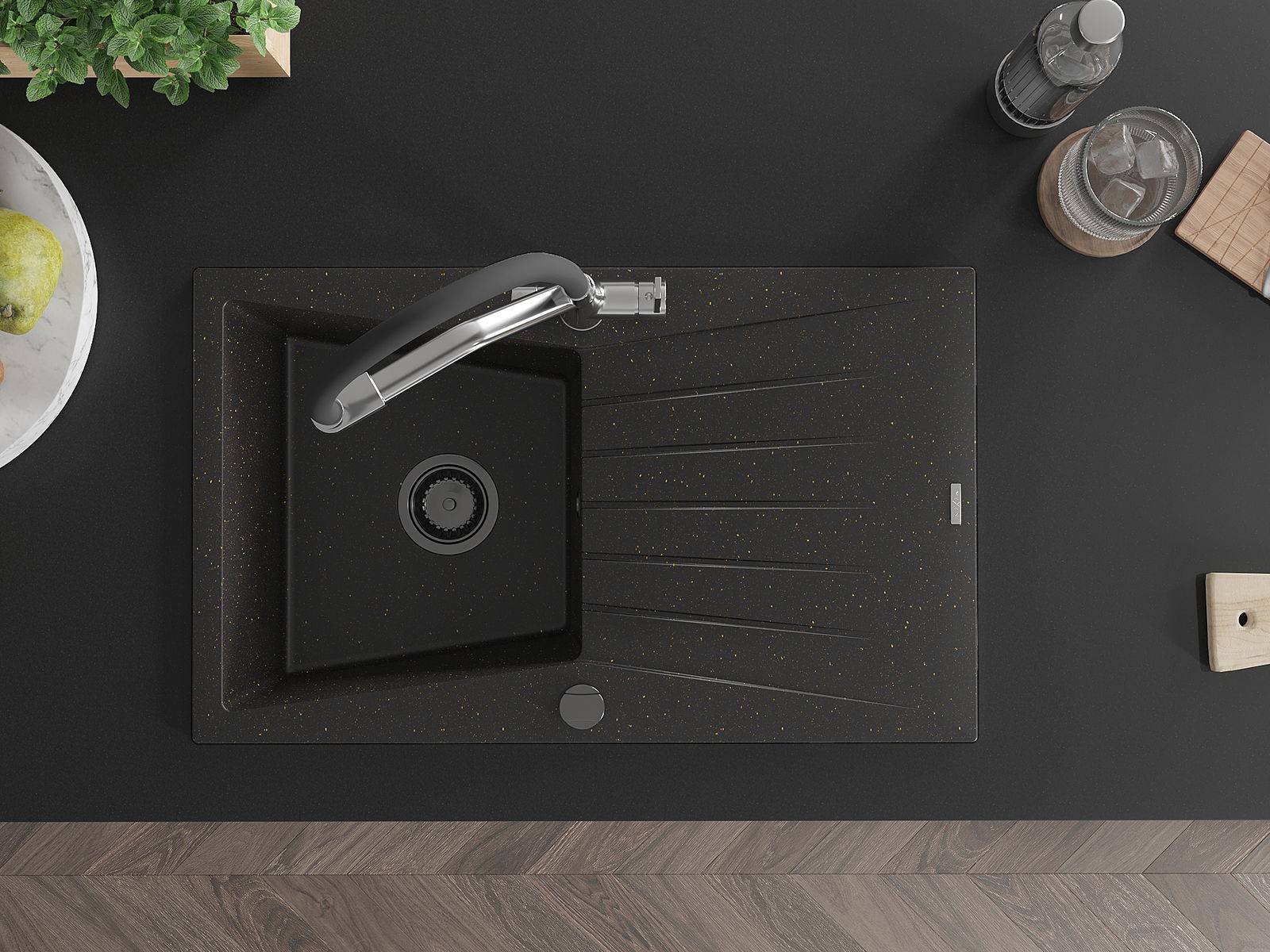 Mexen Cesar granitový drez s 1 komorou, odkvapkávačom a kuchynskou batériou Duo, čierny/zlatý metalický