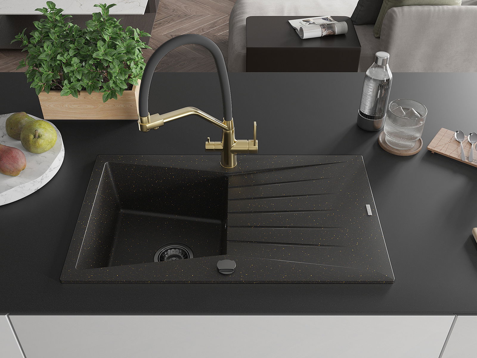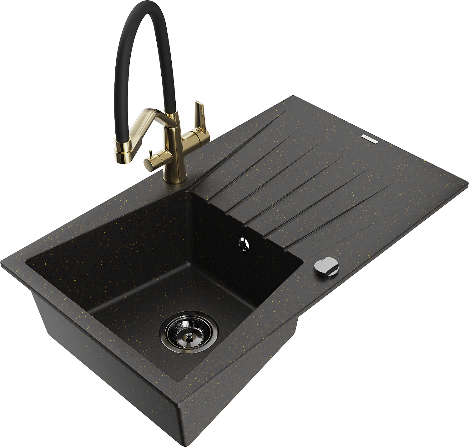 Mexen Cesar granitový drez s 1 vaničkou, odkvapkávačom a kuchynskou batériou Duo, čierny/zlatý metalický
