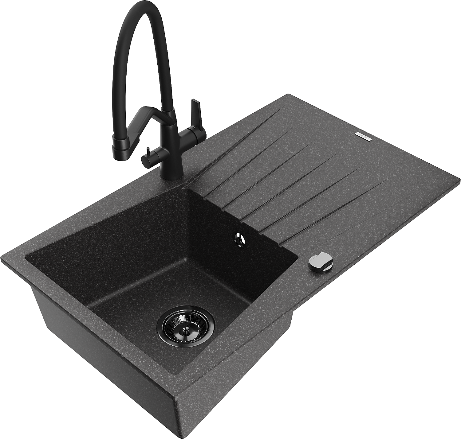Mexen Cesar žulový kuchynský drez s jednou komorou a odkvapkávačom a kuchynskou batériou Duo, čierny s bodkami