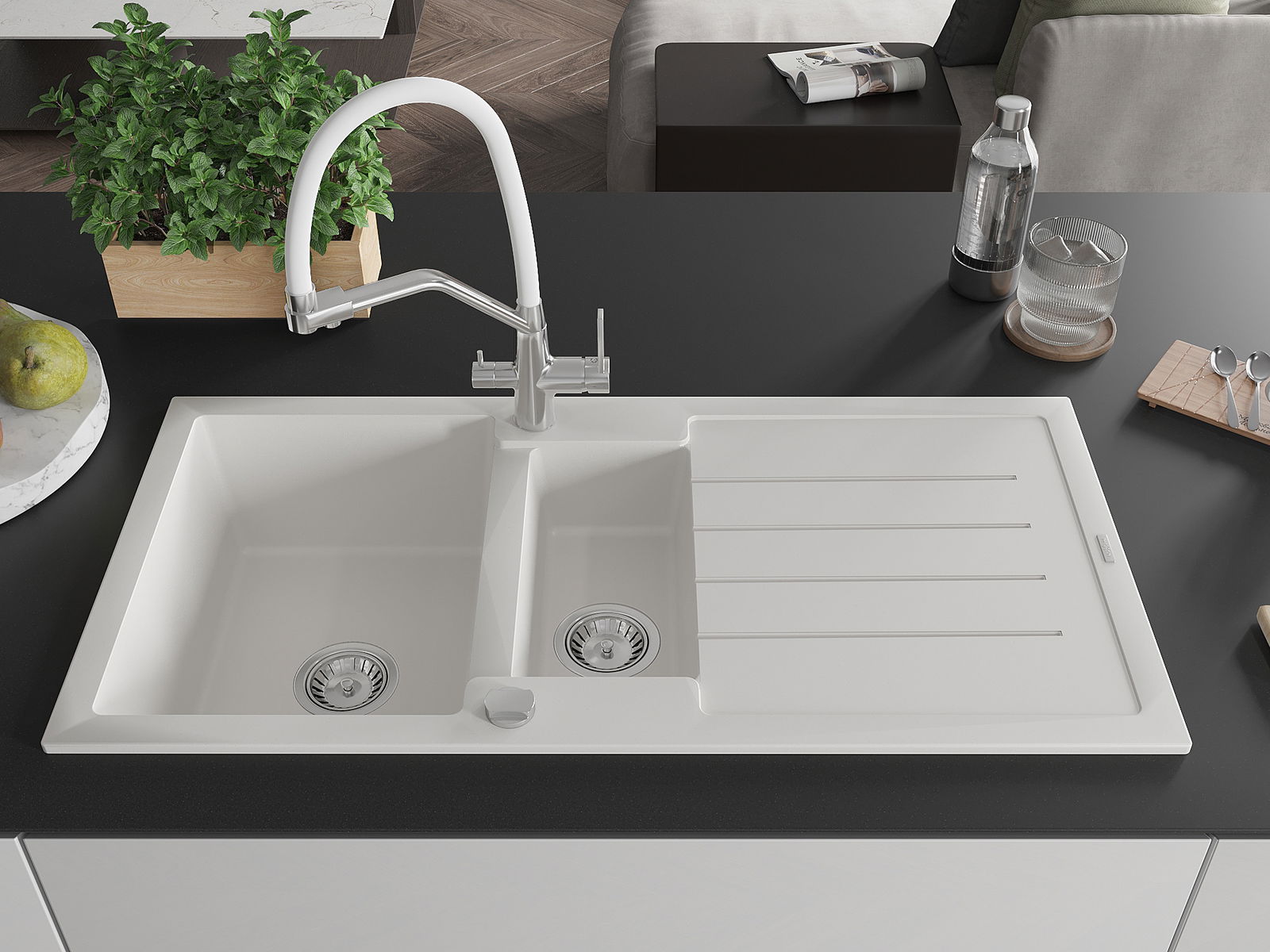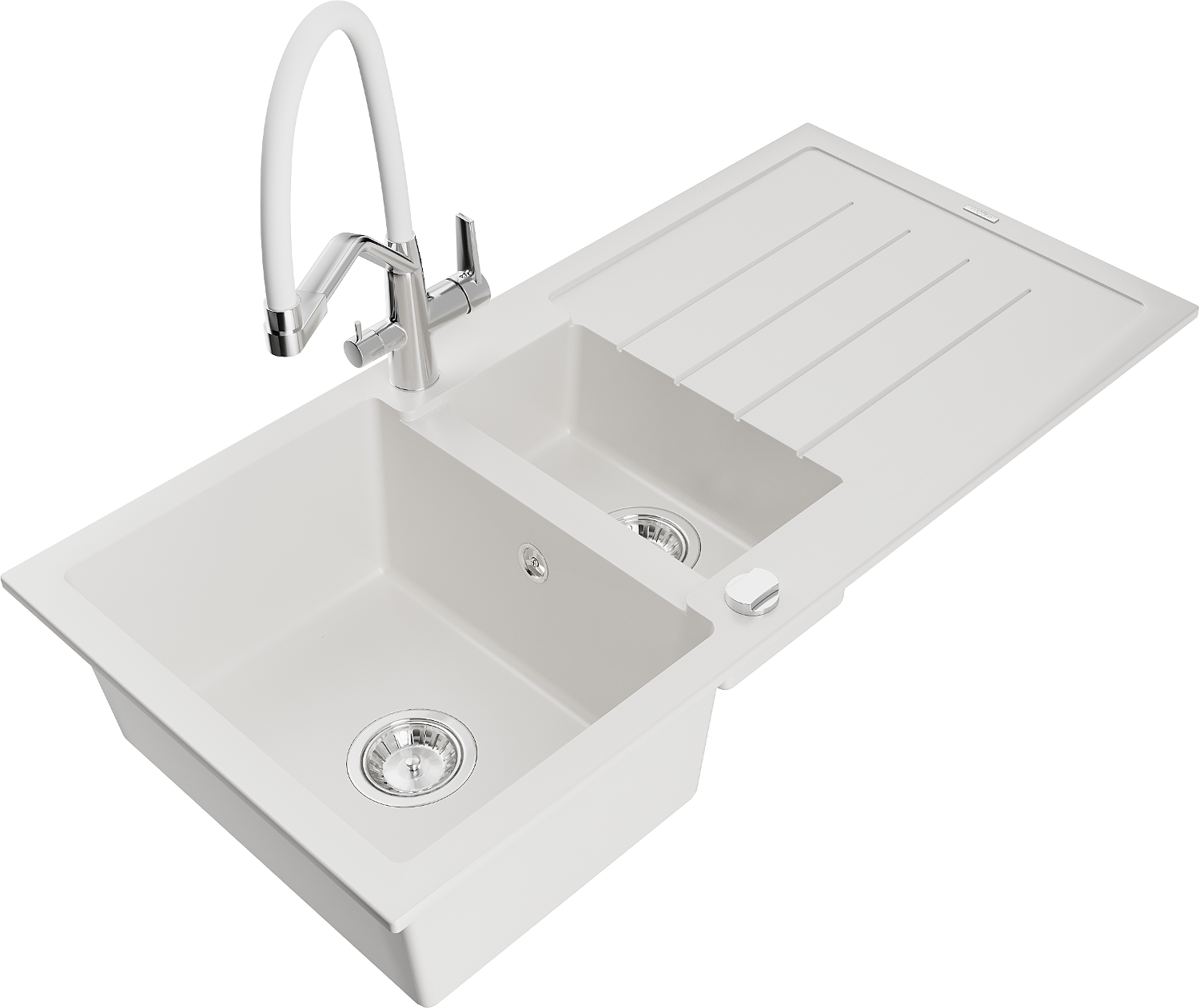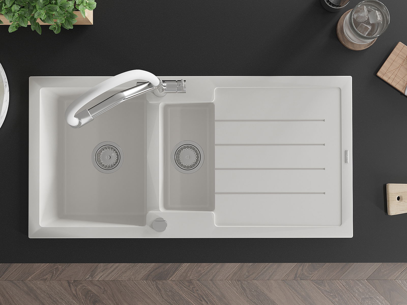 Mexen Andres granitový drez 1,5-komorový s odkvapkávačom a kuchynskou batériou Duo, biely - 6515-20-671701-02