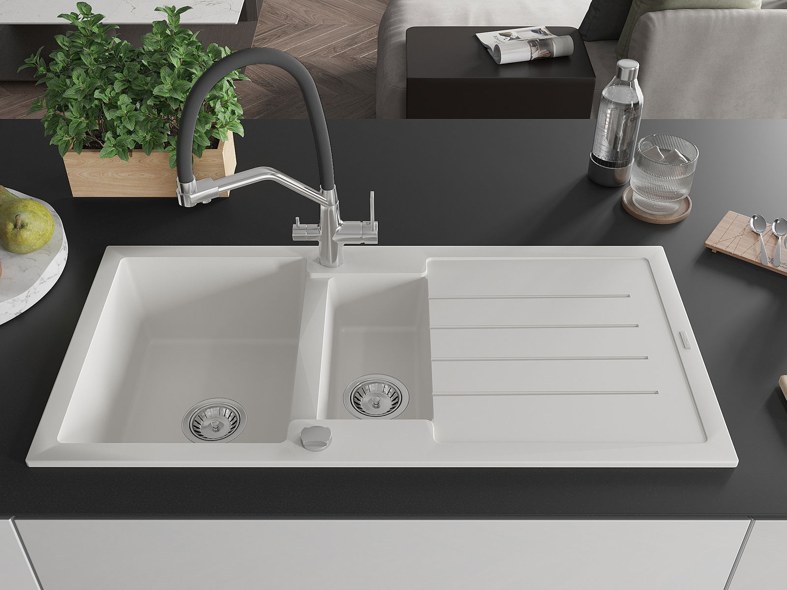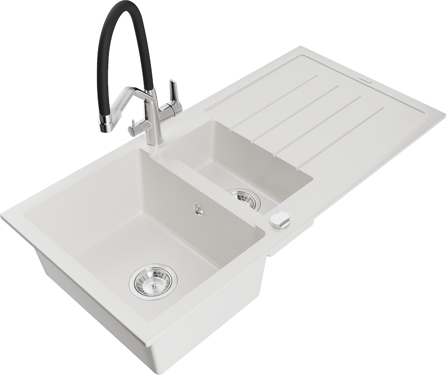 Mexen Andres žulový drez 1,5-komorový s odkvapkávačom a kuchynskou batériou Duo, biela - 6515-20-671701-07