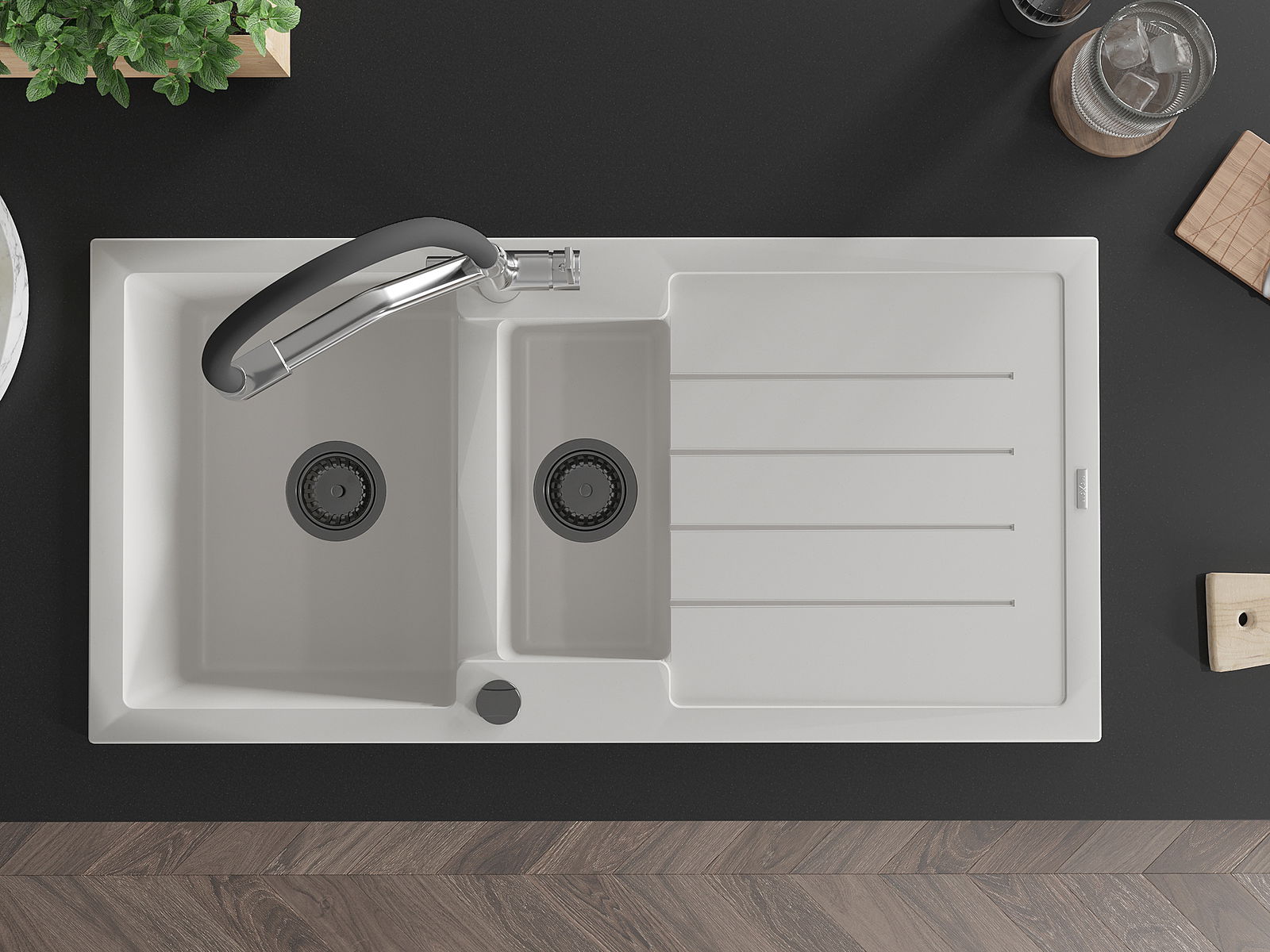 Mexen Andres granitový kuchynský drez 1,5-komorový s odkvapkávačom a kuchynskou batériou Duo, biely - 6515-20-671701-07-B