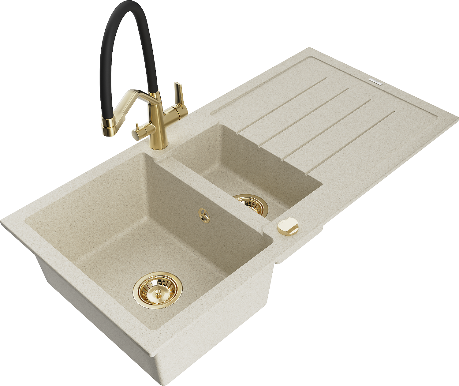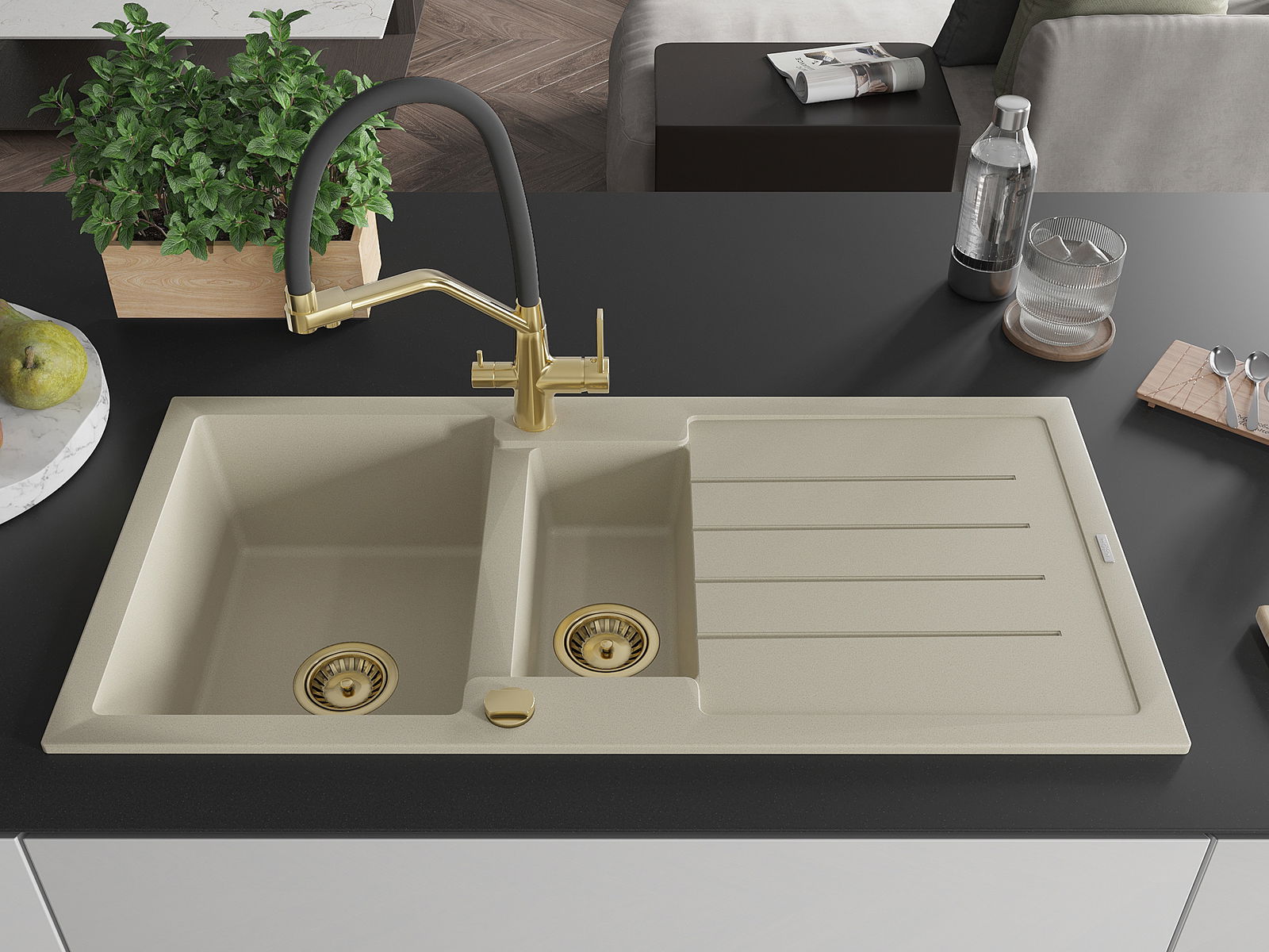 Mexen Andres žulový kuchynský drez 1,5-komorový s odkvapkávačom a kuchynskou batériou Duo, béžový - 6515-69-671701-57-G