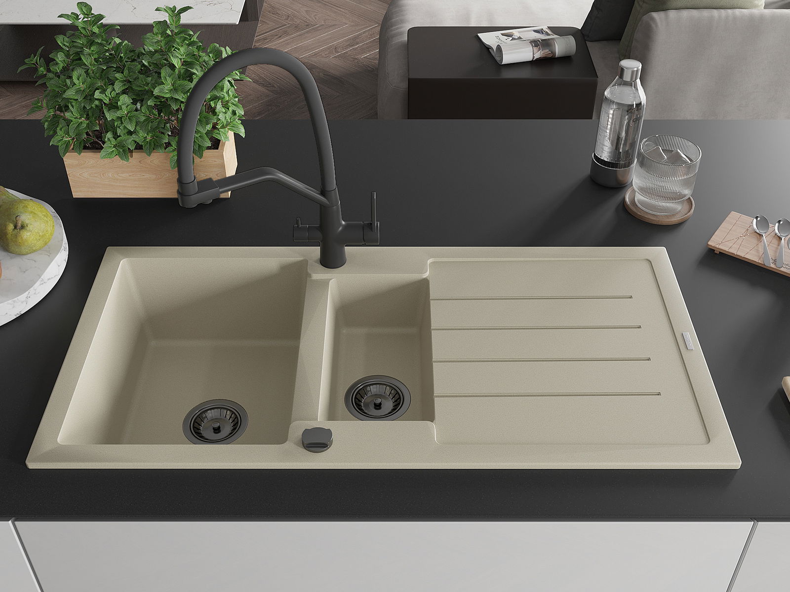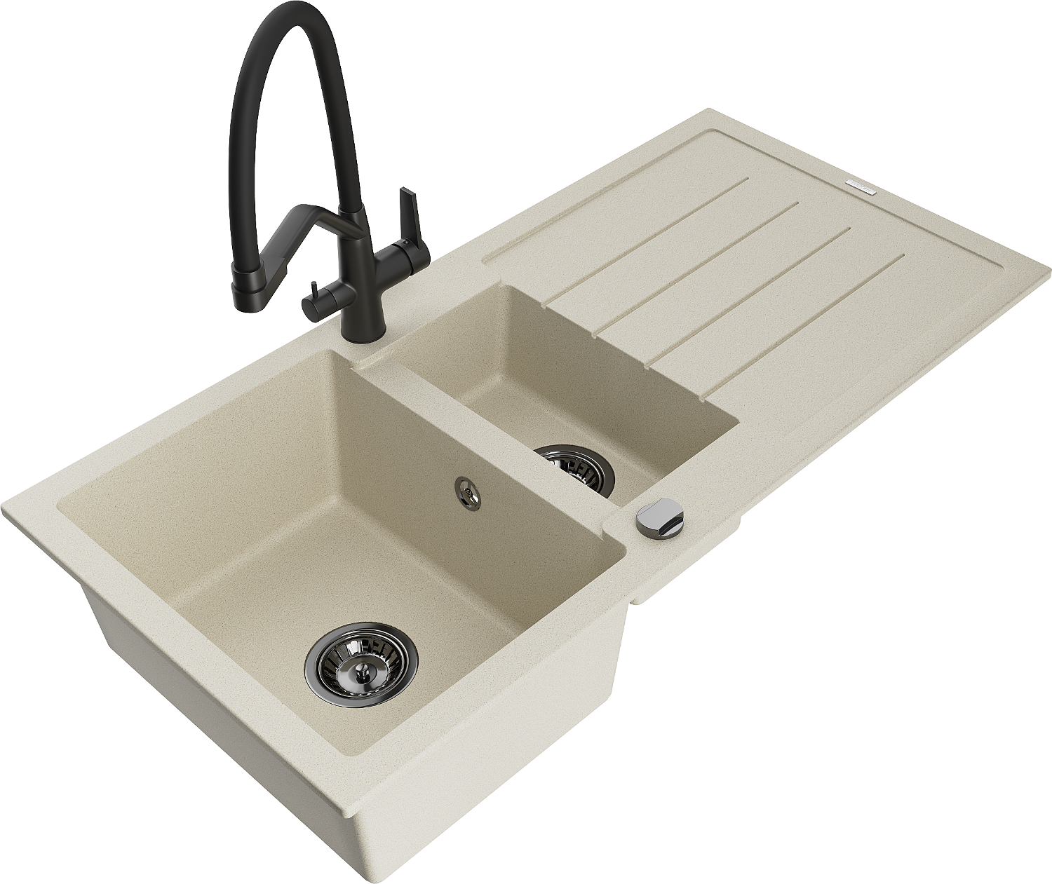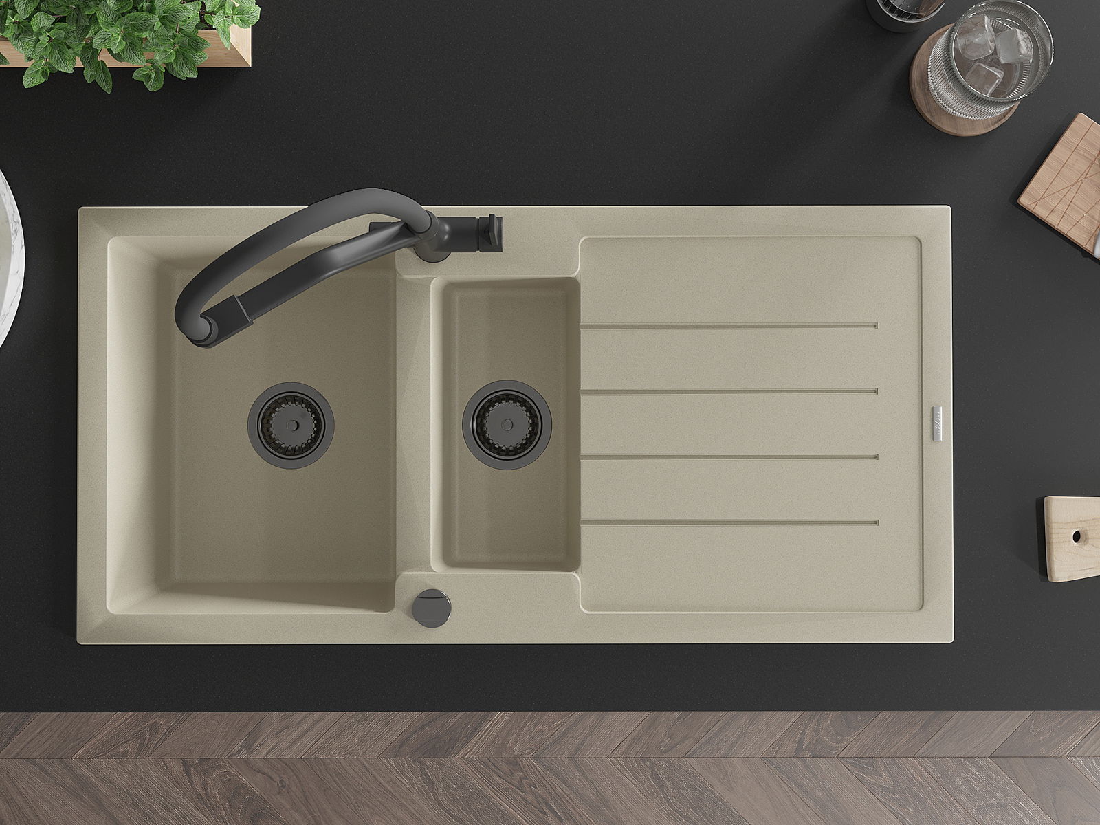 Mexen Andres granitový drez 1,5-komorový s odkvapkávačom a kuchynskou batériou Duo, béžový - 6515-69-671701-70-B