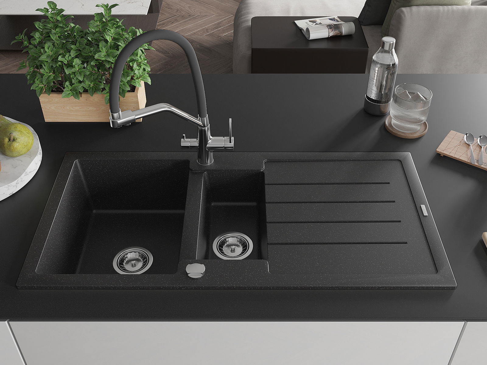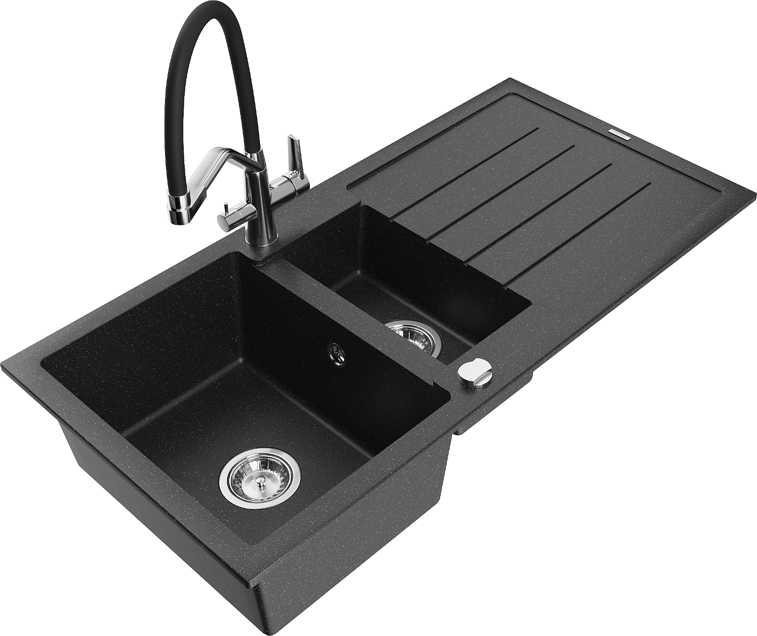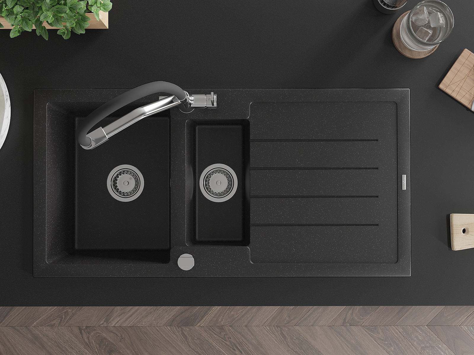 Mexen Andres žulový drez 1,5-komorový s odkvapkávačom a kuchynskou batériou Duo, čierny/strieborný metalický - 6515-73-671701-0?