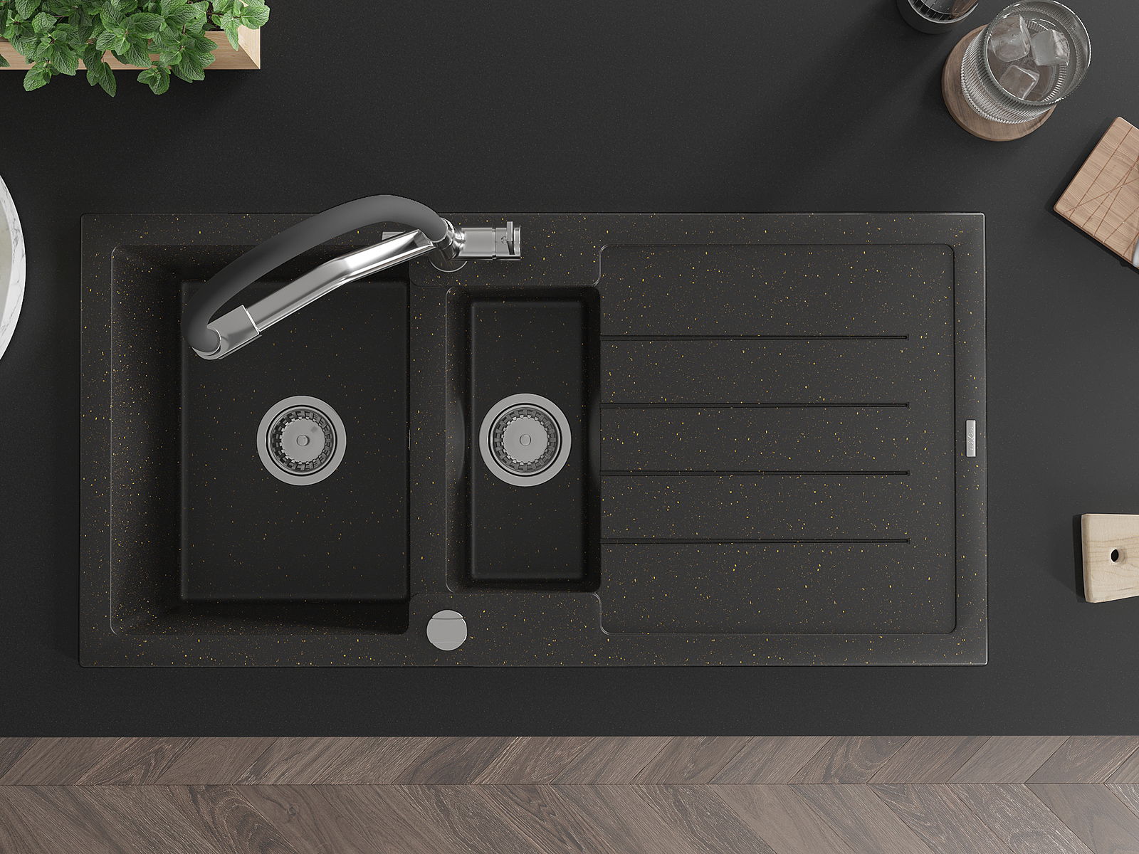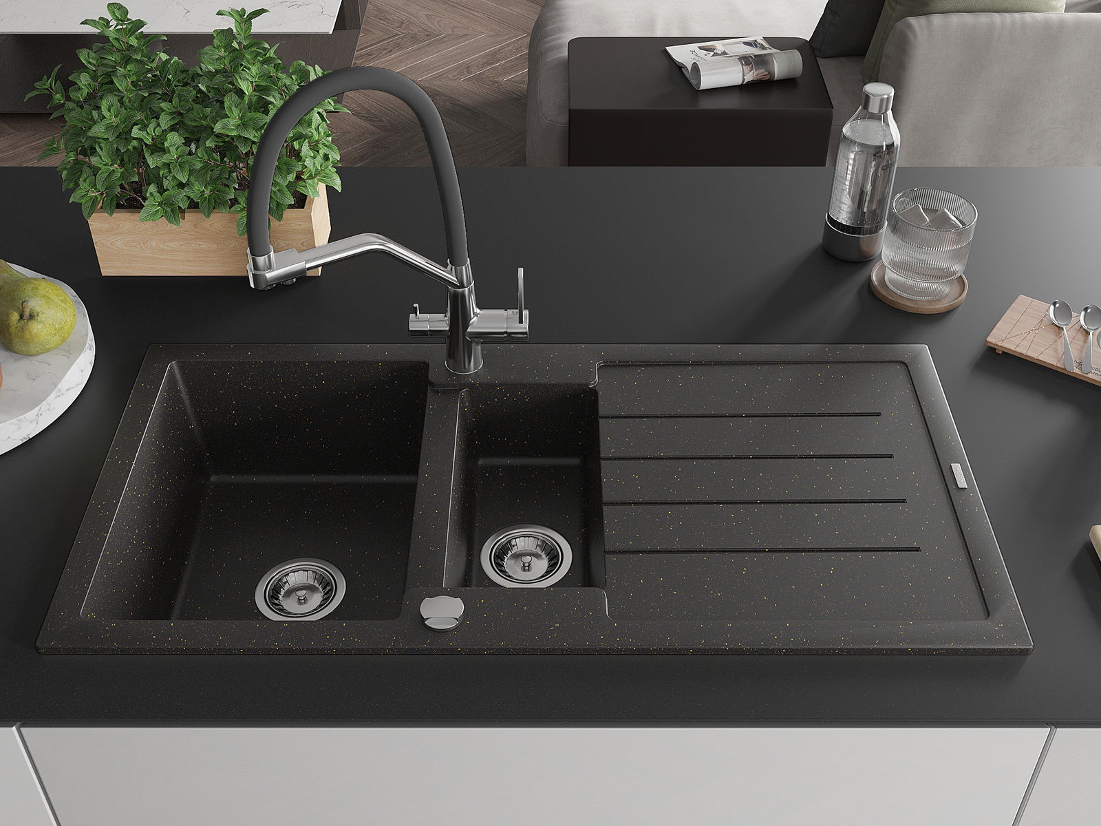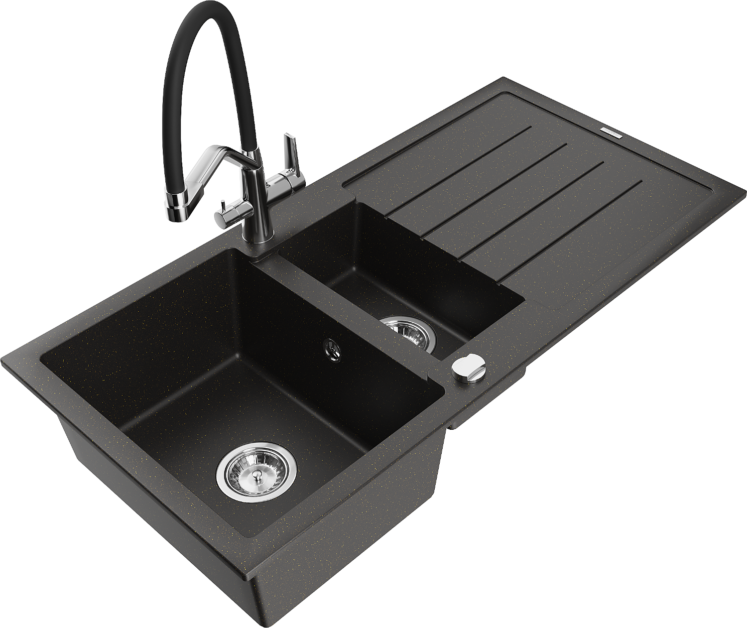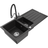 Mexen Andres žulový drez 1,5-komorový s odkvapom a kuchynskou batériou Duo, čierny/zlatý metalik - 6515-75-671701-07