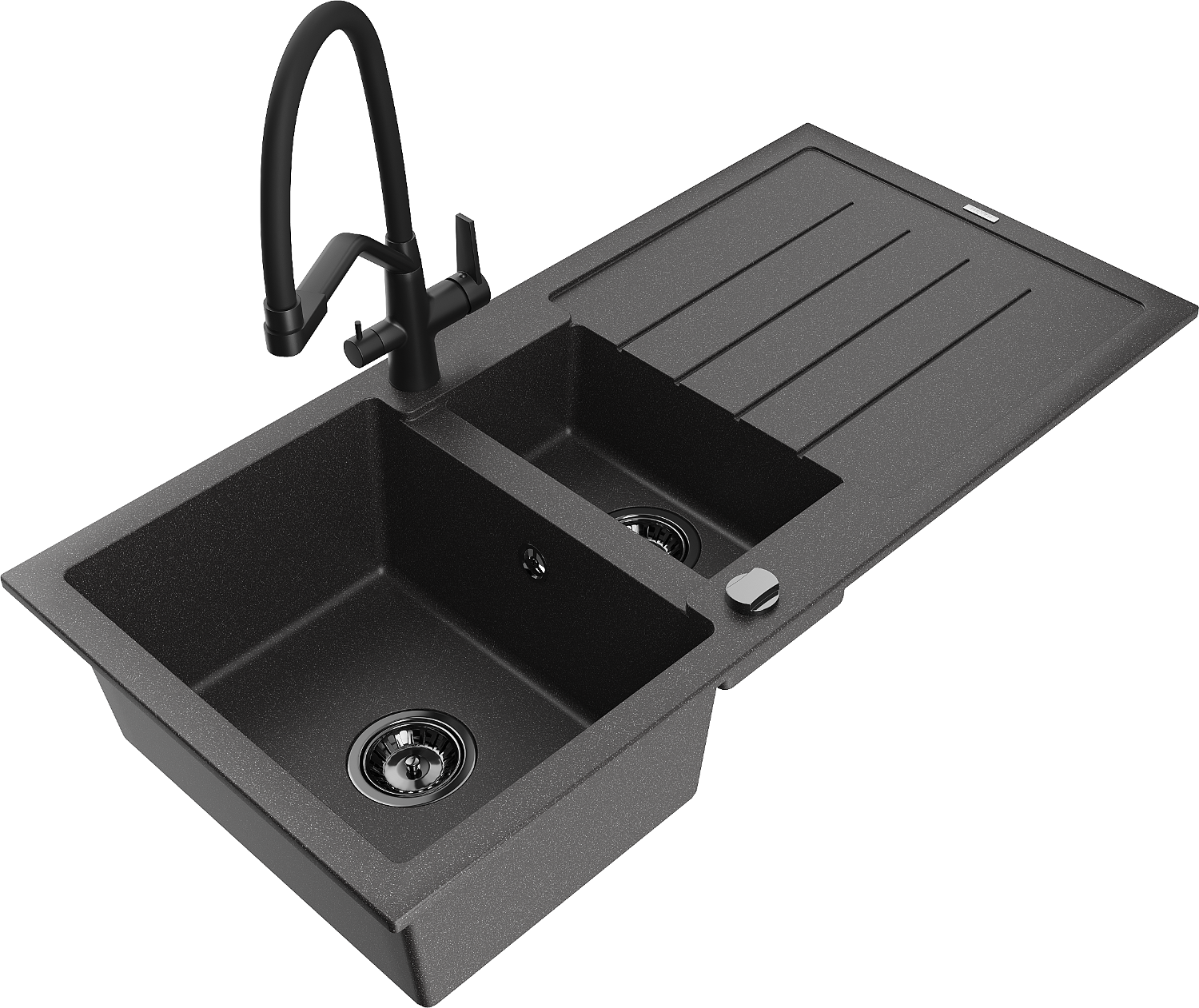 Mexen Andres žulový kuchynský drez 1,5-komorový s odkvapkávačom a kuchynskou batériou Duo, čierny s bodkami - 6515-76-671701-70?