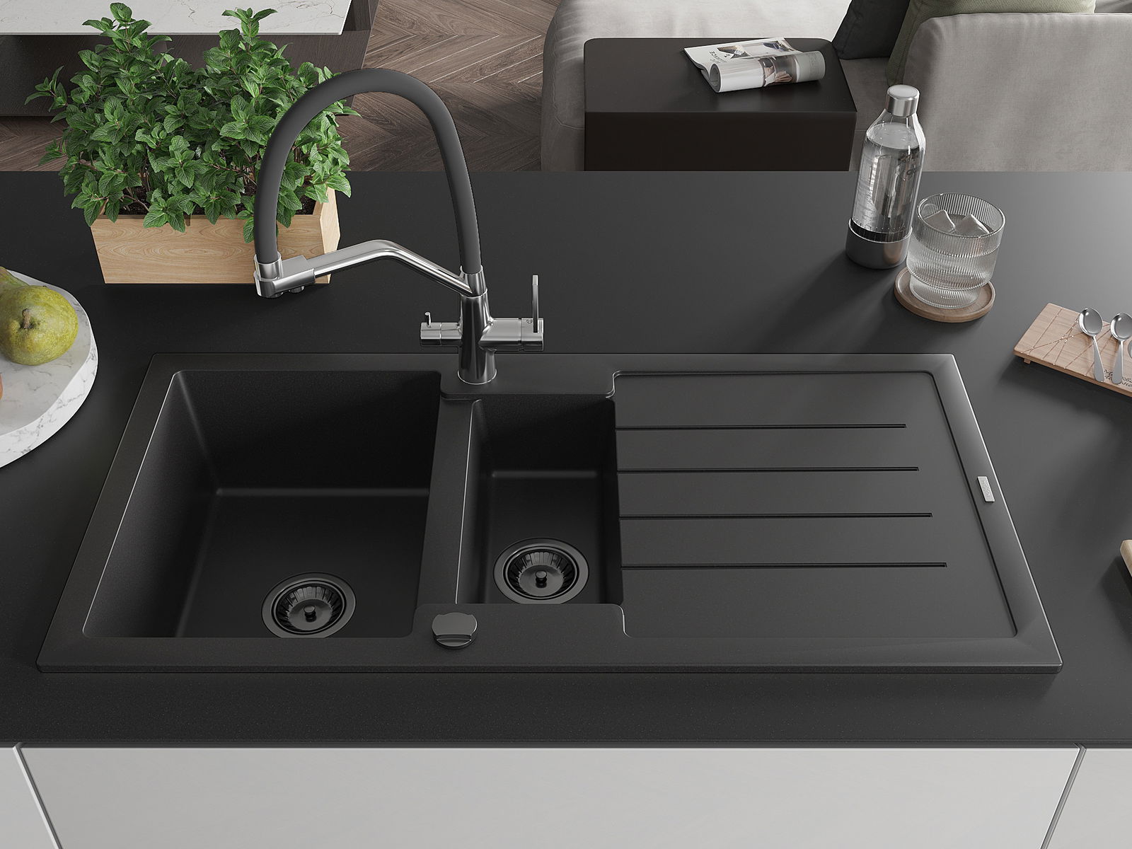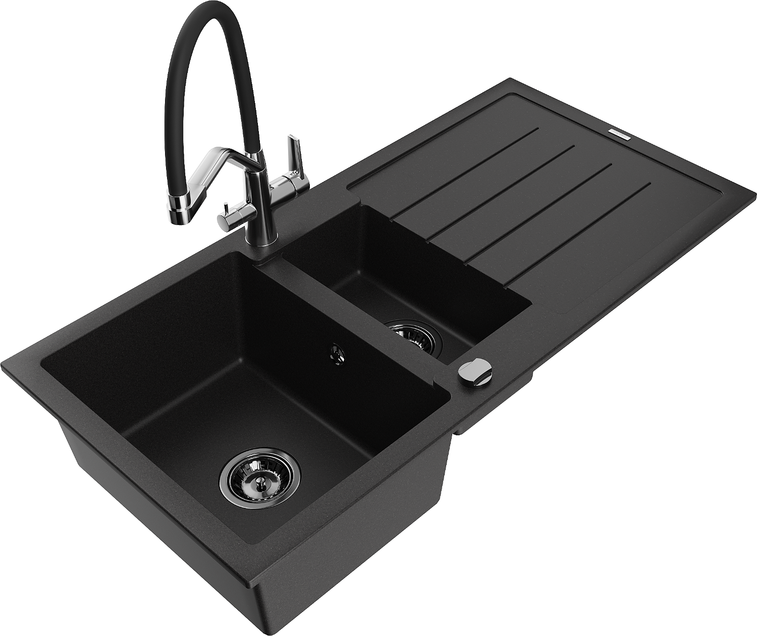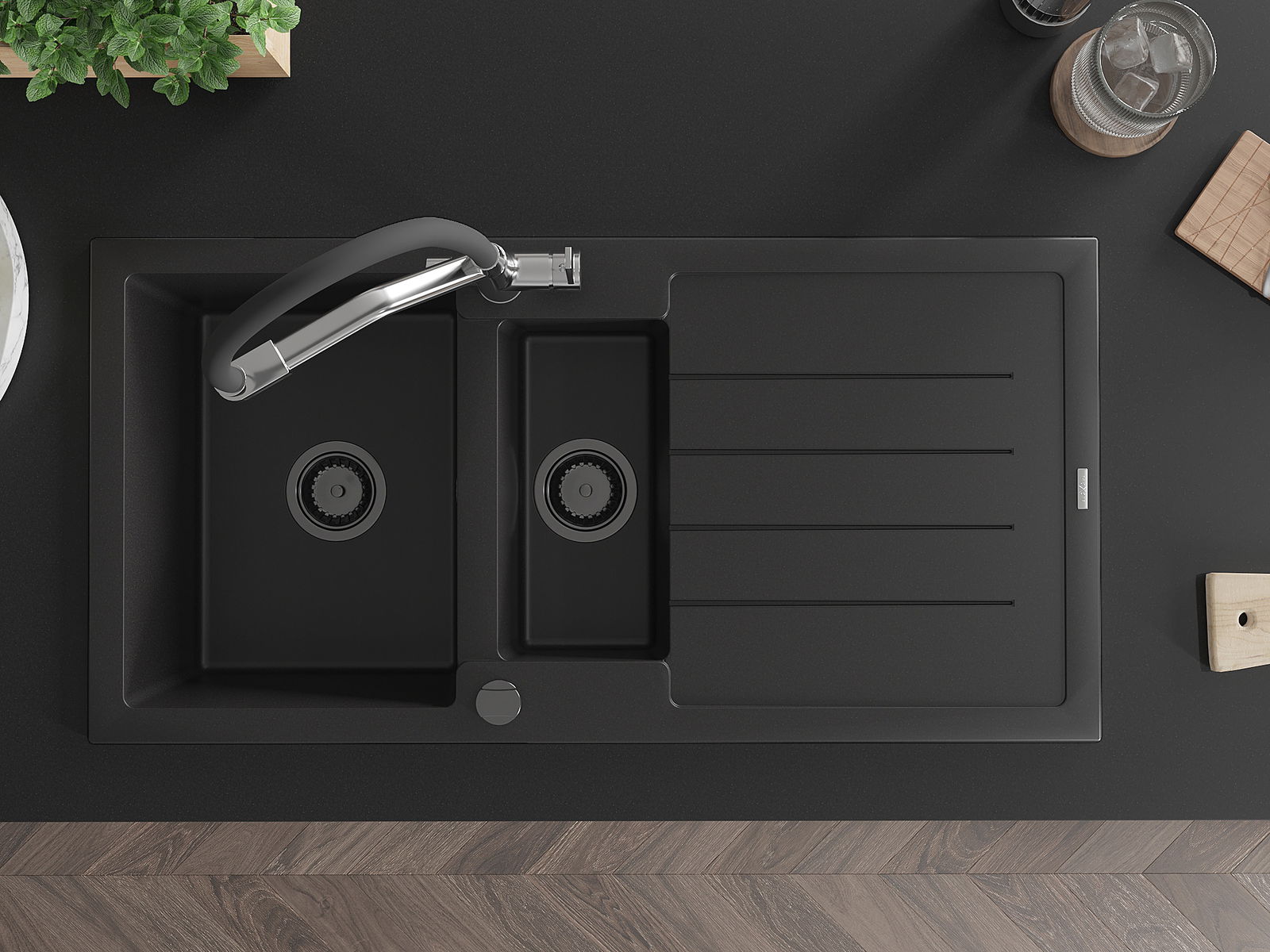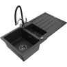 Mexen Andres granitový drez 1,5-komorový s odkvapkávačom a kuchynskou batériou Duo, čierny - 6515-77-671701-07-B