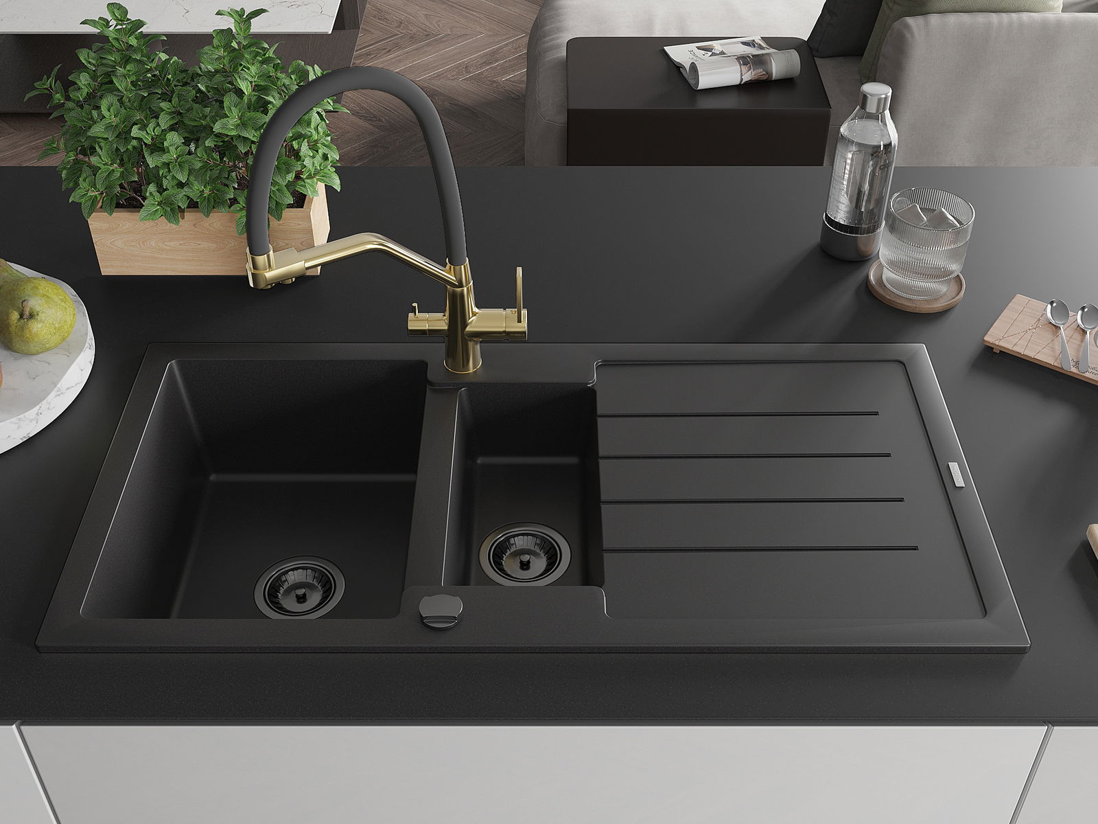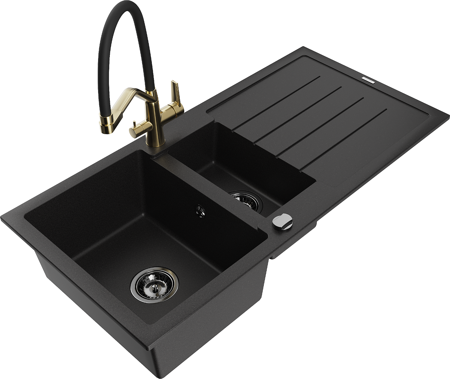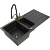Mexen Andres žulový drez 1,5-komorový s odkvapkávačom a kuchynskou batériou Duo, čierny - 6515-77-671701-57-B