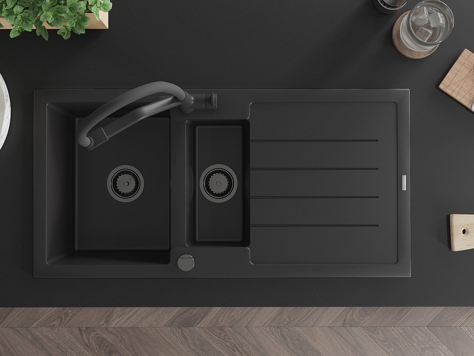 Mexen Andres granitový drez 1,5-komorový s odkvapom a kuchynskou batériou Duo, čierny - 6515-77-671701-70-B