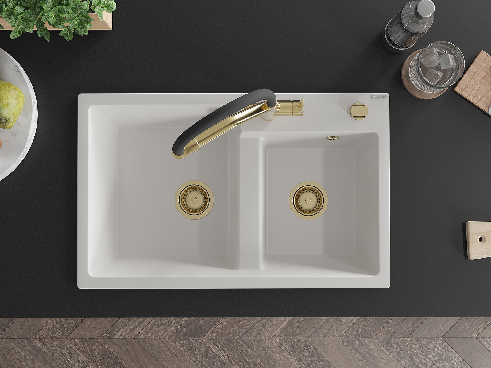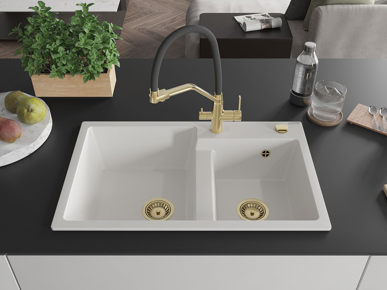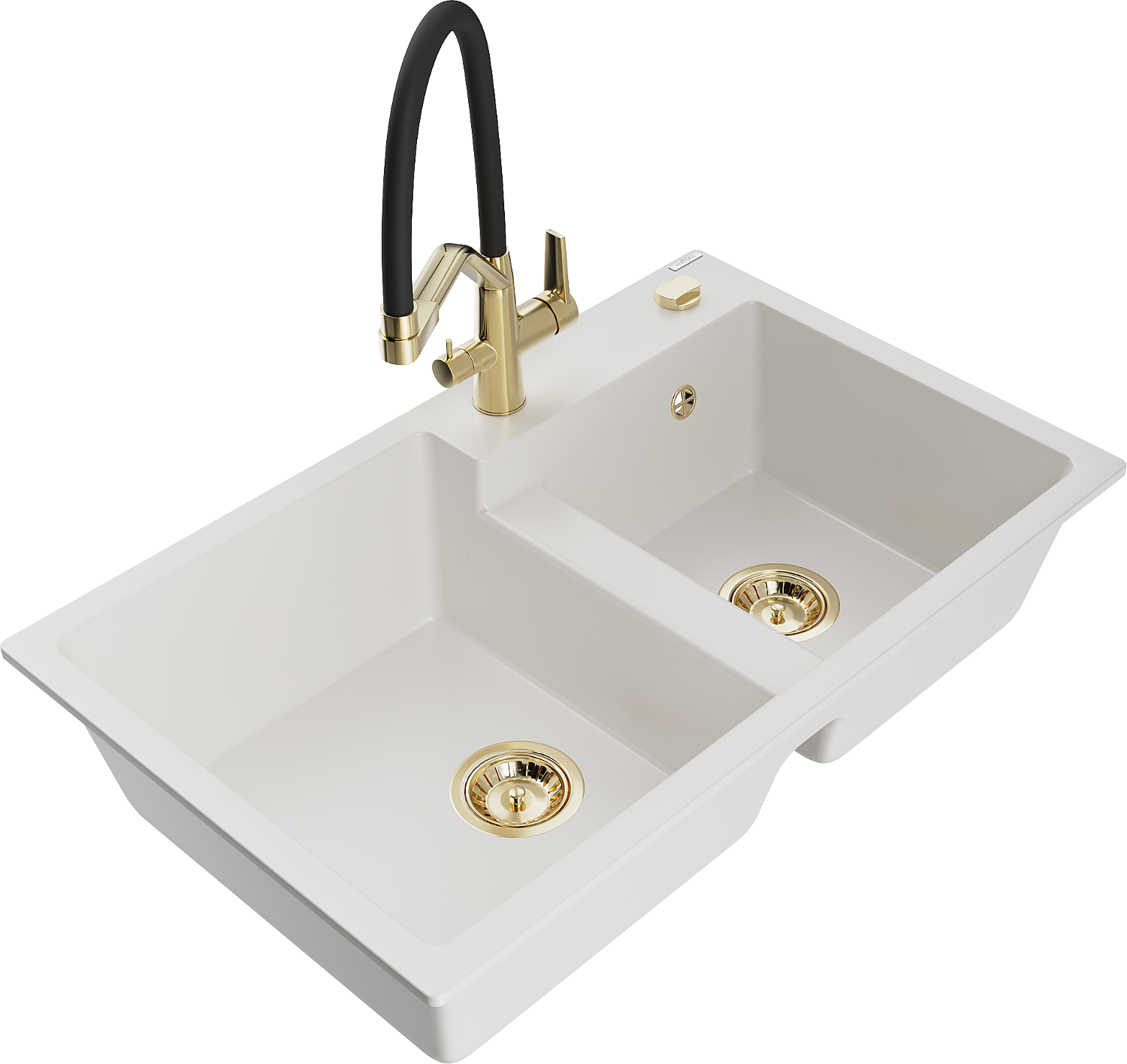 Mexen Tomas dvojkomorový granitový drez s kuchynskou batériou Duo, biely - 6516-20-671701-57-G