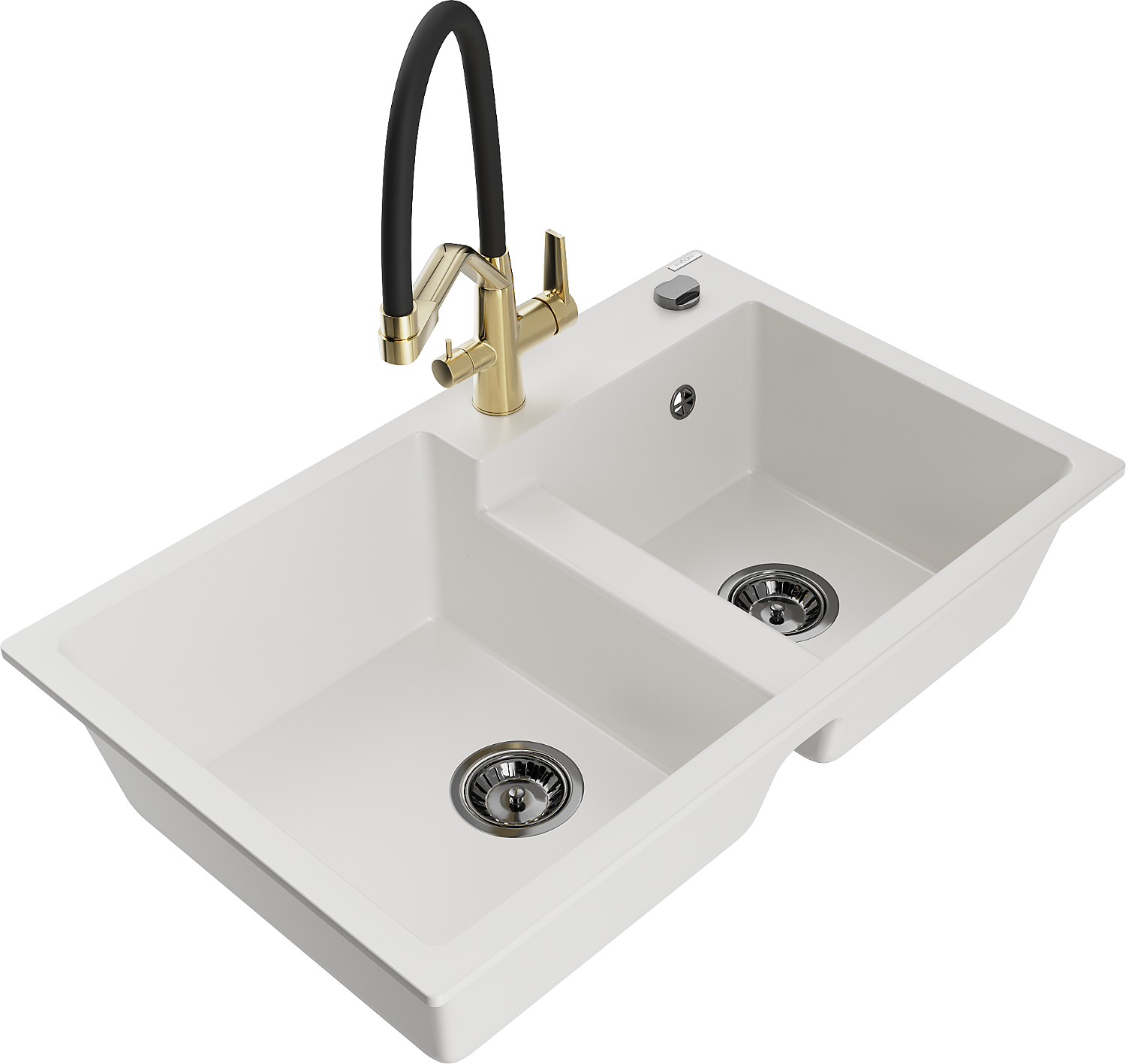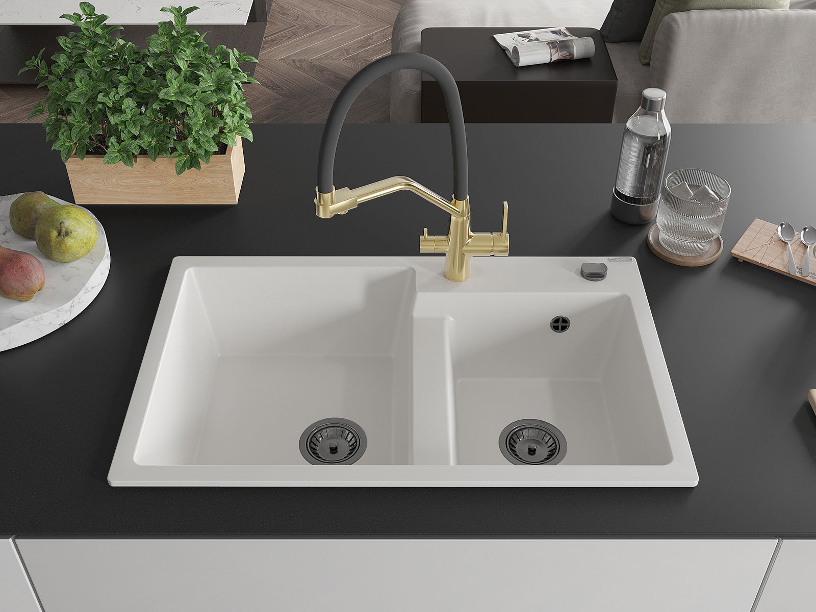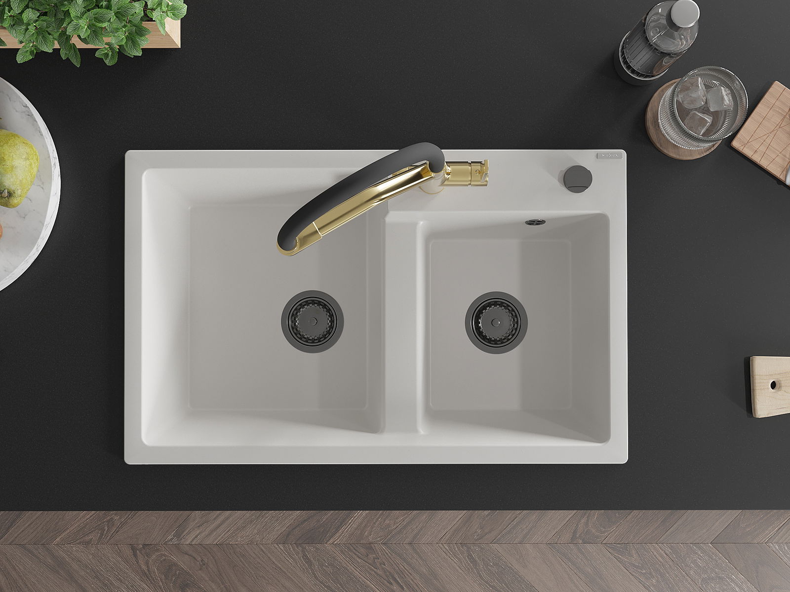 Mexen Tomas žulový drez s 2 komorami s kuchynskou batériou Duo, biely - 6516-20-671701-57-B
