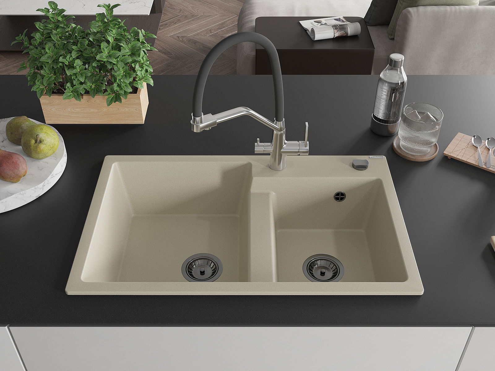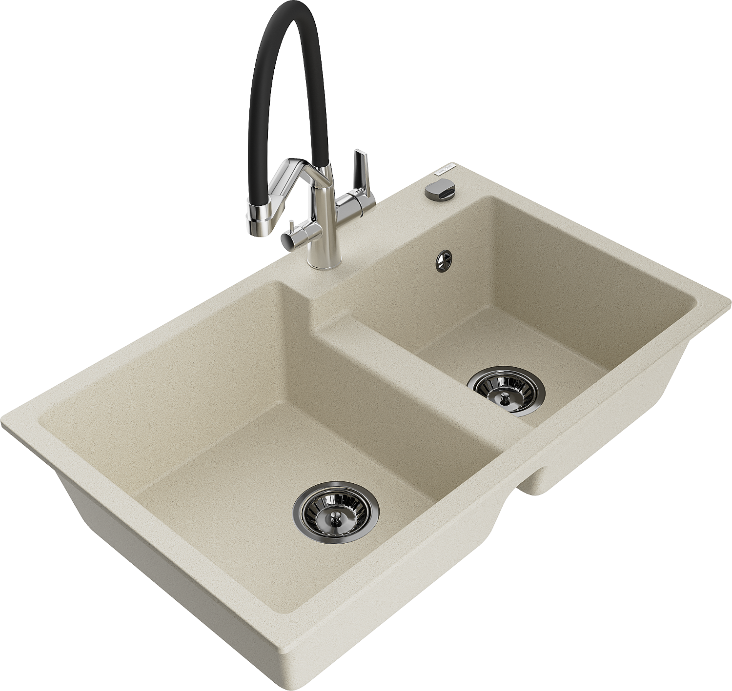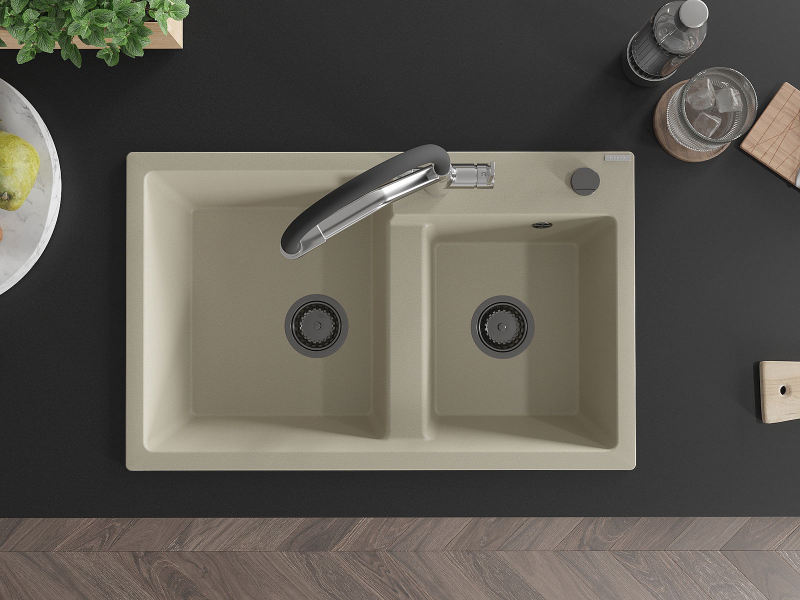 Mexen Tomas granitový dvojkomorový drez s kuchynskou batériou Duo, béžový - 6516-69-671701-07-B