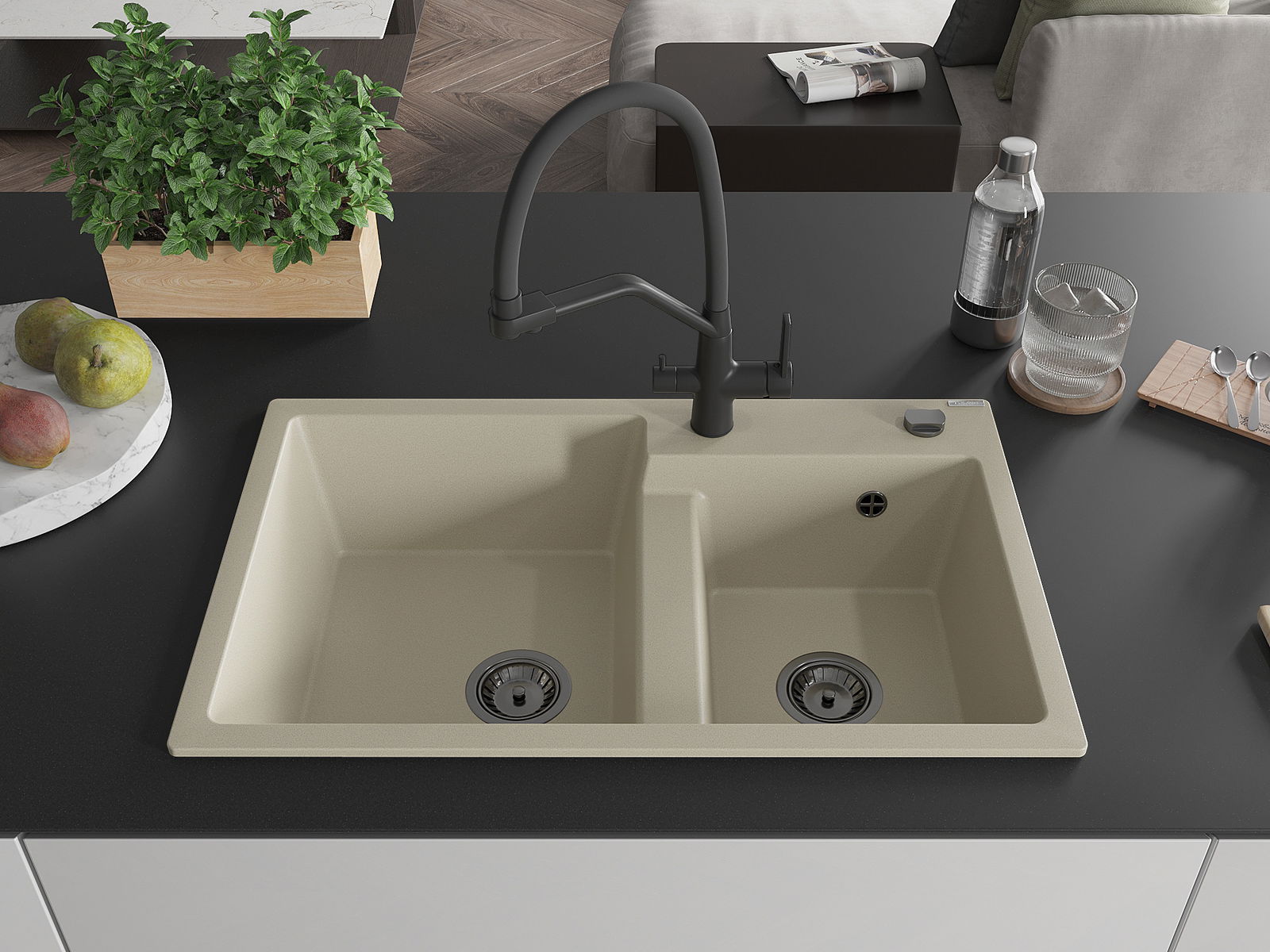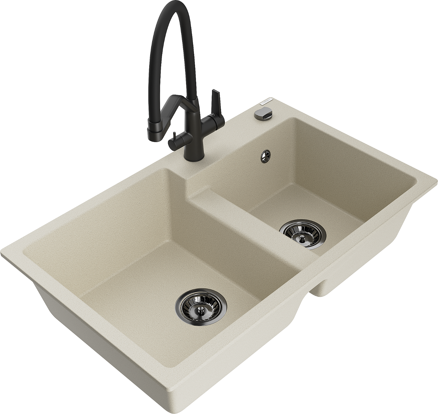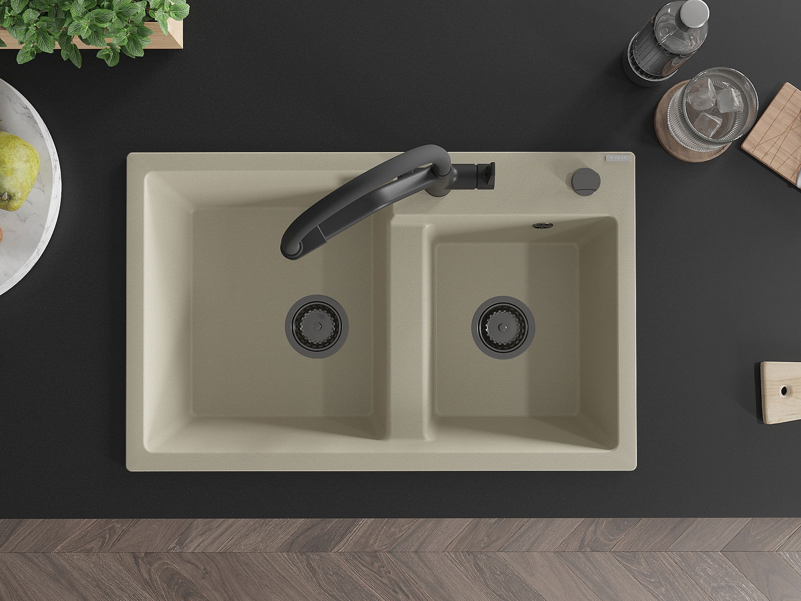 Mexen Tomas žulový drez s 2 komorami a kuchynskou batériou Duo, béžový - 6516-69-671701-70-B