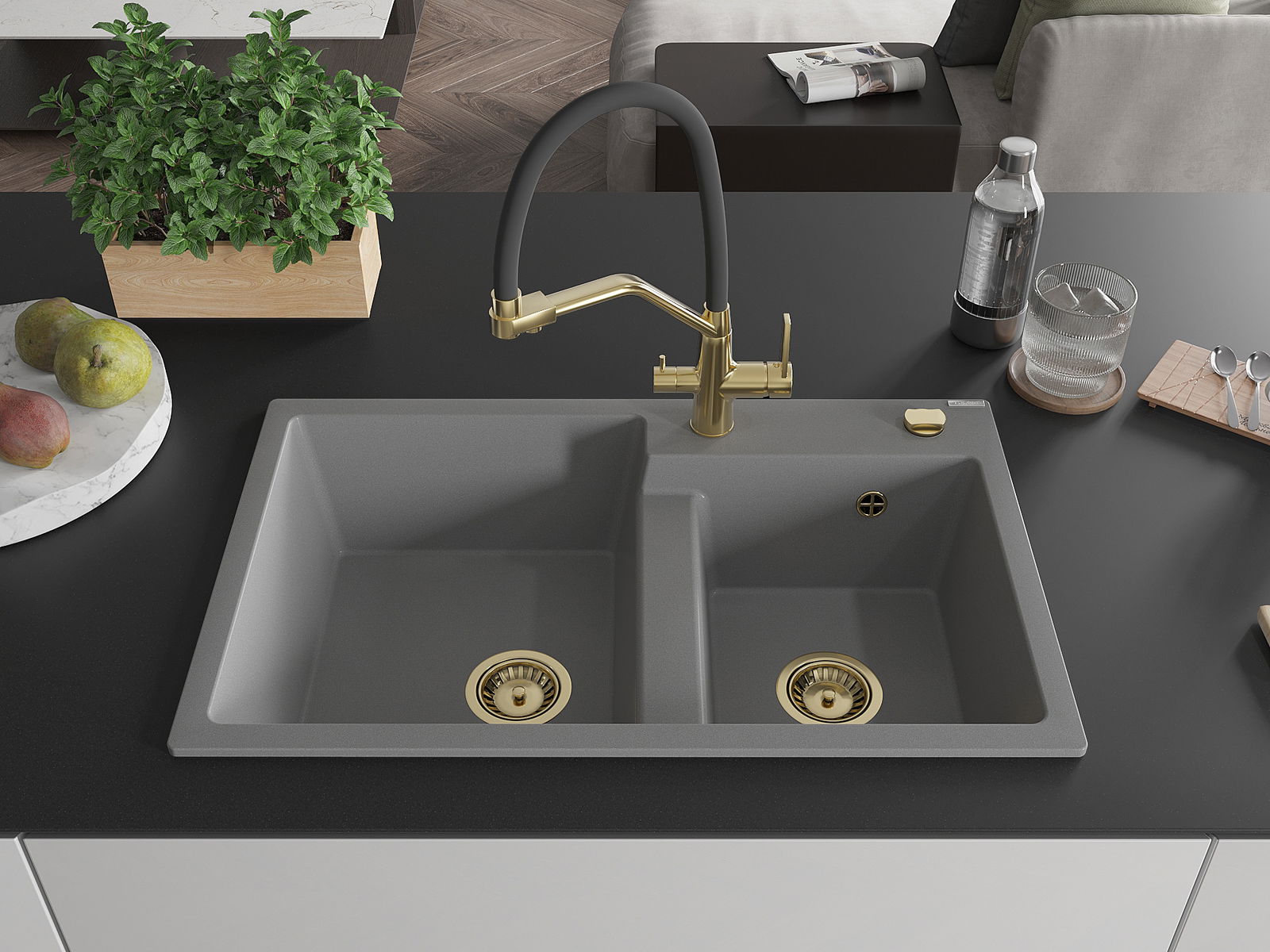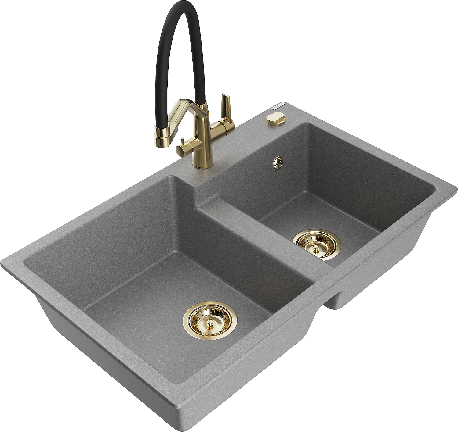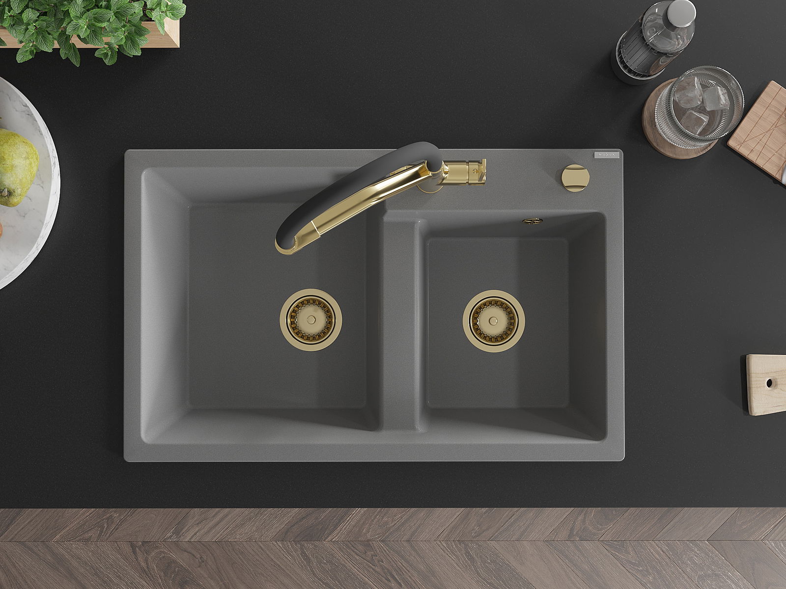 Mexen Tomas žulový drez 2-komorový s kuchynskou batériou Duo, sivý - 6516-71-671701-57-G