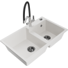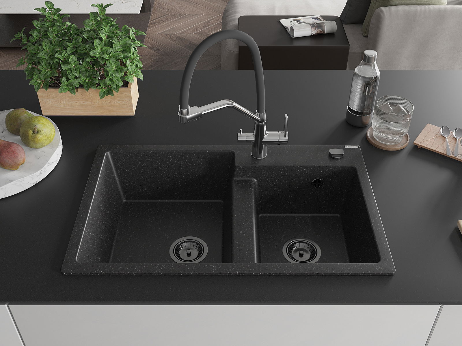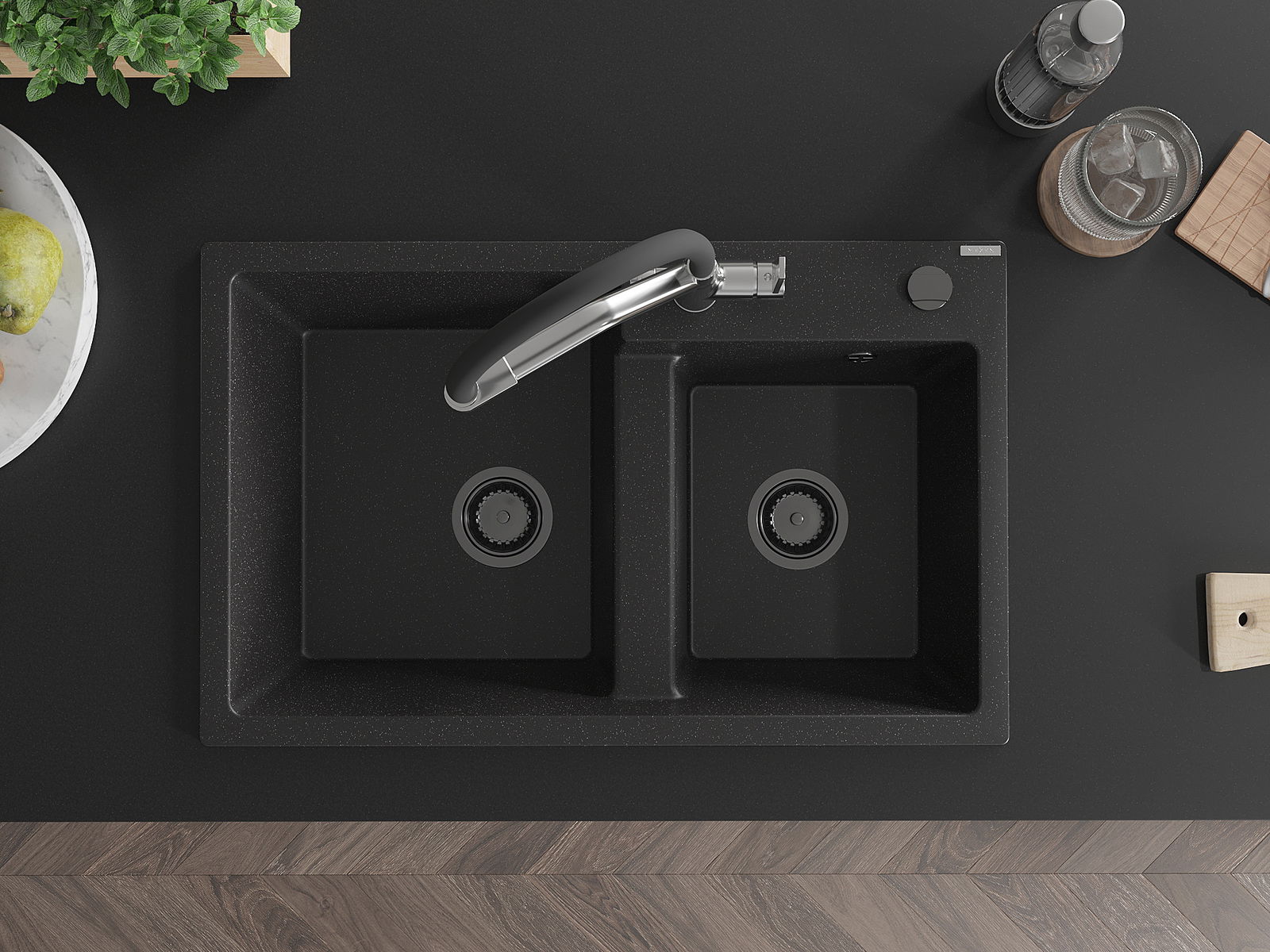 Mexen Tomas žulový kuchynský drez s 2 komorami a kuchynskou batériou Duo, čierny/strieborný metalický - 6516-73-671701-07-B