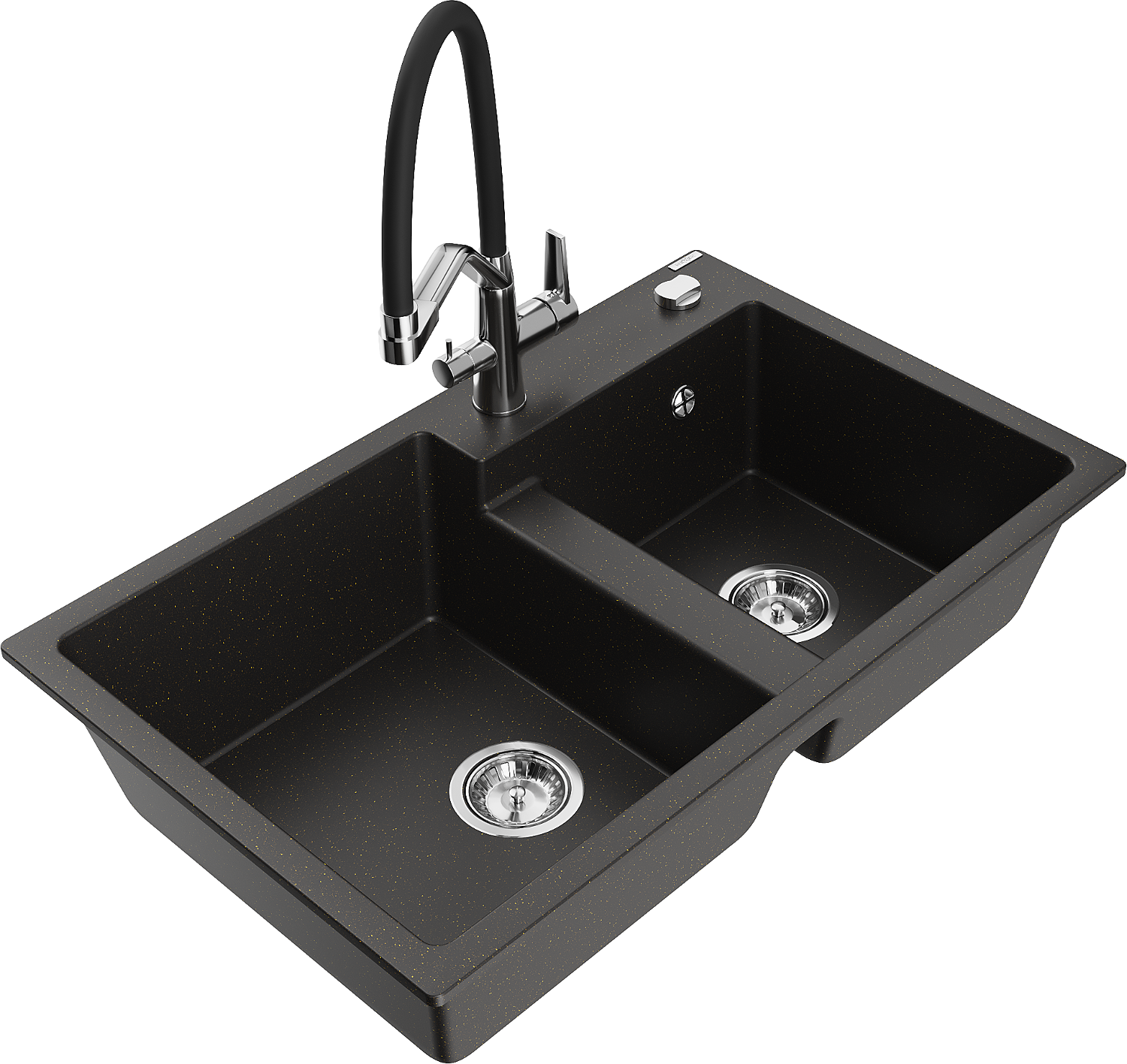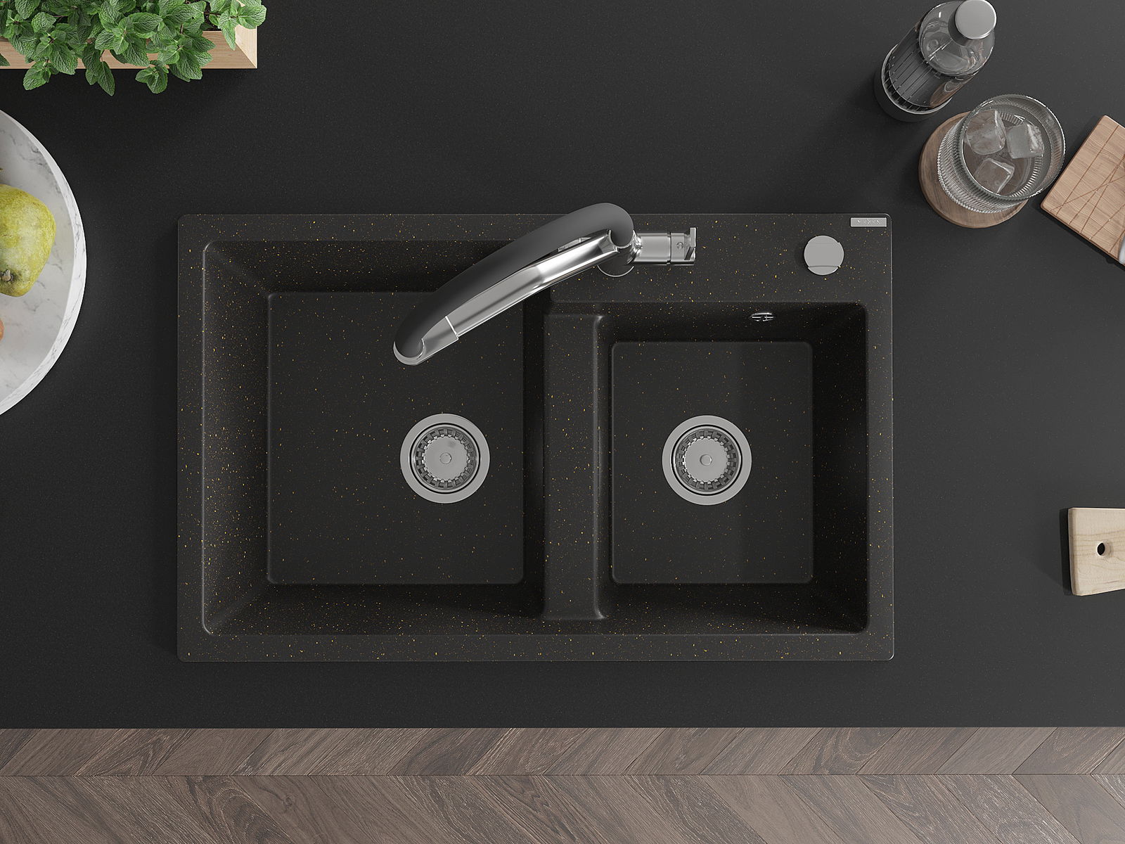 Mexen Tomas drez granitový 2-komorový s kuchynskou batériou Duo, čierny/zlatý metalik - 6516-75-671701-07