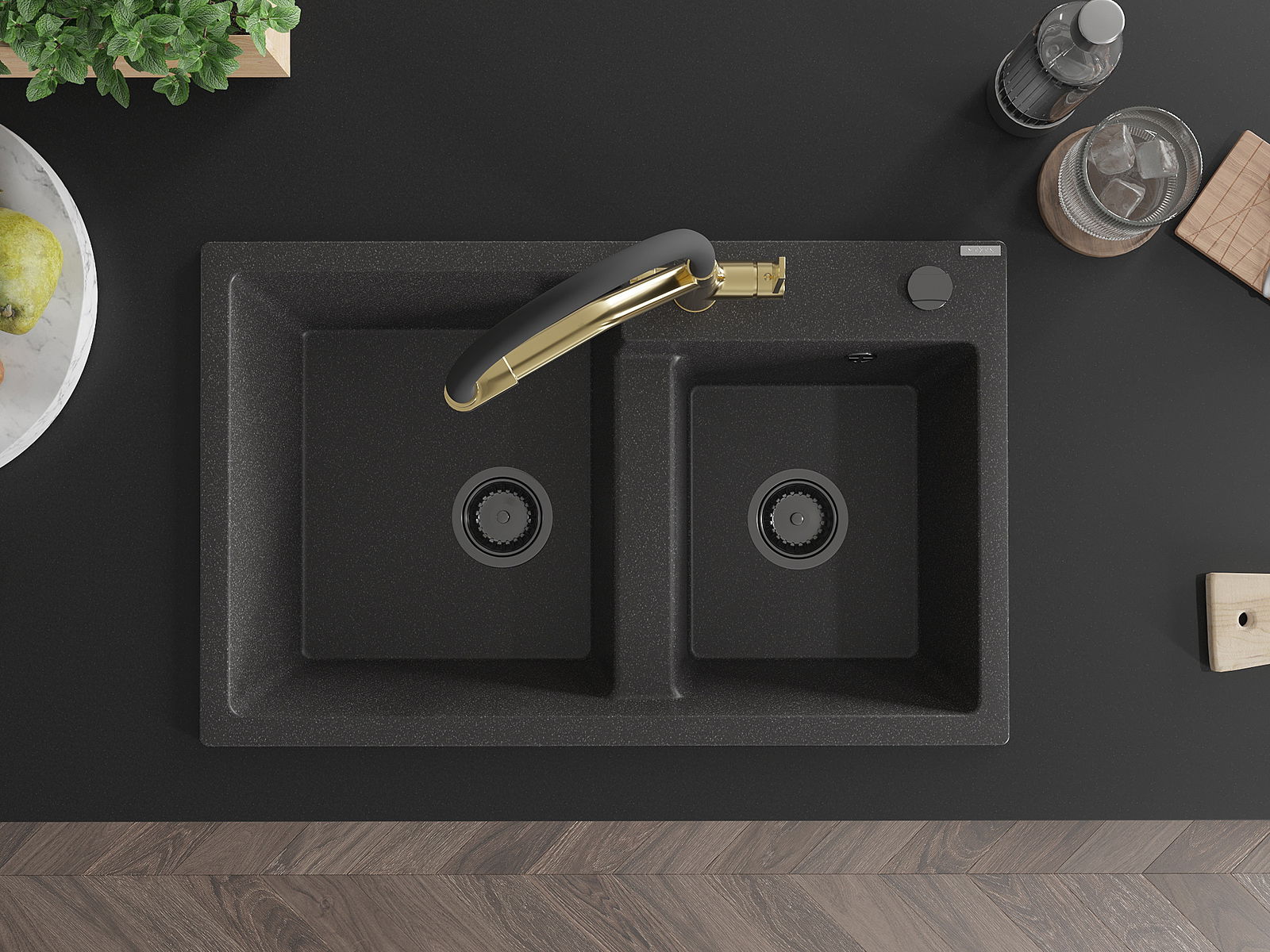 Mexen Tomas žulový drez s 2-komorovým kuchynským batériou Duo, čierny škvrnitý - 6516-76-671701-57-B