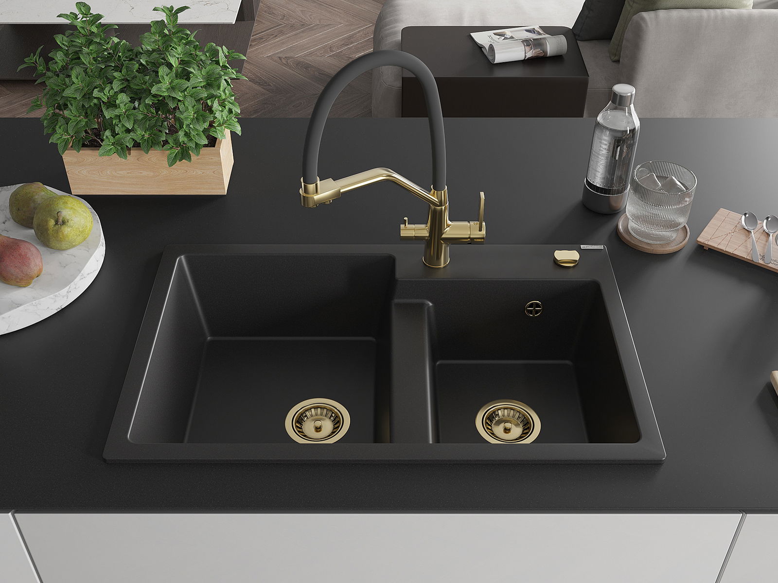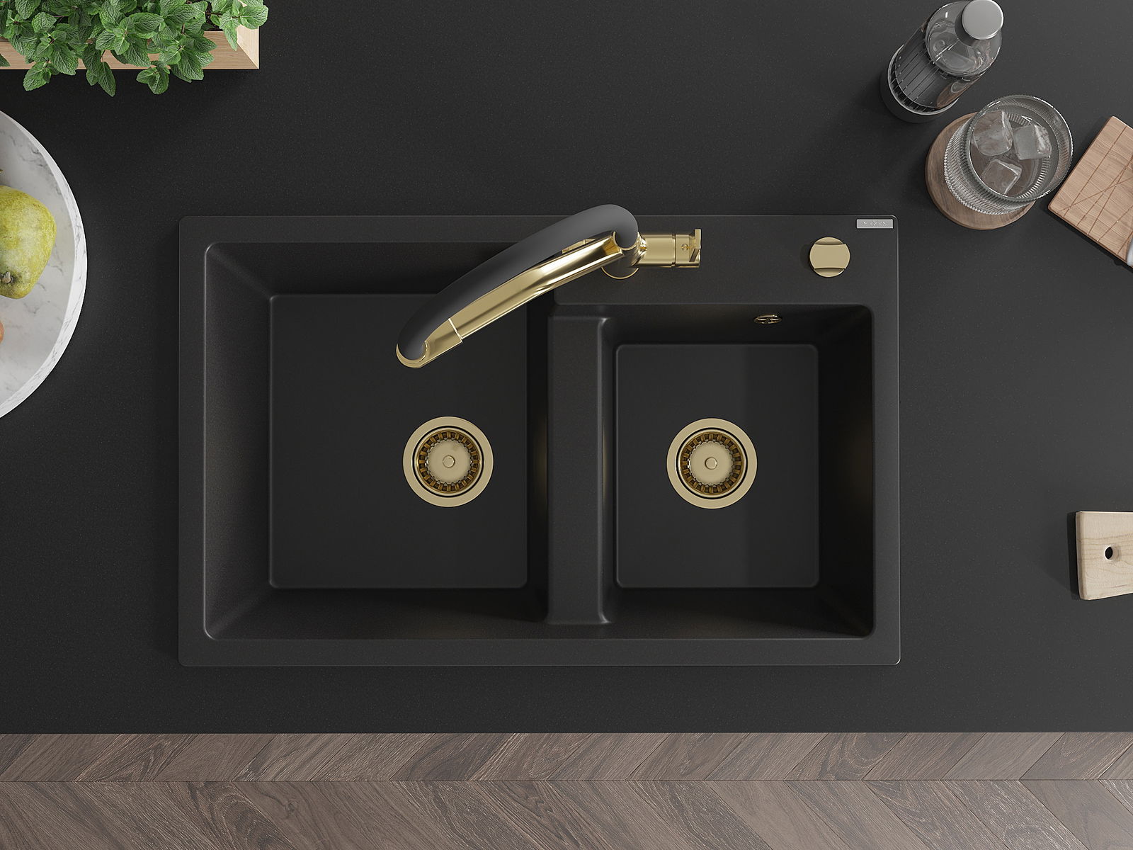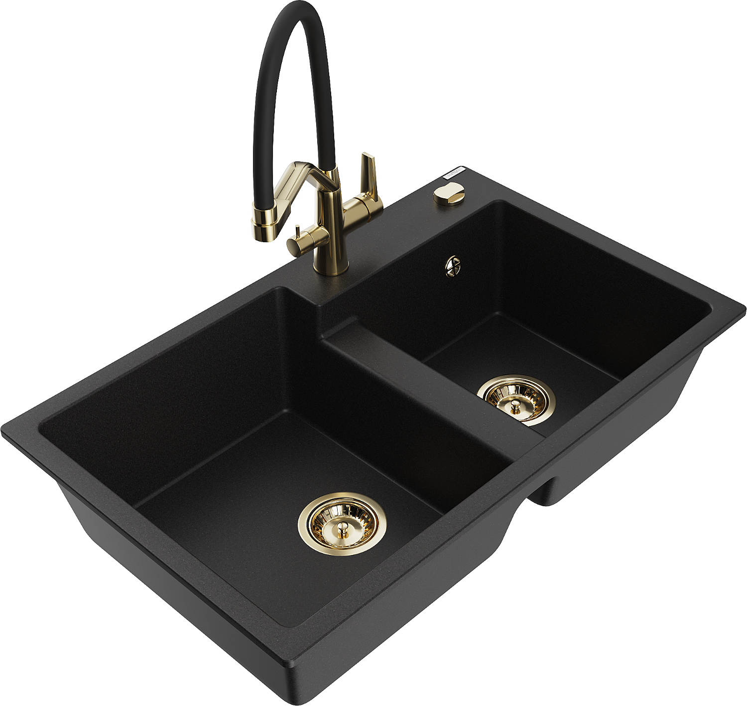 Mexen Tomas dvojkomorový granitový drez s kuchynskou batériou Duo, čierny - 6516-77-671701-57-G