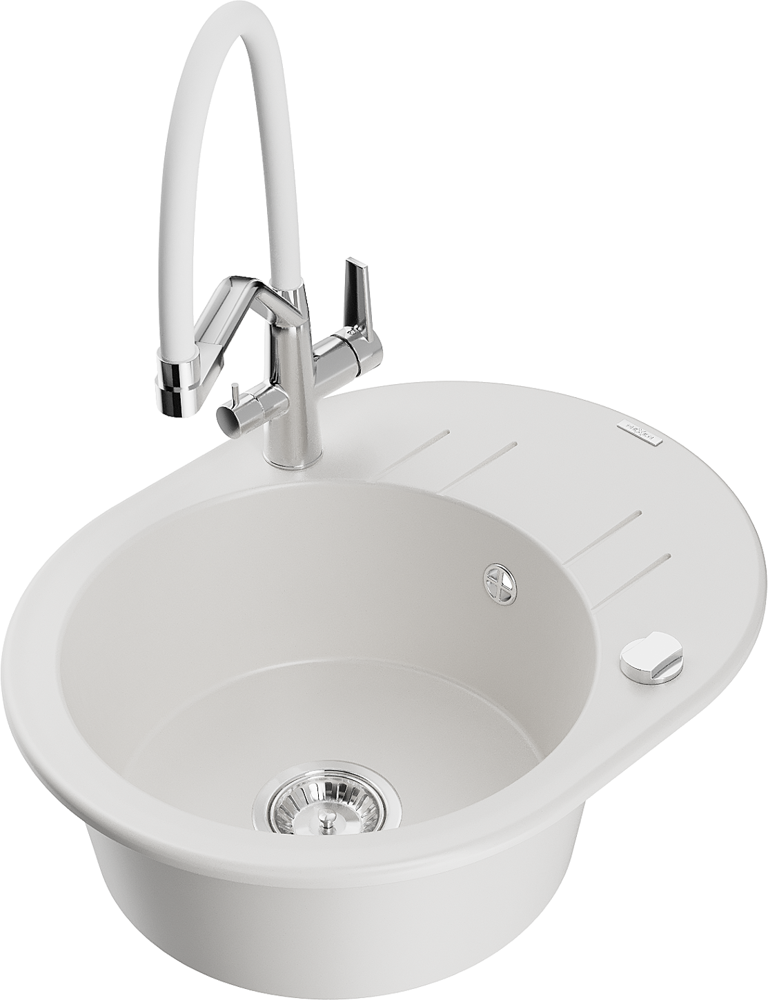 Mexen Kevin granitový drez 1-komorový s kuchynskou batériou Duo, biely - 6517-20-671701-02