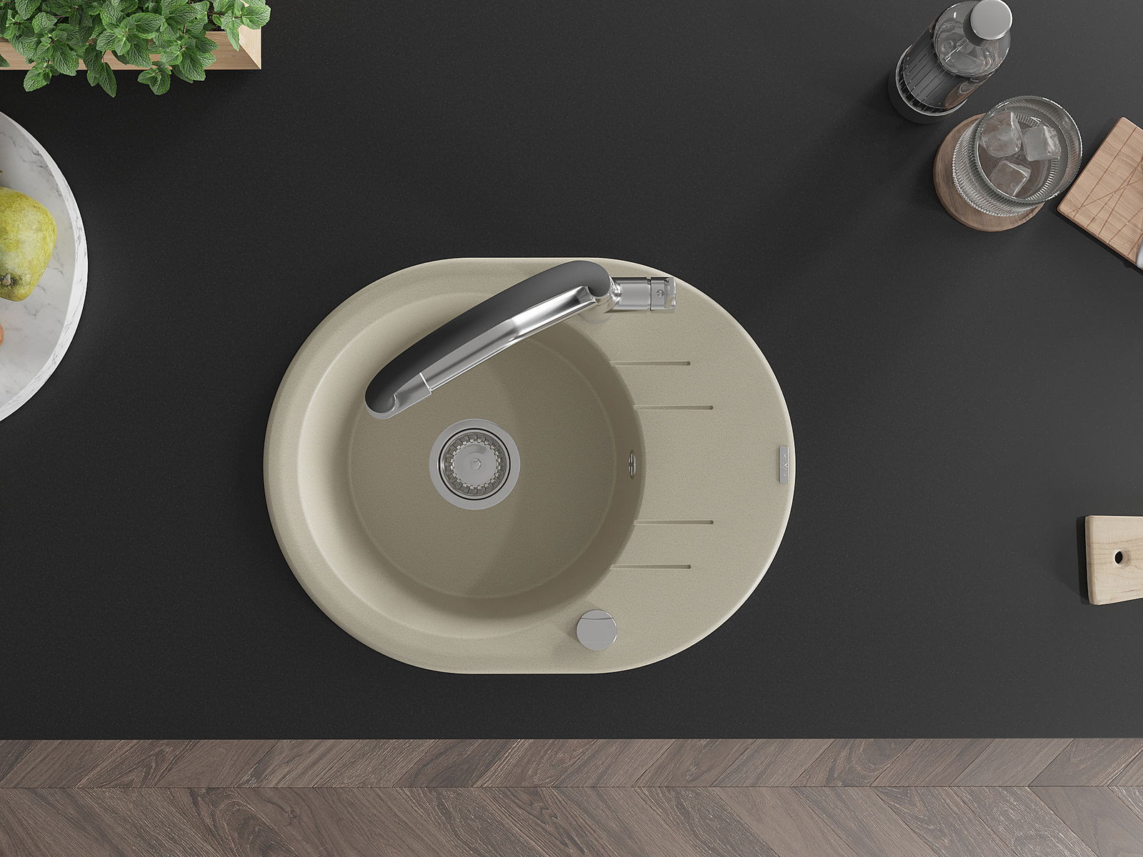 Povrch kuchynského drezu je odolný voči škvrnám a zafarbeniu, vďaka čomu sa ľahko udržiava a zachováva svoju farbu počas dlhého obdobia používania. Estetický a praktický doplnok pre každú kuchyňu.