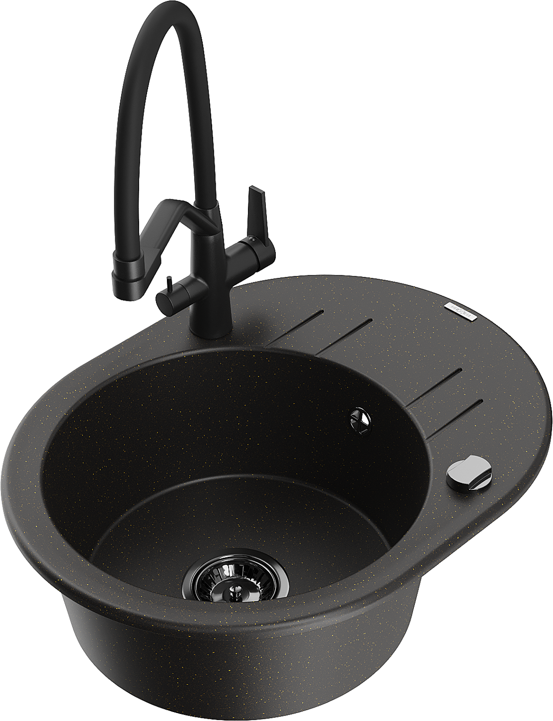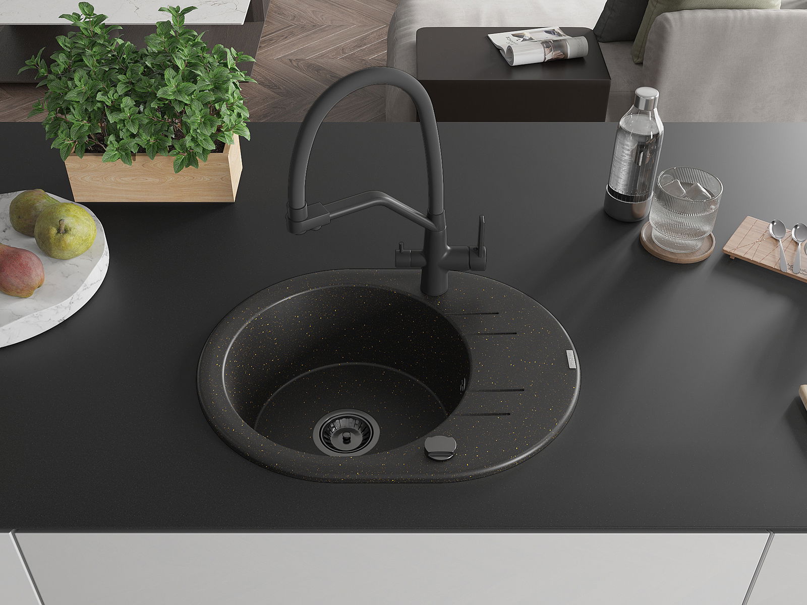 Mexen Kevin granitový drez 1-komorový s kuchynskou batériou Duo, čierny/zlatý metalik - 6517-75-671701-70-B