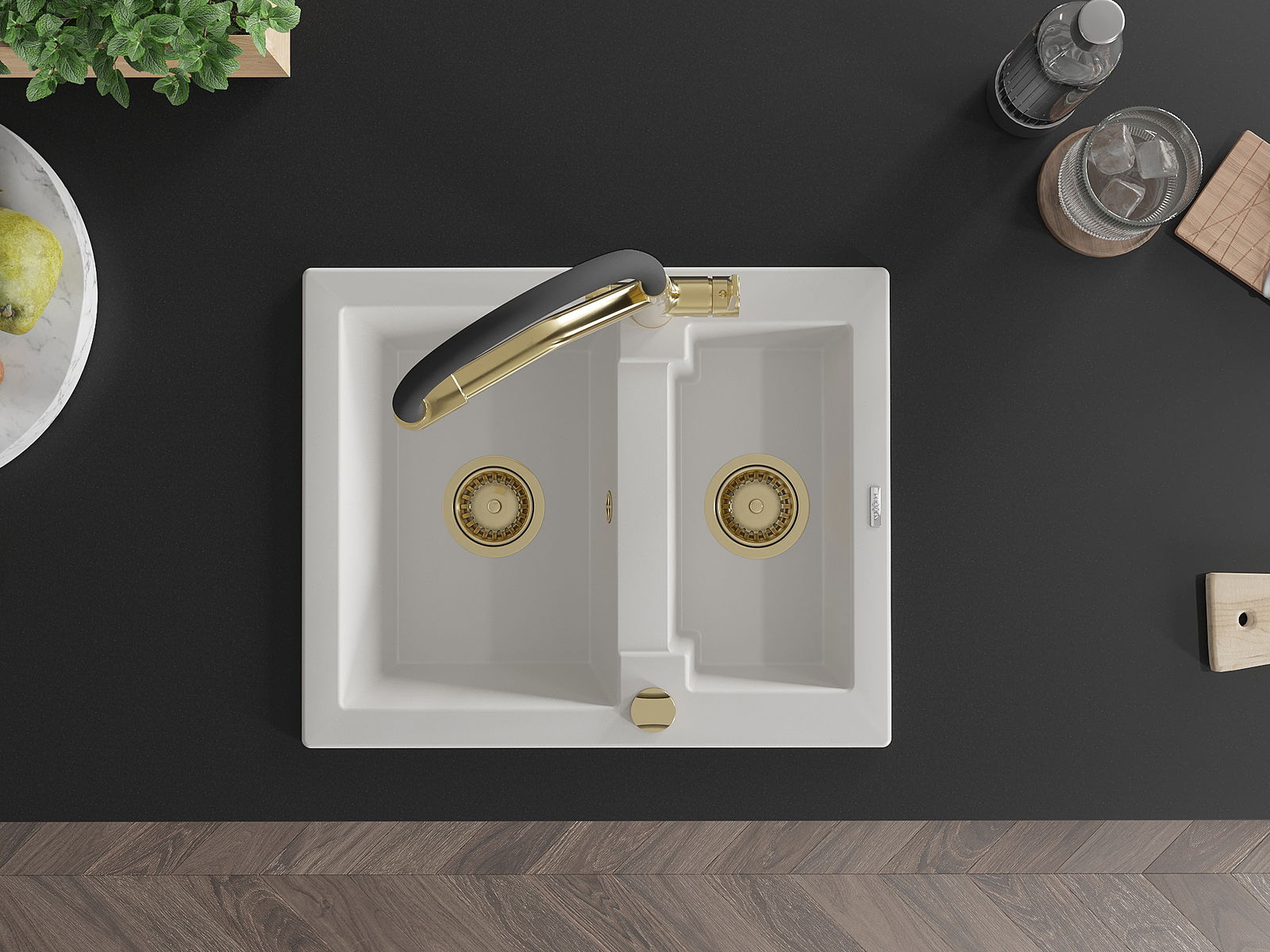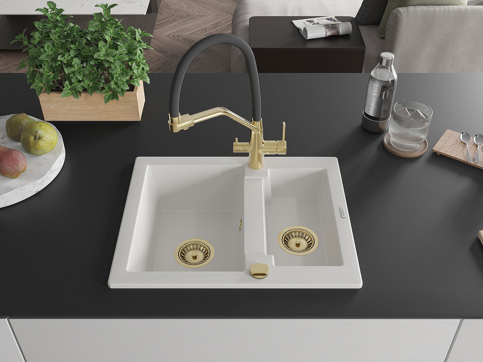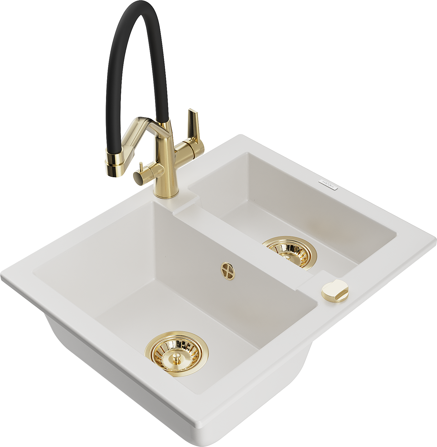 Mexen Carlos žulový drez 1,5-komorový s kuchynskou batériou Duo, biely - 6518-20-671701-57-G