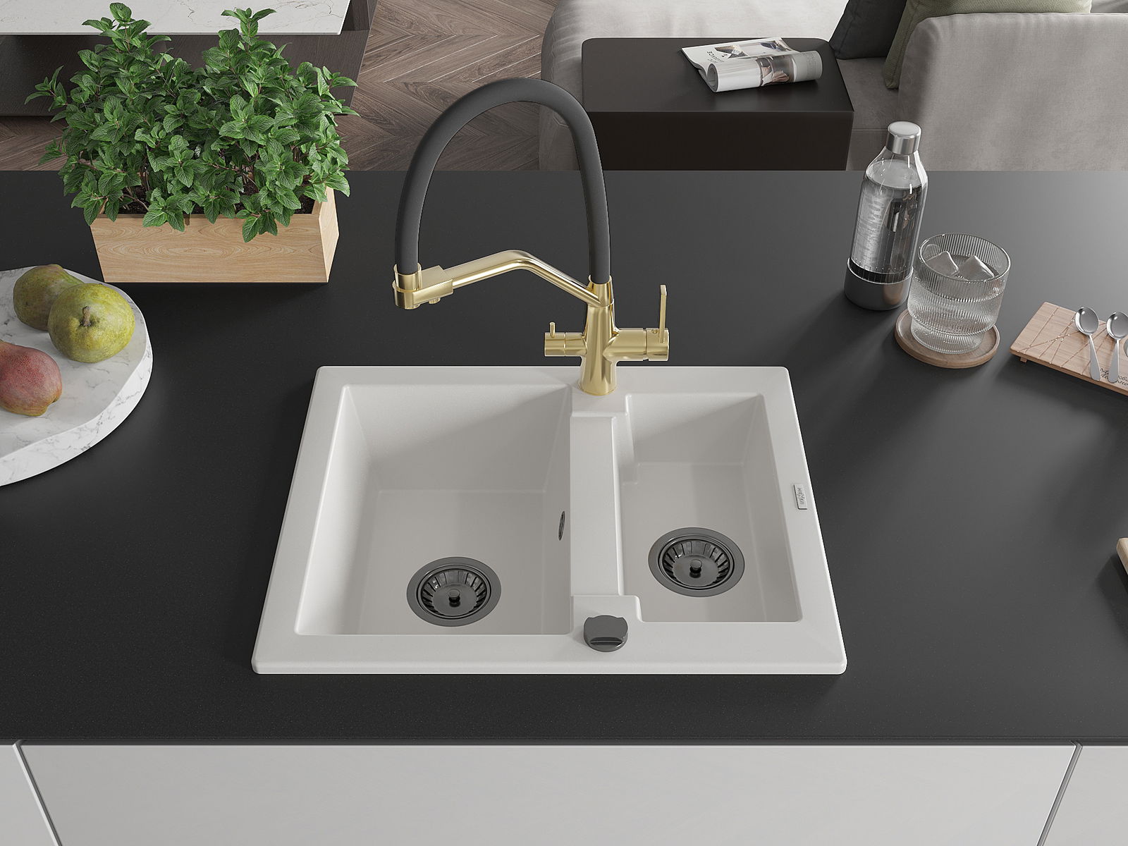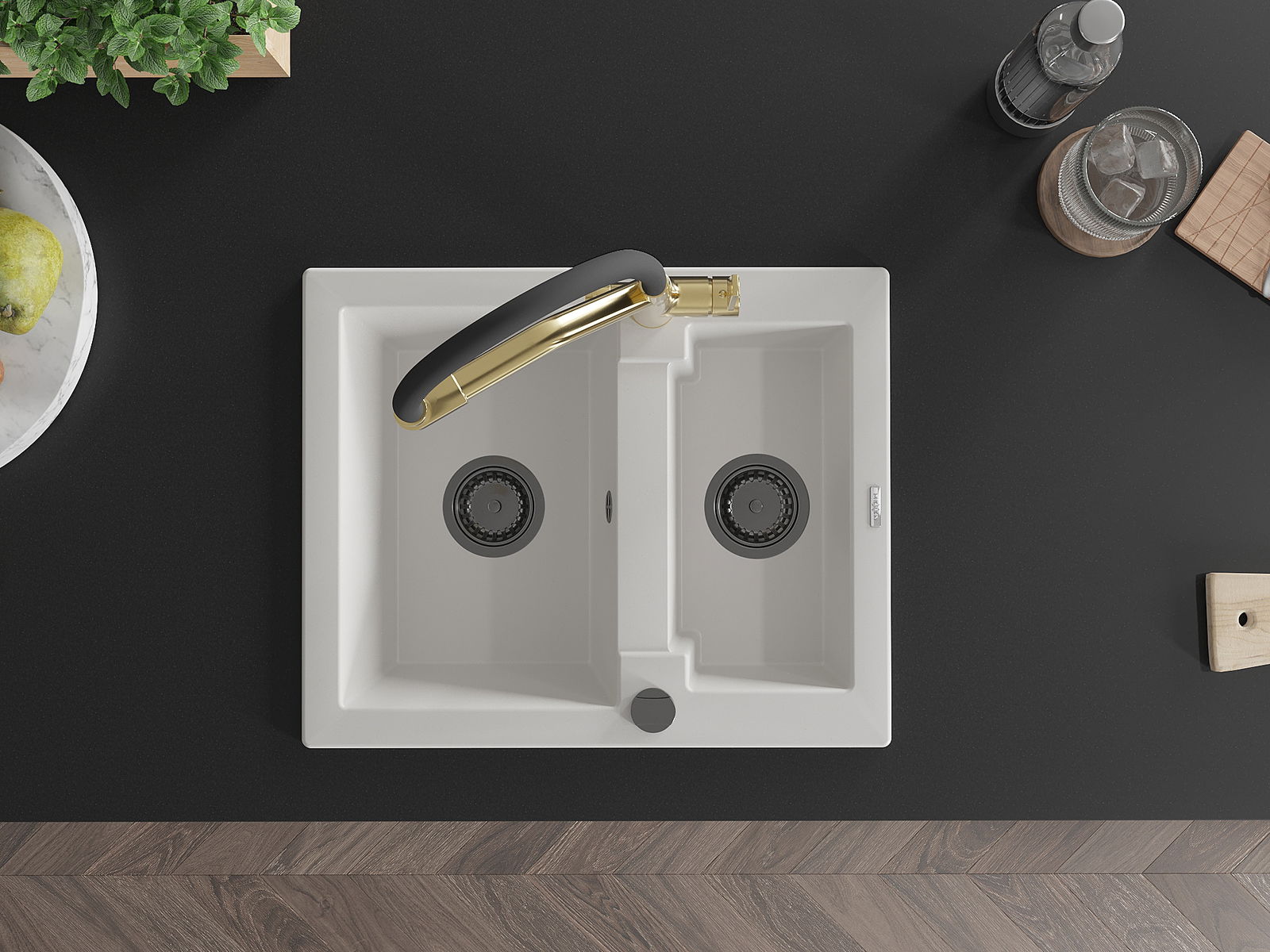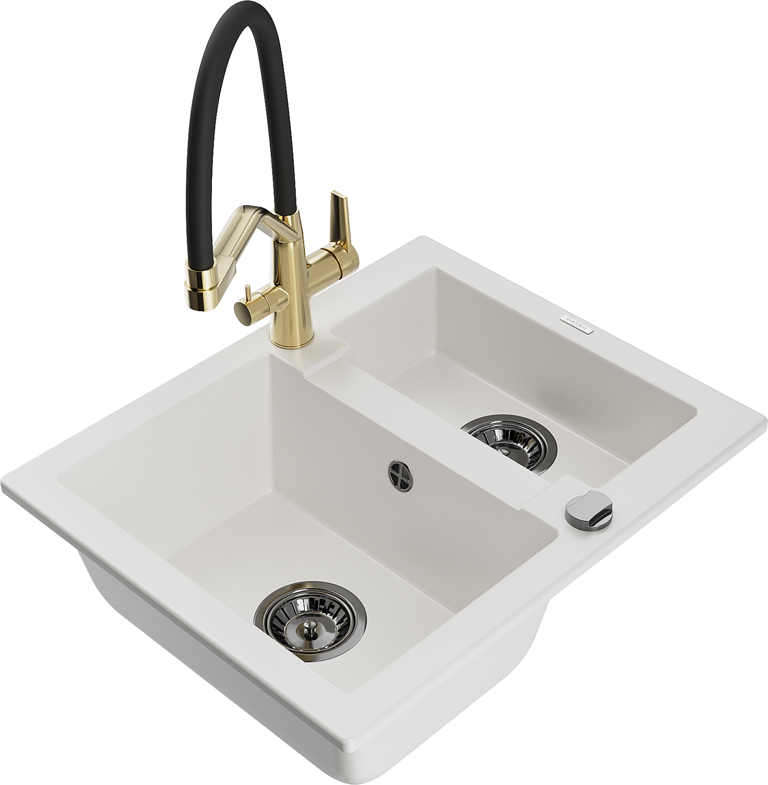 Mexen Carlos granitový kuchynský drez 1,5-komorový s kuchynskou batériou Duo, biela - 6518-20-671701-57-B
