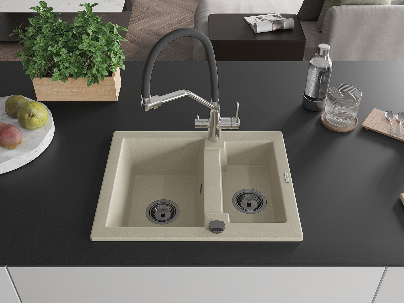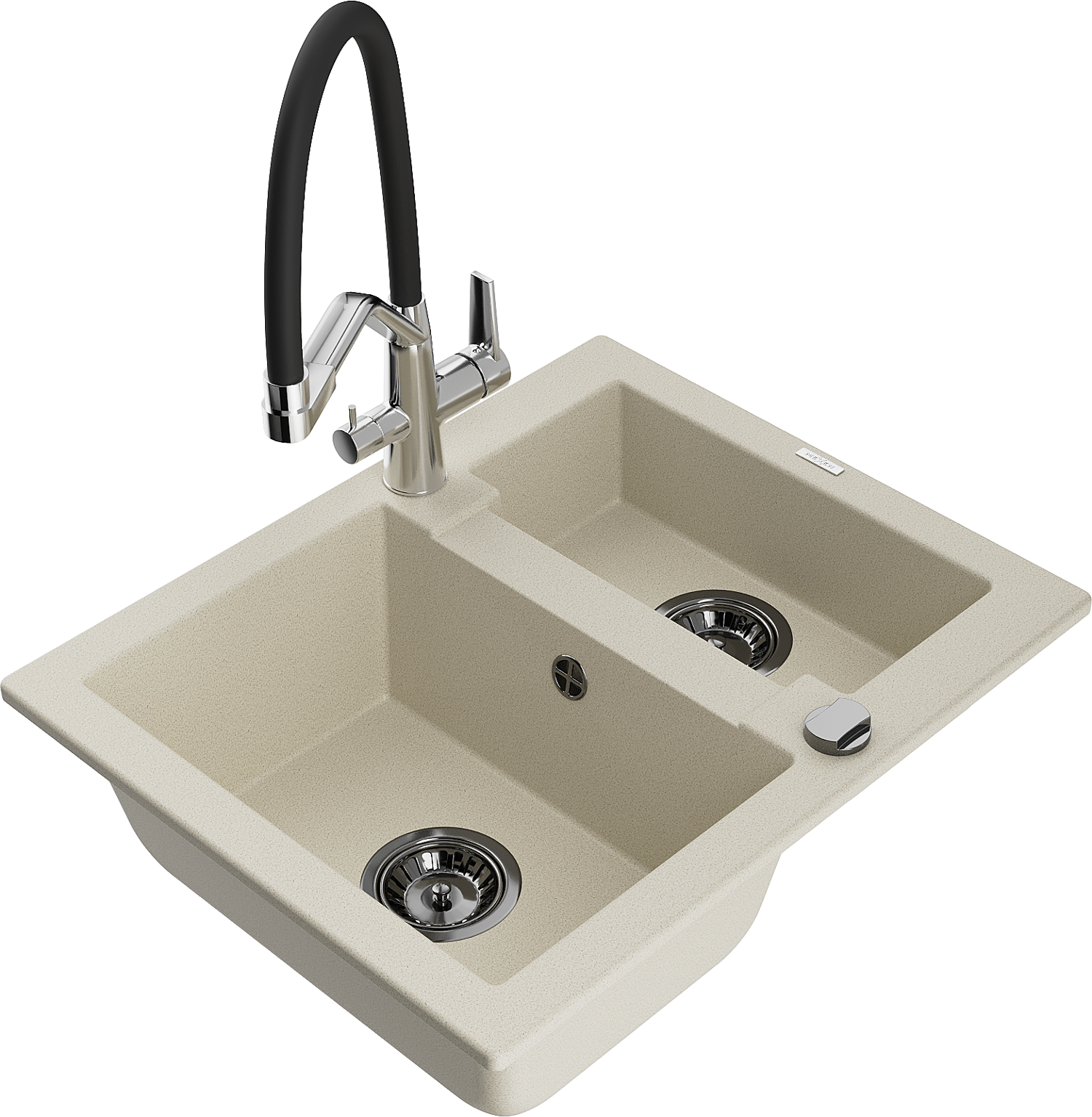 Mexen Carlos granitový drez 1,5-komorový s kuchynskou batériou Duo, béžový - 6518-69-671701-07-B