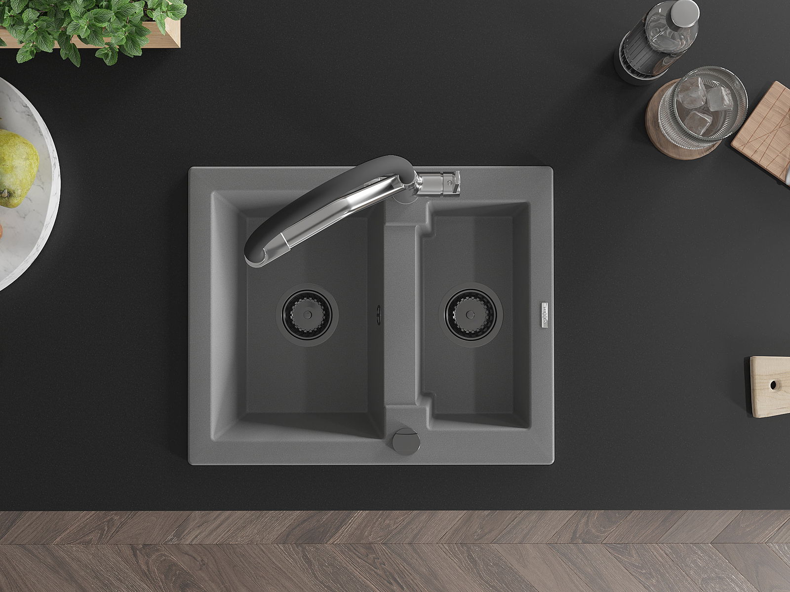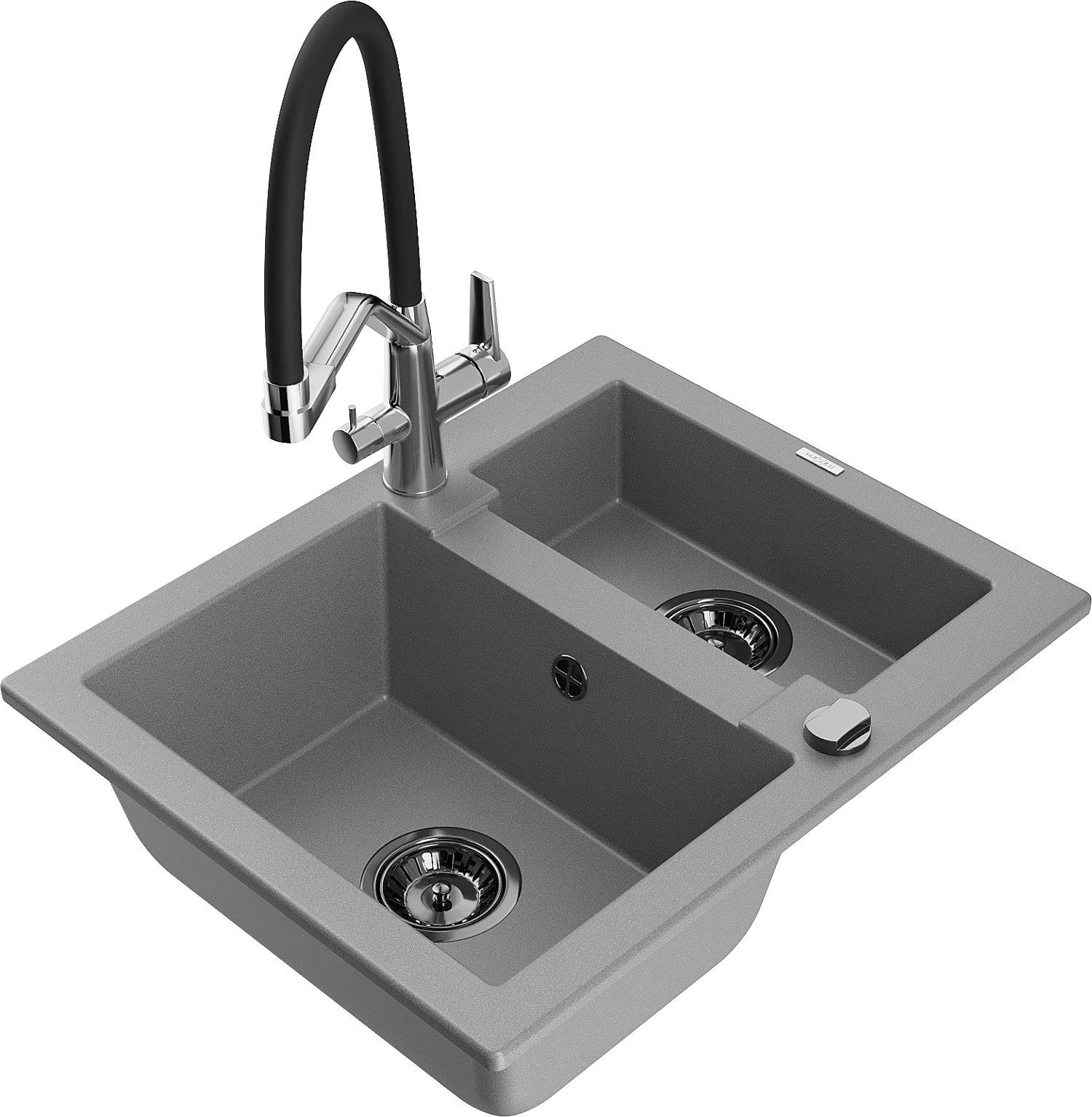 Mexen Carlos žulový drez 1,5-komorový s kuchynskou batériou Duo, sivý - 6518-71-671701-07-B