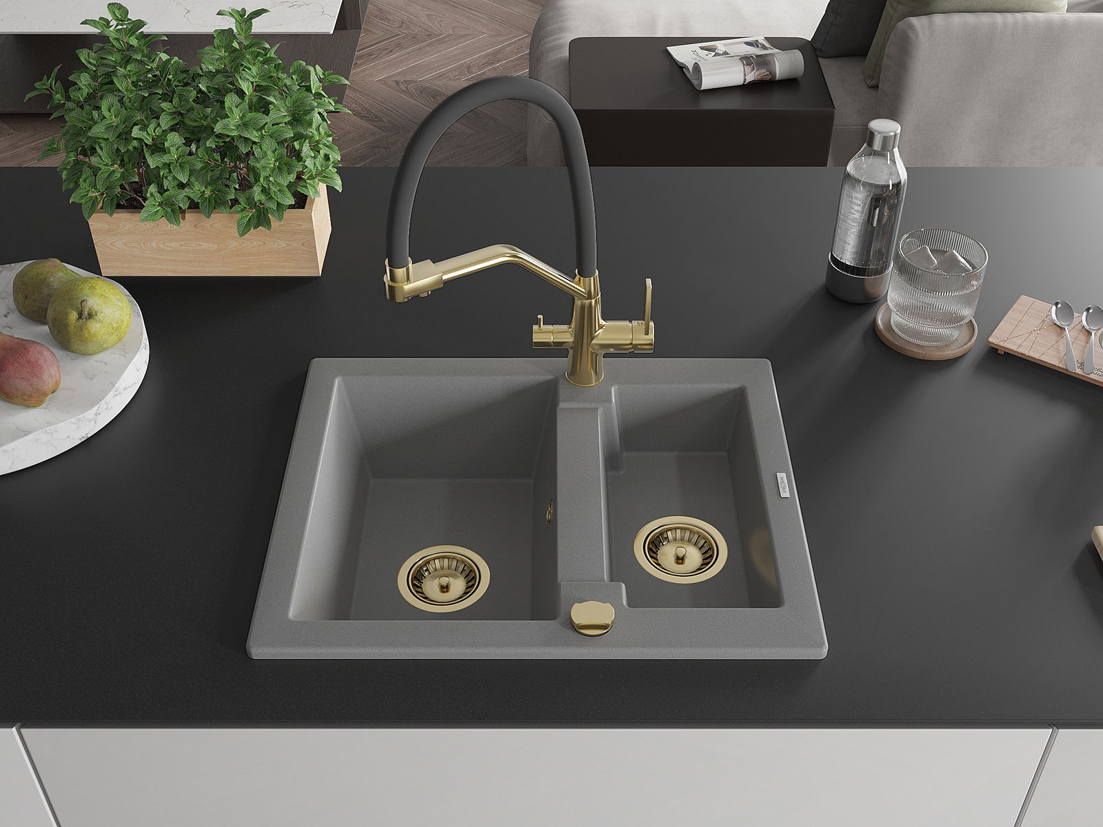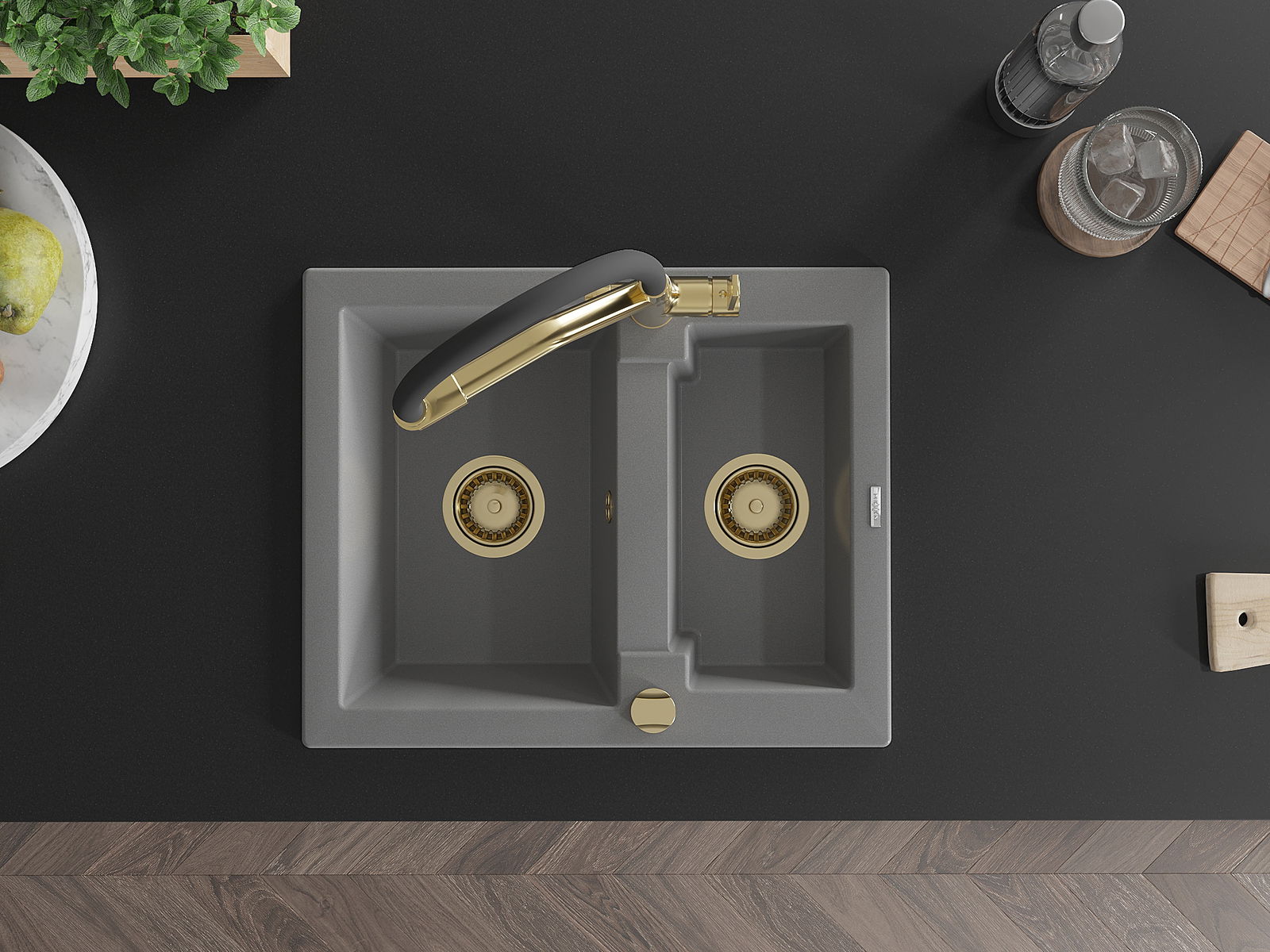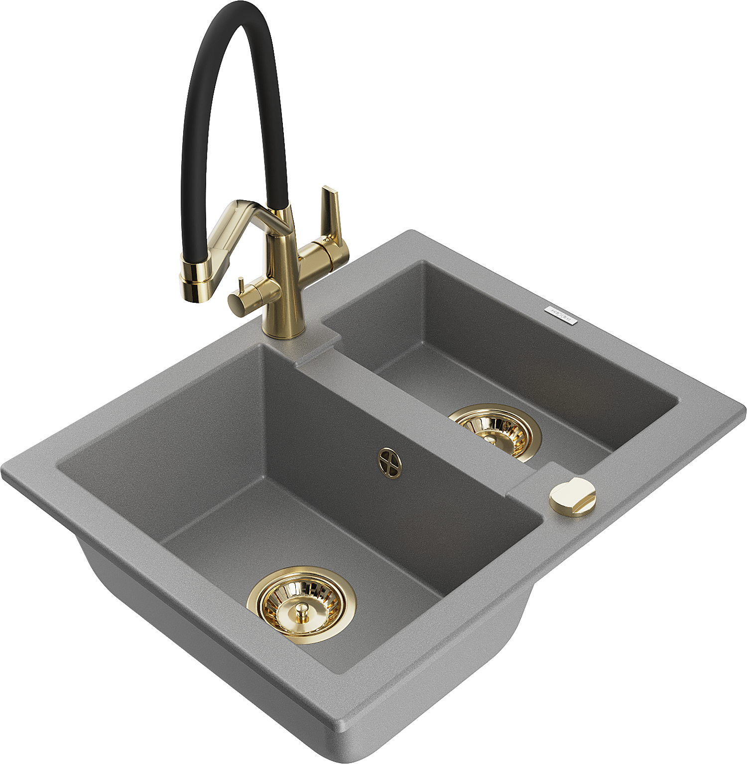 Mexen Carlos žulový kuchynský drez s 1,5 komorou a kuchynskou batériou Duo, sivý - 6518-71-671701-57-G
