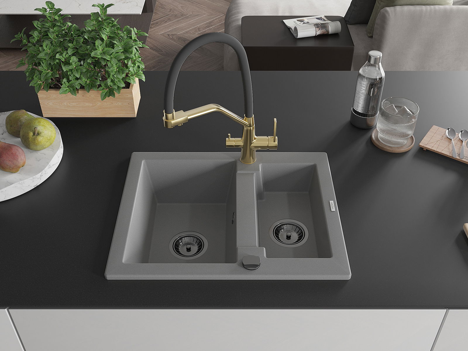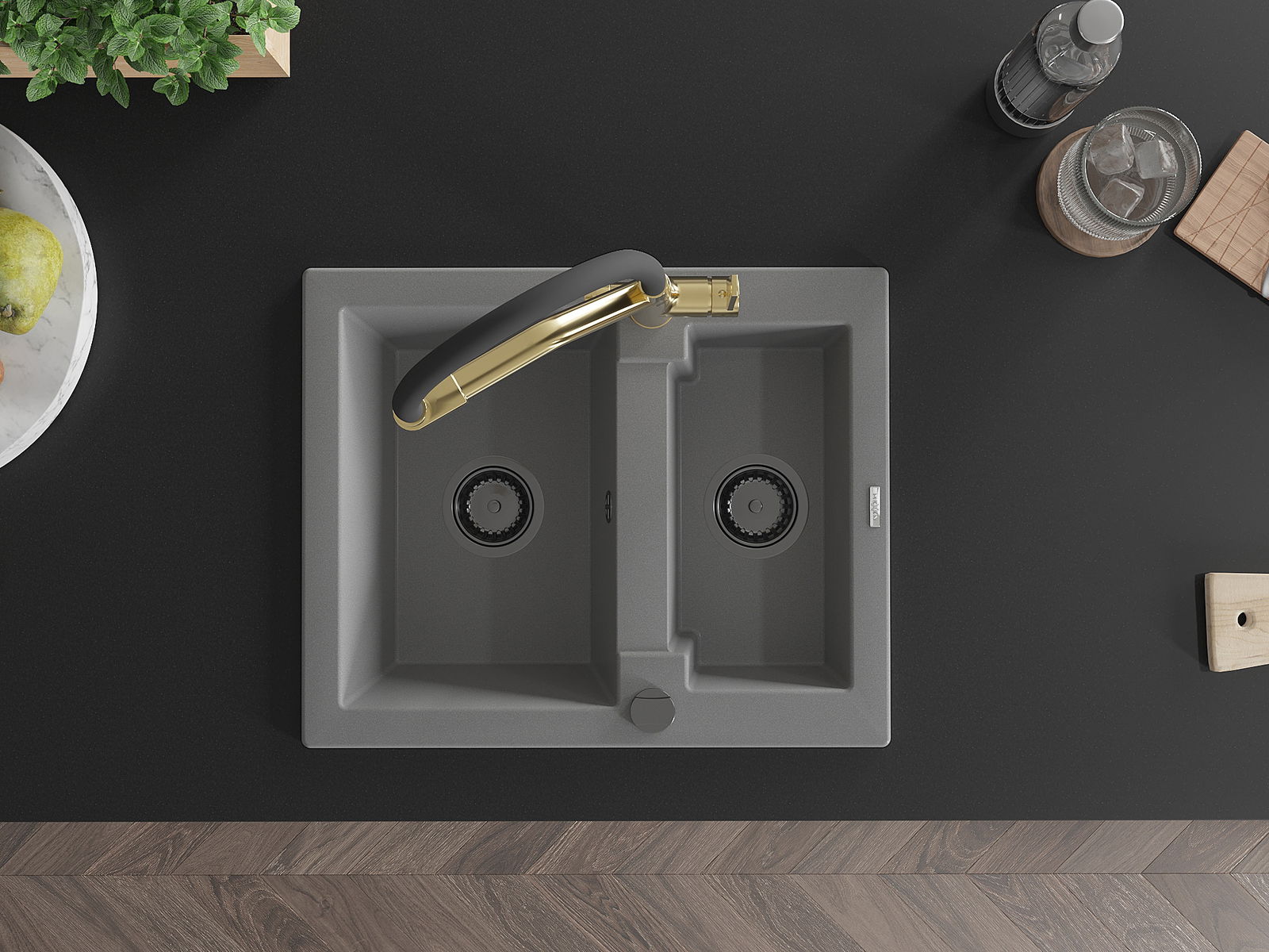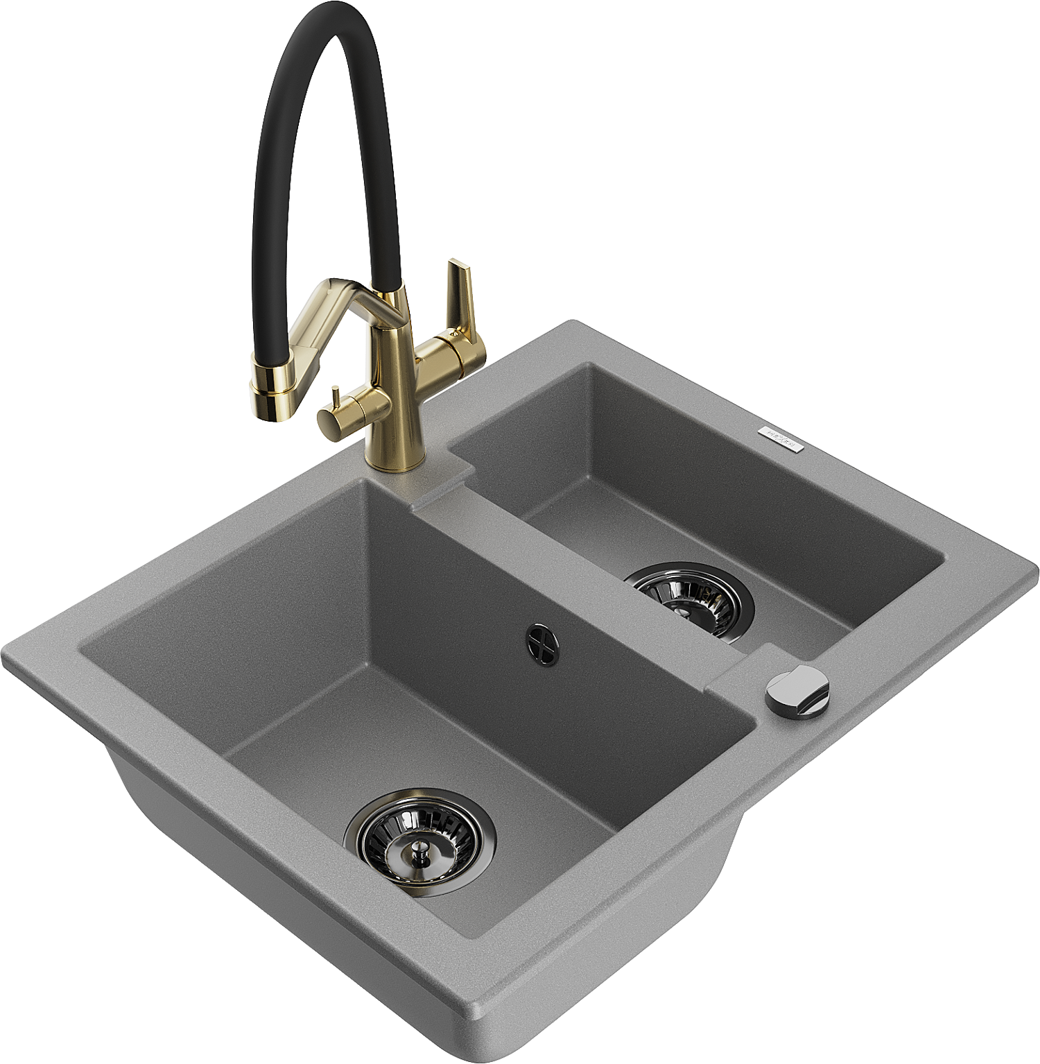 Mexen Carlos žulový drez 1,5-komorový s kuchynskou batériou Duo, sivý - 6518-71-671701-57-B