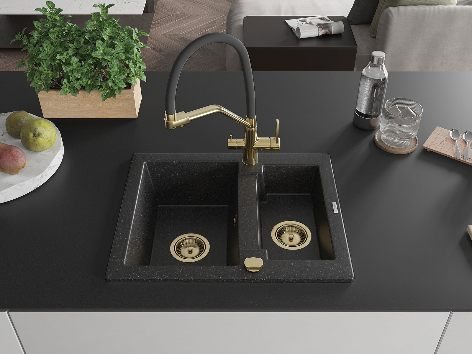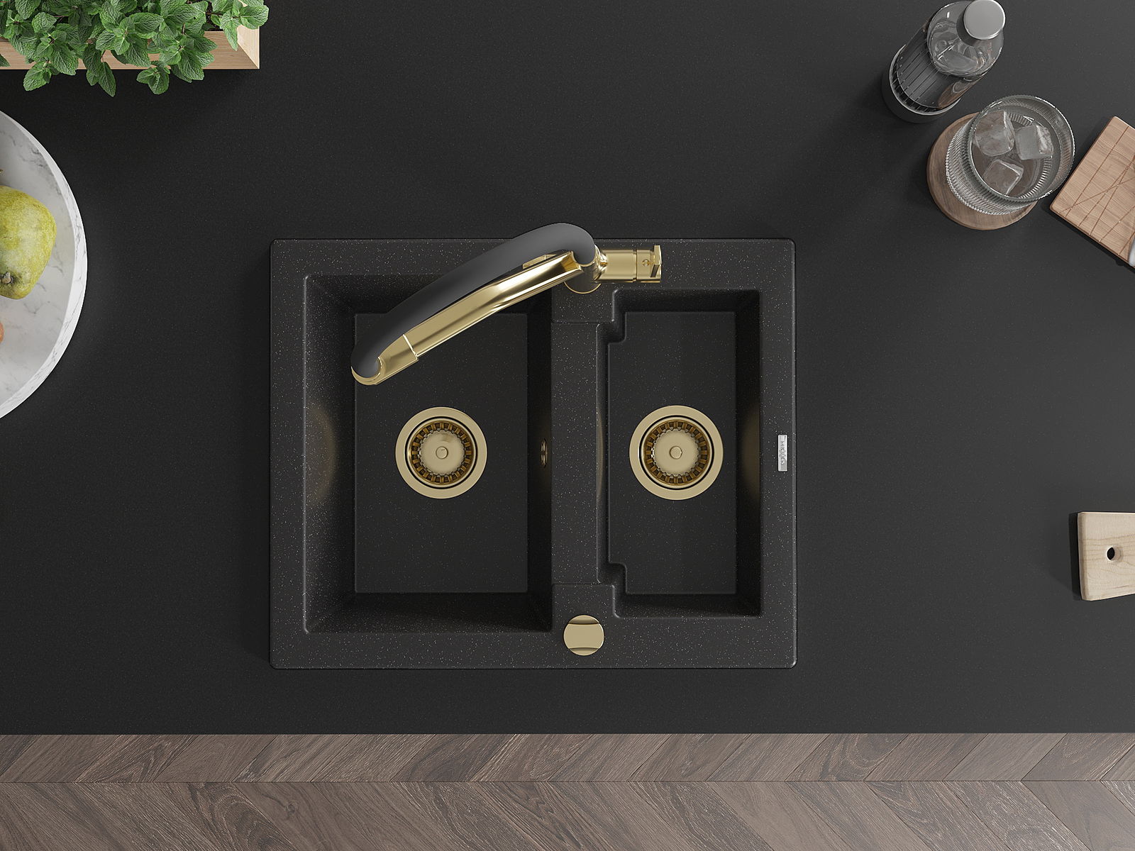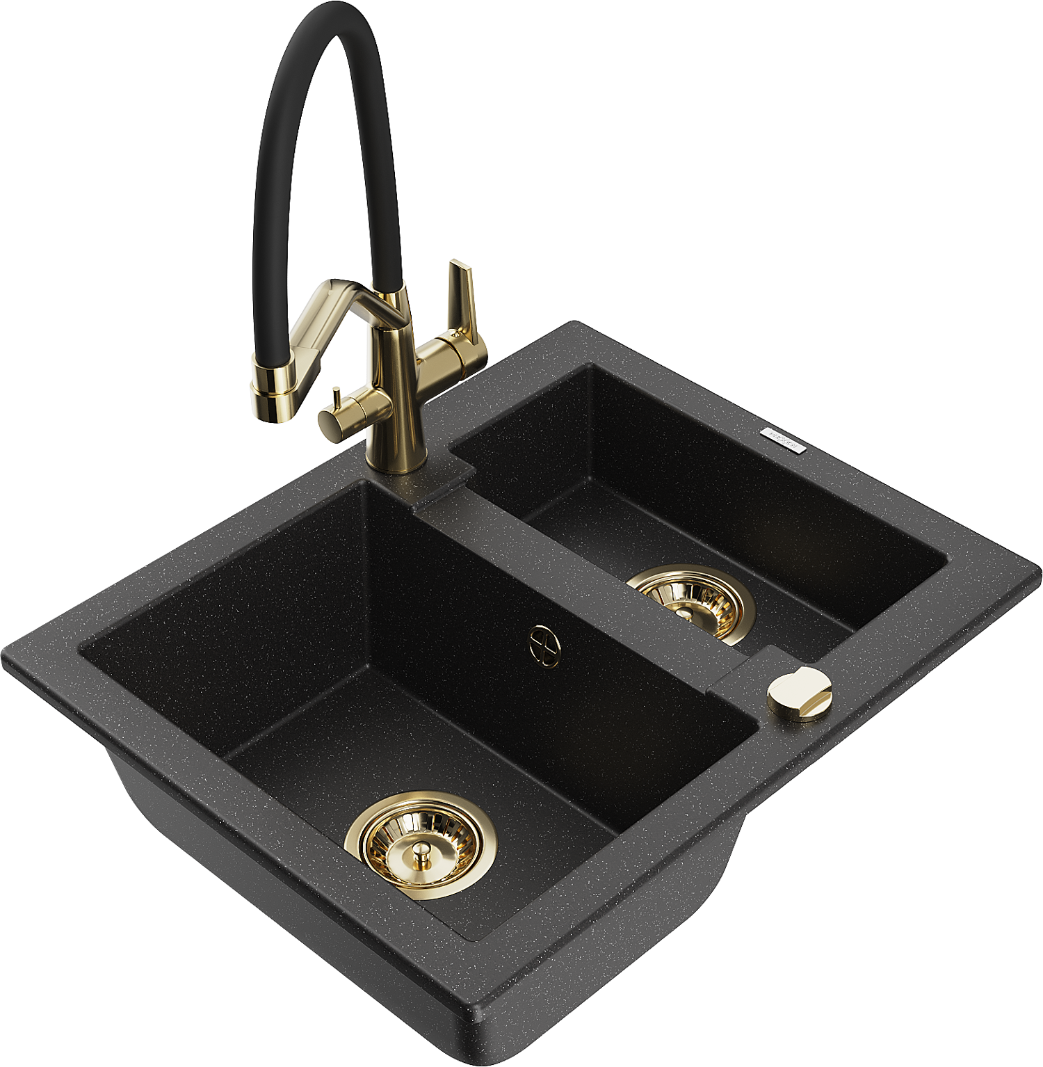 Mexen Carlos žulový drez 1,5-komorový s kuchynskou batériou Duo, čierno/strieborný metalik - 6518-73-671701-57-G