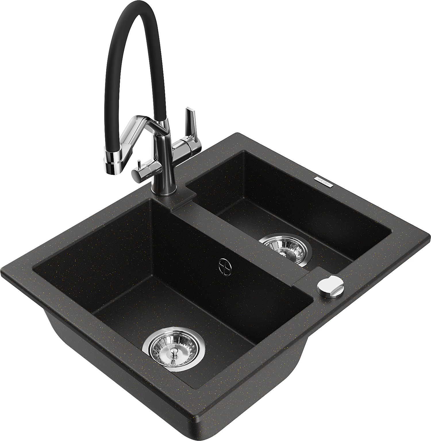 Mexen Carlos žulový drez 1,5-komorový s kuchynskou batériou Duo, čierny/zlatý metalický - 6518-75-671701-07